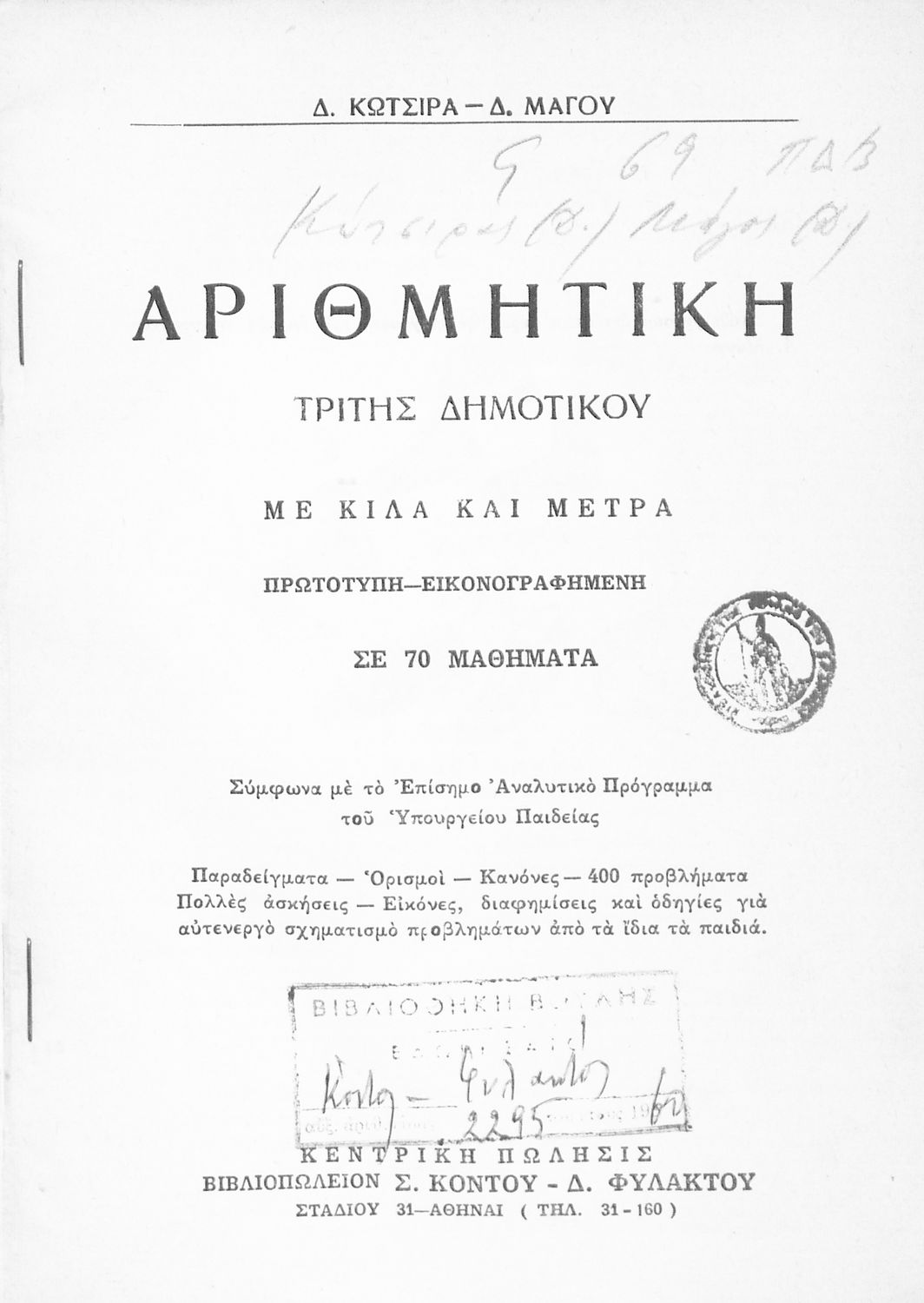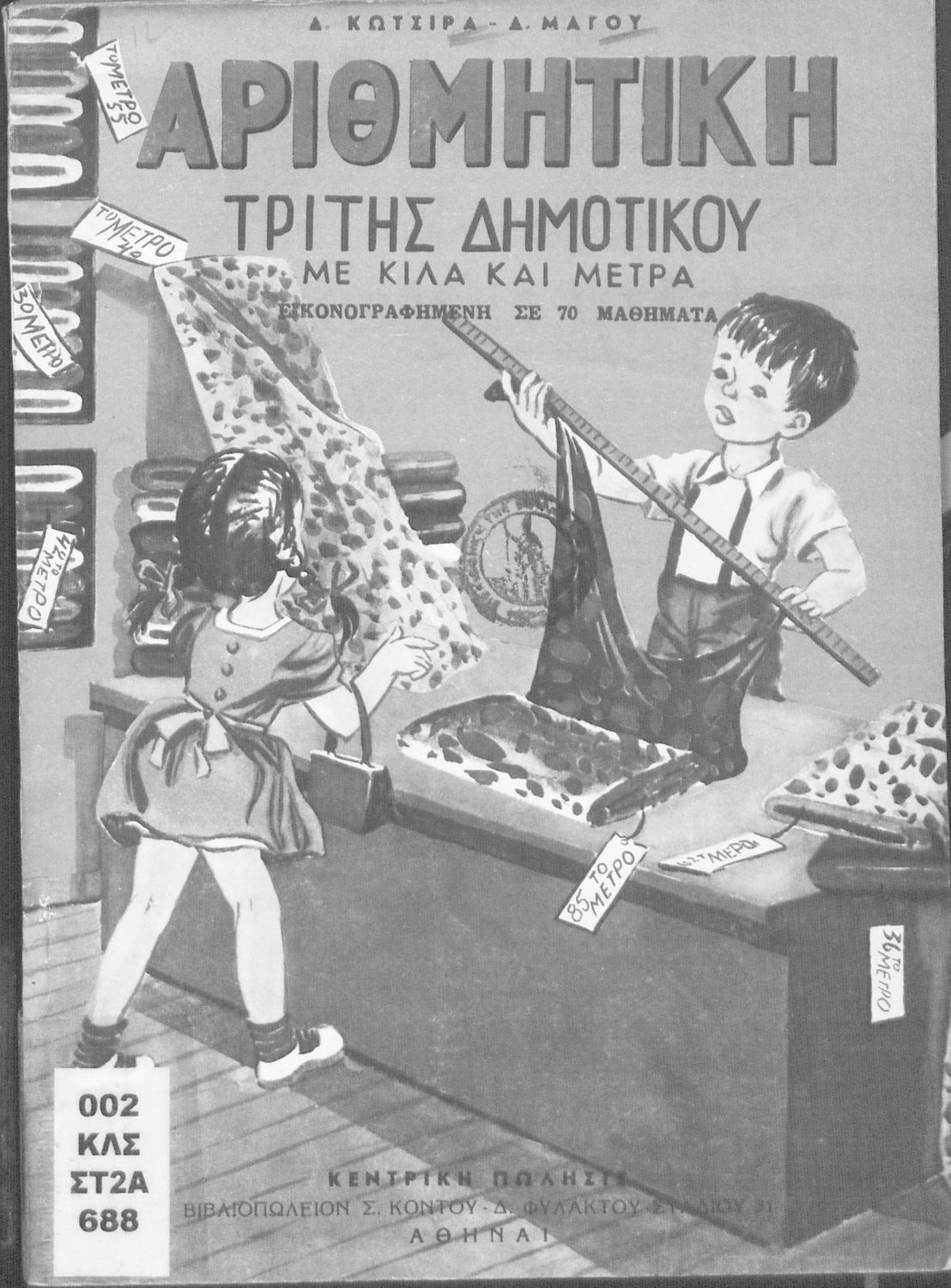 Σχολικό εγχειρίδιο Μαθηματικών Γ ' Δημοτικού που περιλαμβάνει στοιχεία αριθμητικής ακέραιων και κλασματικών αριθμών και παρουσιάζει τα κυριότερα γεωμετρικά σχήματα και τους τρόπους υπολογισμού των στοιχείων ...
