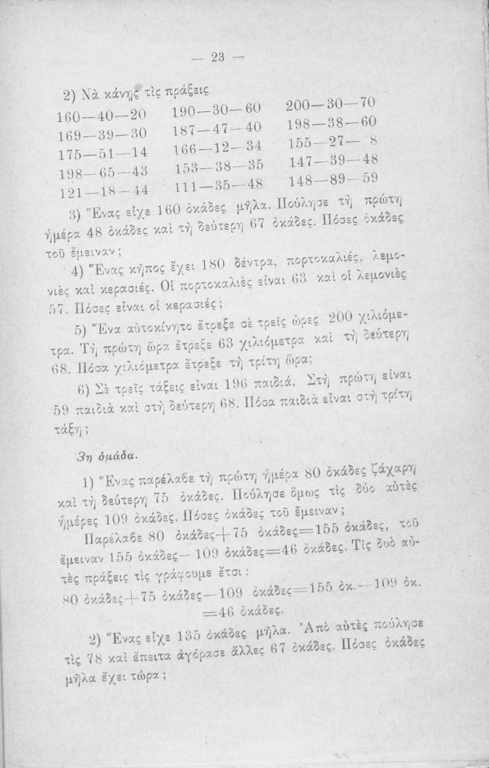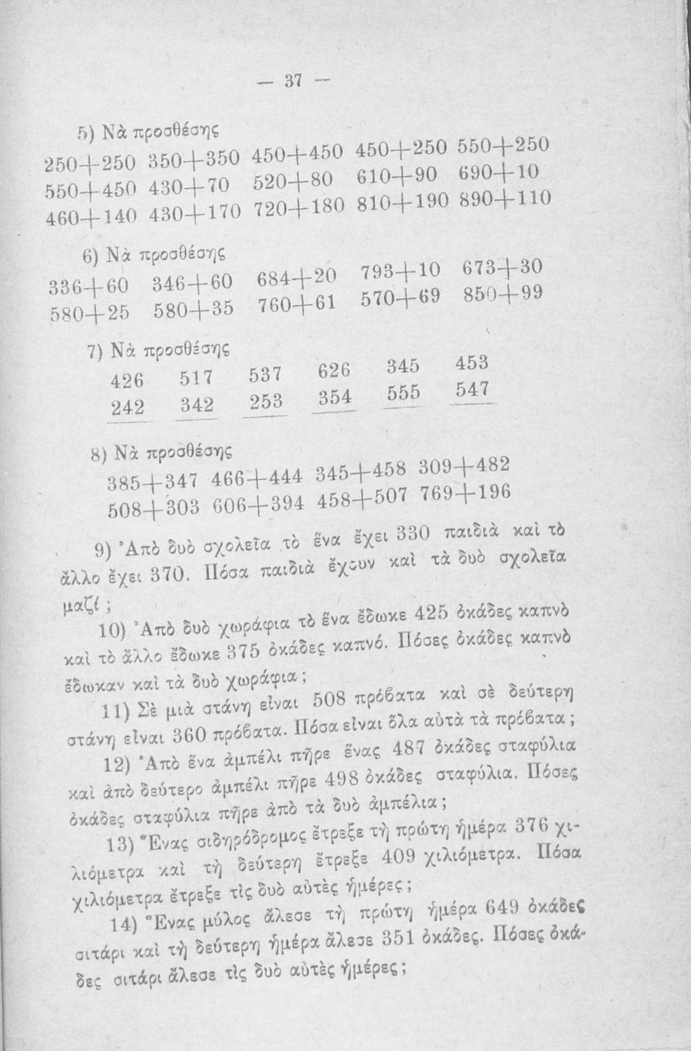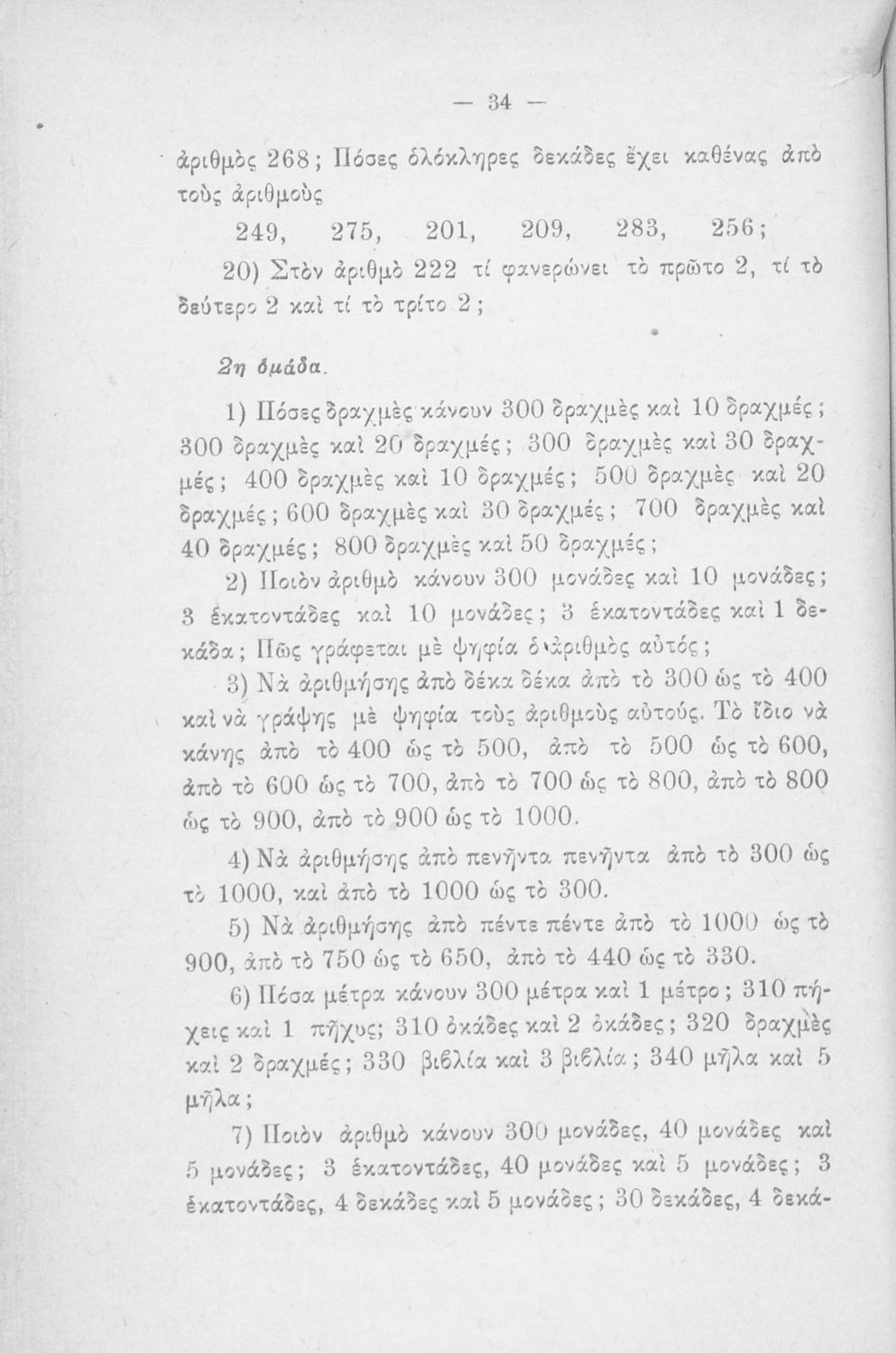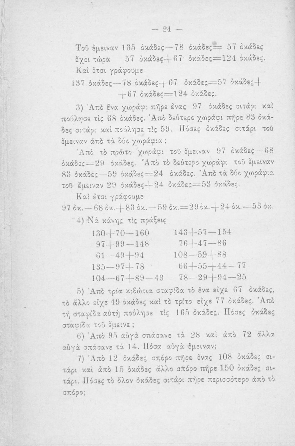 Βαθμίδα εκπαίδευσης: Πρωτοβάθμια Τάξη: Γ' Δημοτικού Μάθημα: Μαθηματικά Γλώσσα: Δημοτική Παρουσίαση περιεχομένου: Μαθητικό βοήθημα Μαθηματικών Γ΄ Δημοτικού που περιλαμβάνει αριθμητικά προβλήματα με τις 4 βασικές πράξεις, τις δεκάδες και εκατοντάδες, και ασκήσεις κατανόησης. |