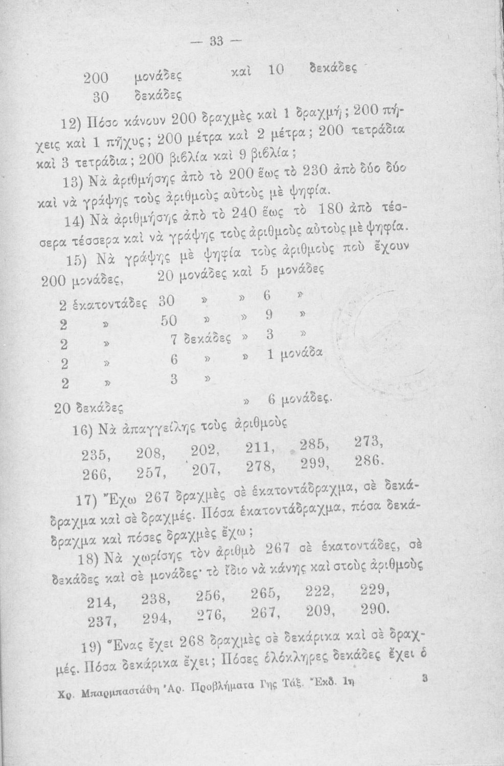 Κωδικός αναγνώρισης: 03-20560606 Τίτλος: Αριθμητικά προβλήματα προς χρήσιν των μαθητών της Γ΄ τάξεως των Δημοτικών Σχολείων Συγγραφέας: Χρίστος Α. Μπαρμπαστάθης Μέγεθος και υπόστρωμα: Μαθητικό βοήθημα, 22εκ., μαλακό εξώφυλλο, 54 σελίδες. |