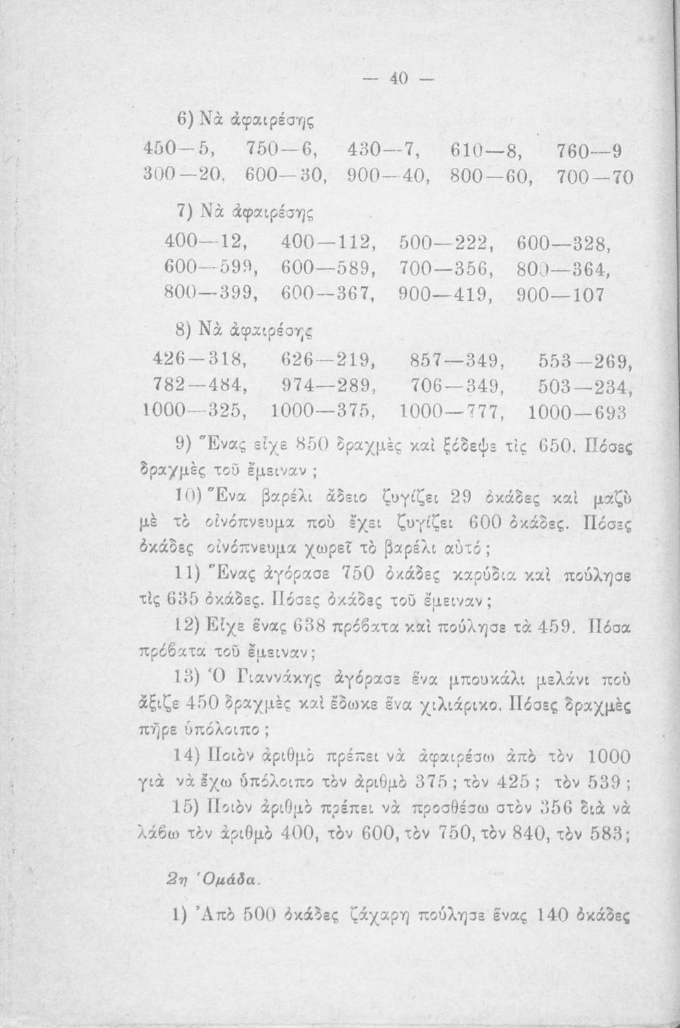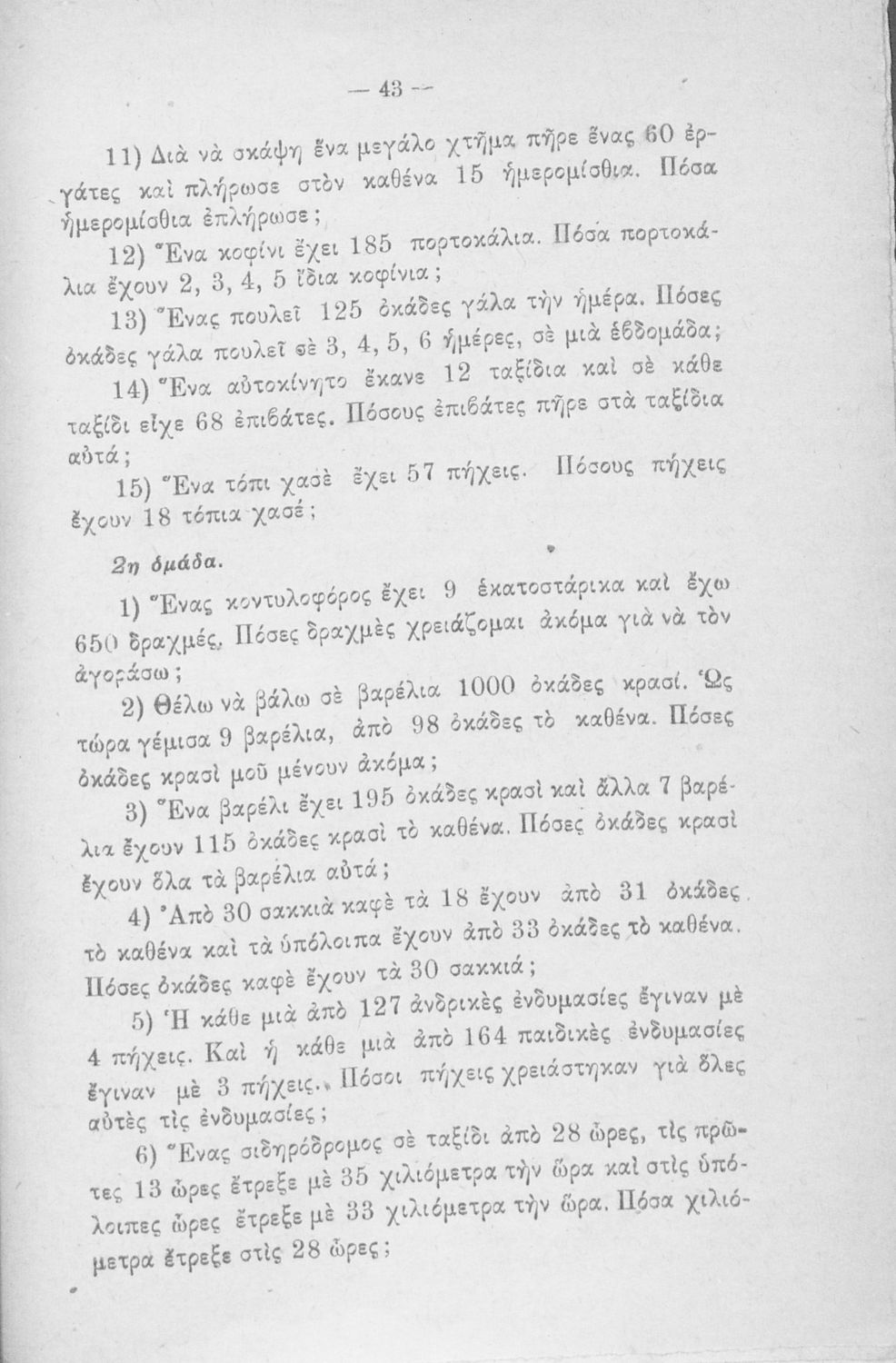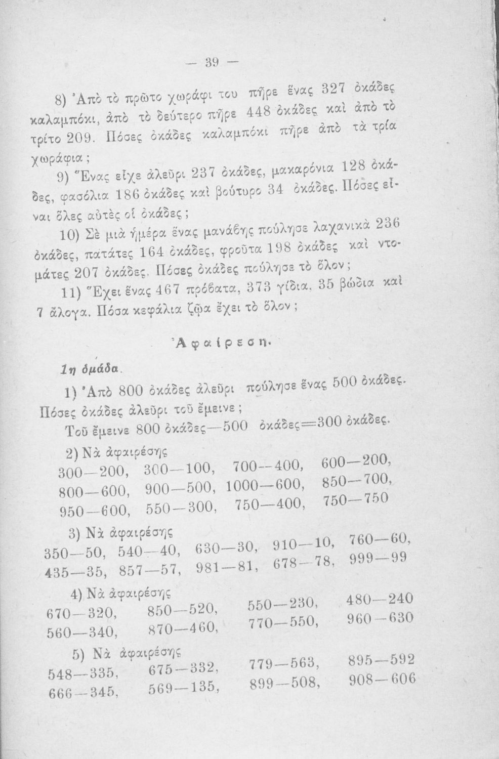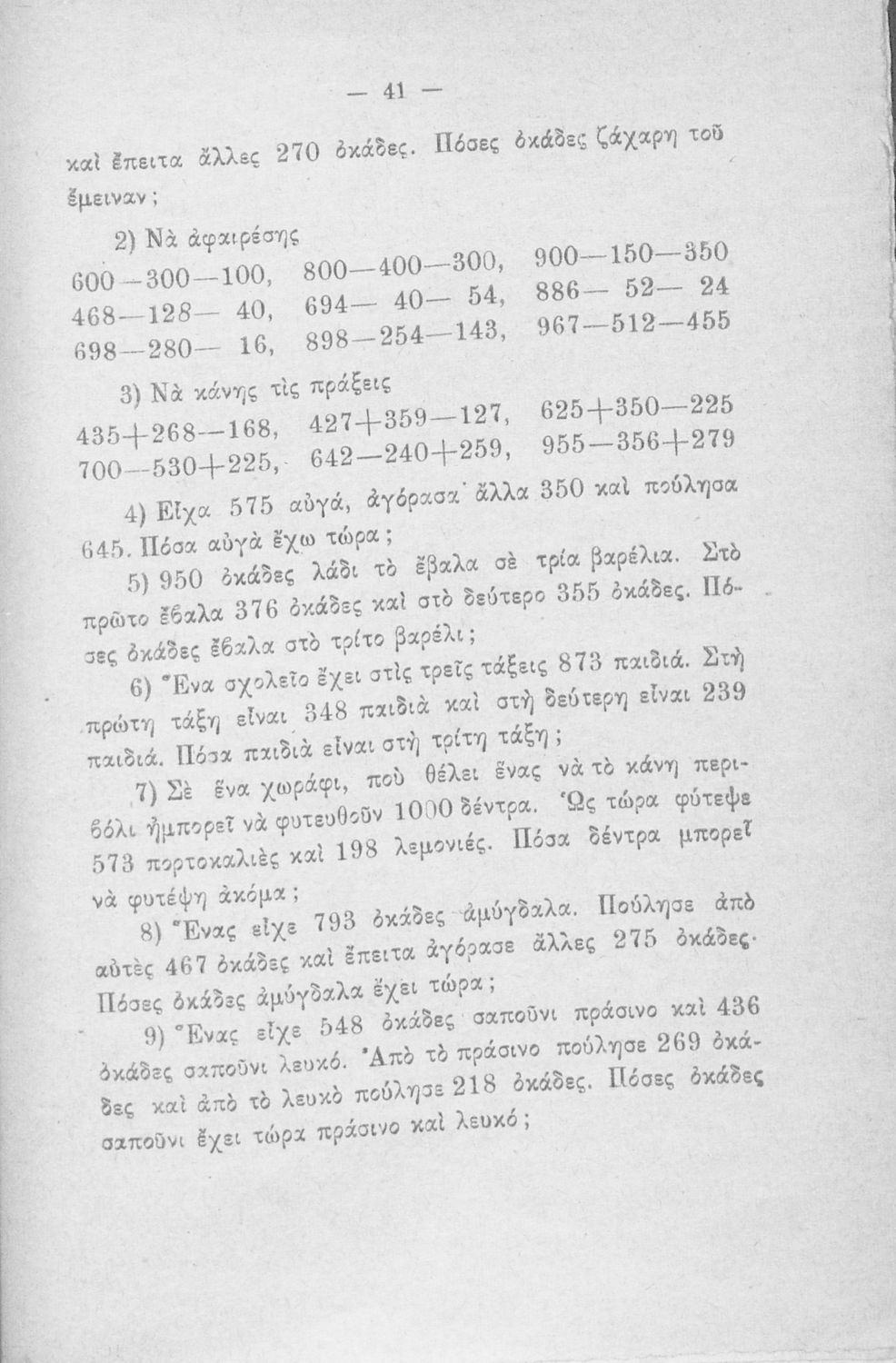 Βαθμίδα εκπαίδευσης: Πρωτοβάθμια Τάξη: Γ' Δημοτικού Μάθημα: Μαθηματικά Γλώσσα: Δημοτική Παρουσίαση περιεχομένου: Μαθητικό βοήθημα Μαθηματικών Γ΄ Δημοτικού που περιλαμβάνει αριθμητικά προβλήματα με τις 4 βασικές πράξεις, τις δεκάδες και εκατοντάδες, και ασκήσεις κατανόησης. |