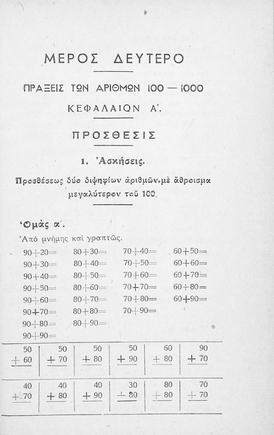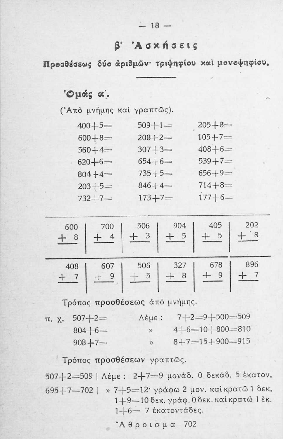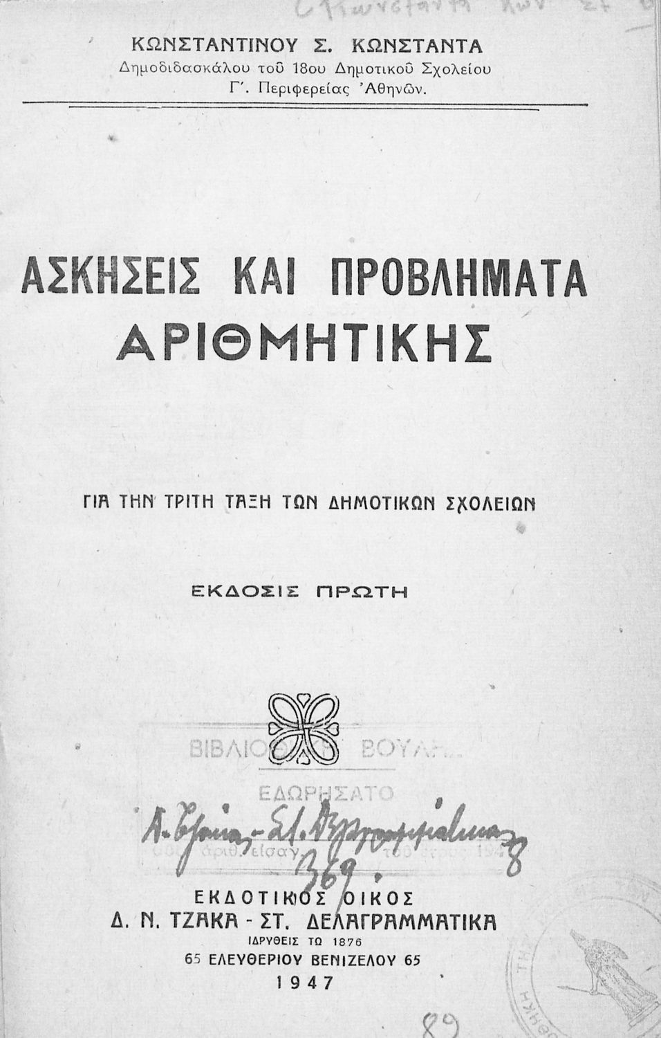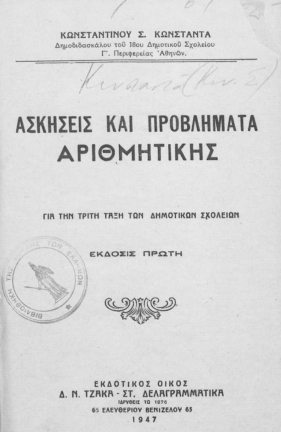 Παρουσίαση περιεχομένου: Το σύγγραμμα ήταν μαθητικό βοήθημα για τα Μαθηματικά του Δημοτικού. Περιλαμβάνει ασκήσεις και προβλήματα για την εξάσκηση των μαθητών στις μαθηματικές έννοιες. Αναφέρεται στις 4 βασικές πράξεις περιλαμβάνοντας θεωρία, ασκήσεις και παραδείγματα για την καλύτερη κατανόηση.