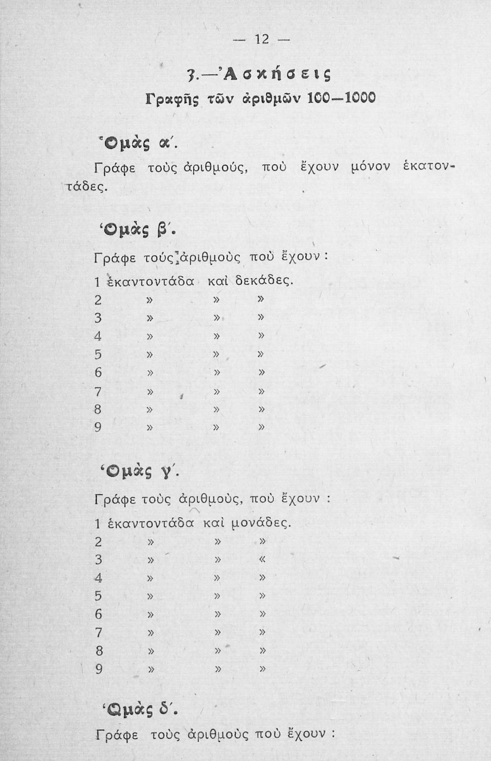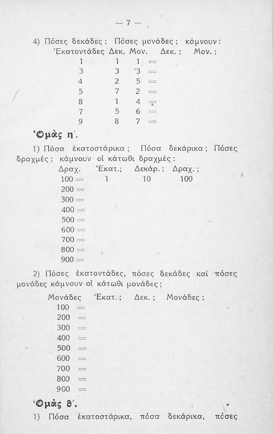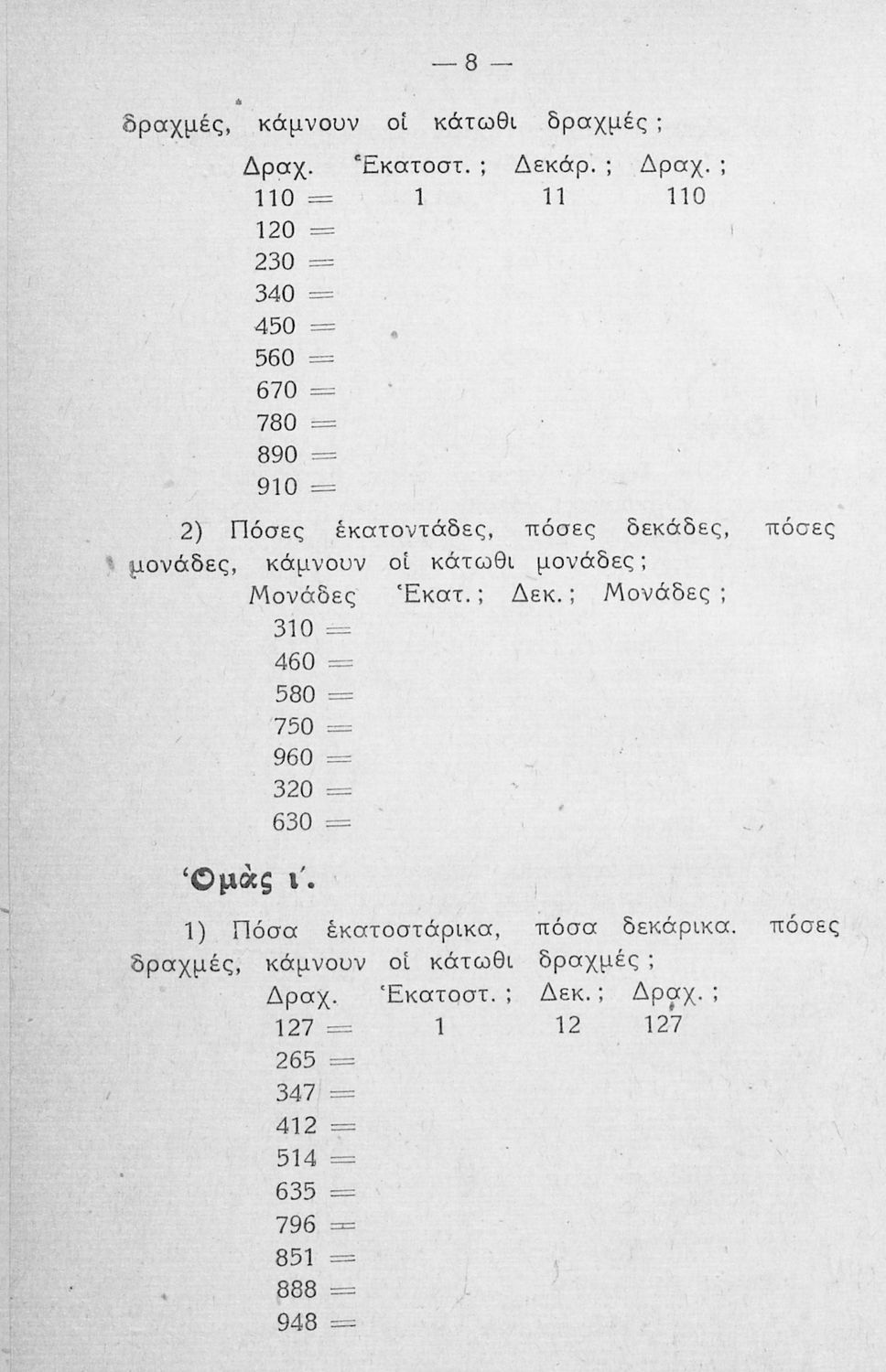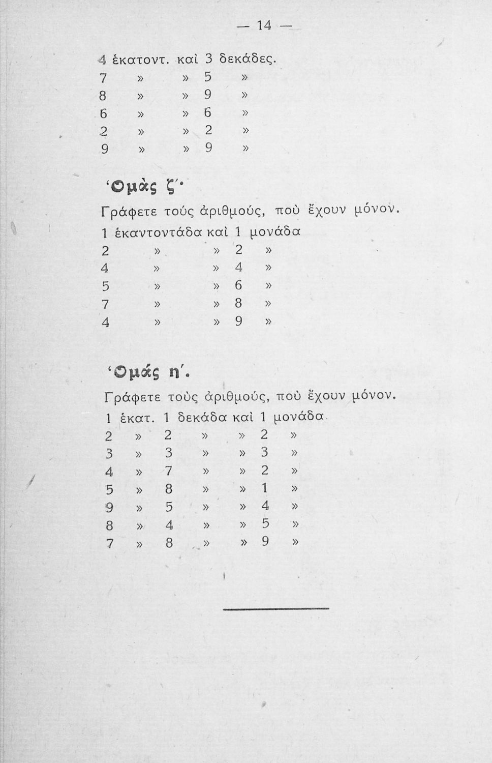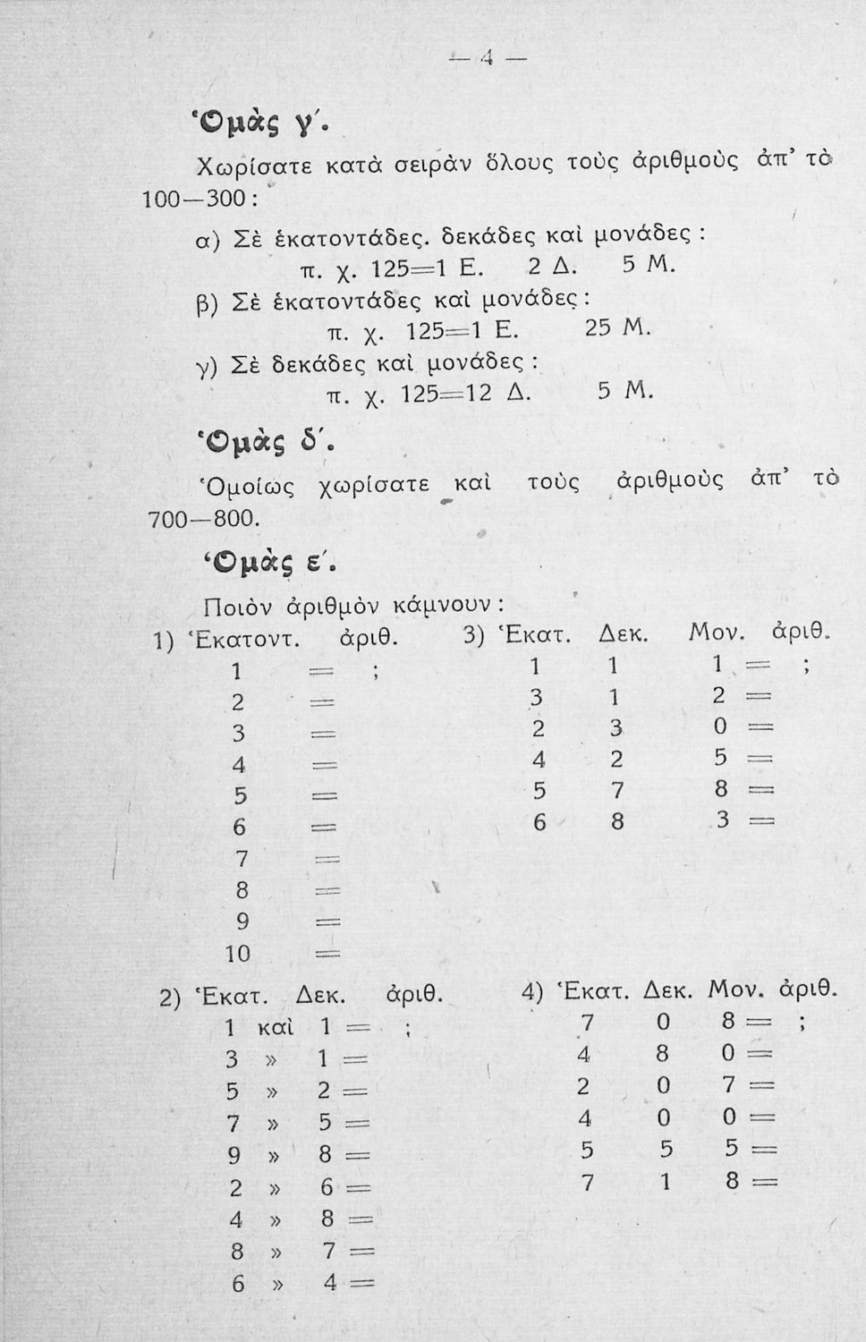Παρουσίαση περιεχομένου: Το σύγγραμμα ήταν μαθητικό βοήθημα για τα Μαθηματικά του Δημοτικού. Περιλαμβάνει ασκήσεις και προβλήματα για την εξάσκηση των μαθητών στις μαθηματικές έννοιες. Αναφέρεται στις 4 βασικές πράξεις περιλαμβάνοντας θεωρία, ασκήσεις και παραδείγματα για την καλύτερη κατανόηση.