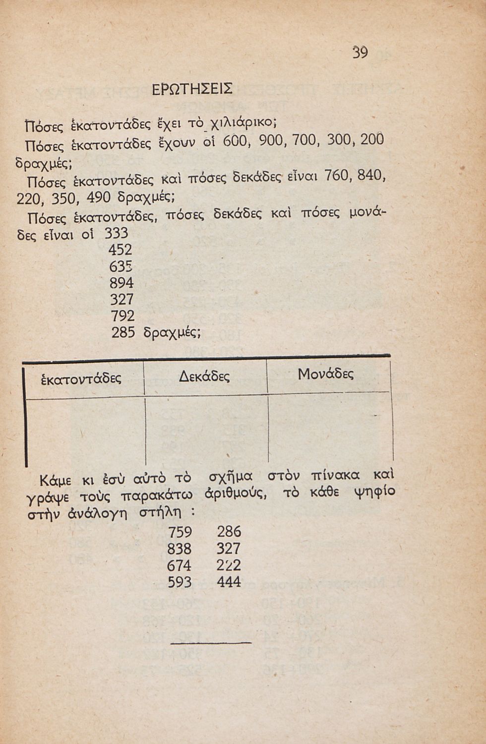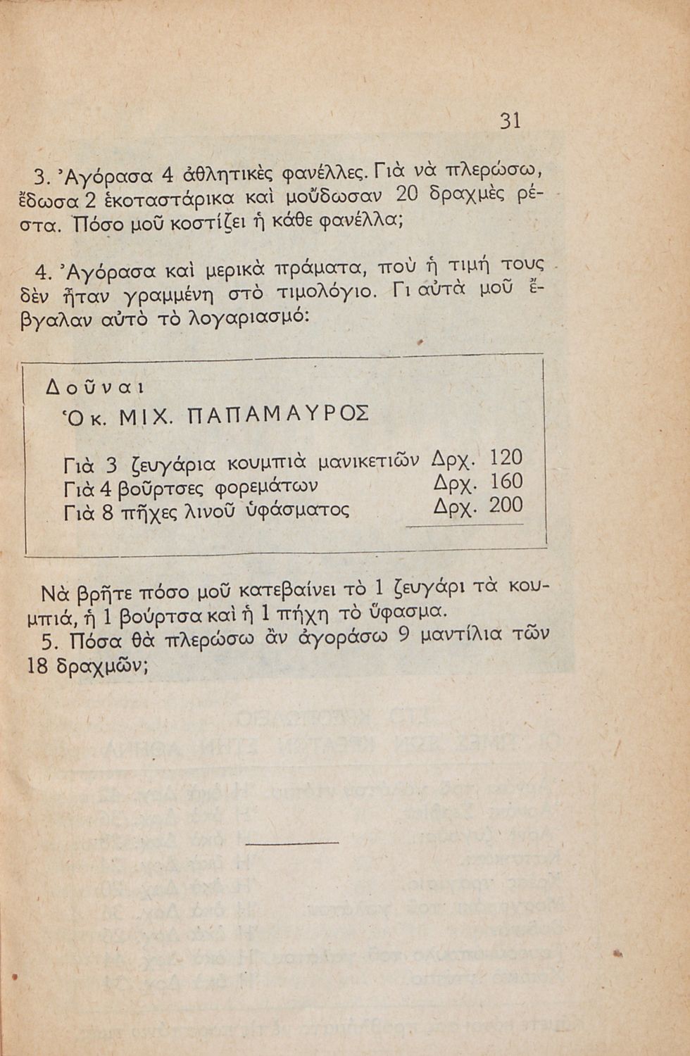 Το σύγγραμμα ήταν μαθητικό βοήθημα για το μαθήματα των Μαθηματικών στο Δημοτικό. Περιέχει ασκήσεις και θεωρία για τις 4 βασικές πράξεις. Επίσης, έχει προβλήματα με τις βασικές πράξεις. Διαθέτει σχήματα για την