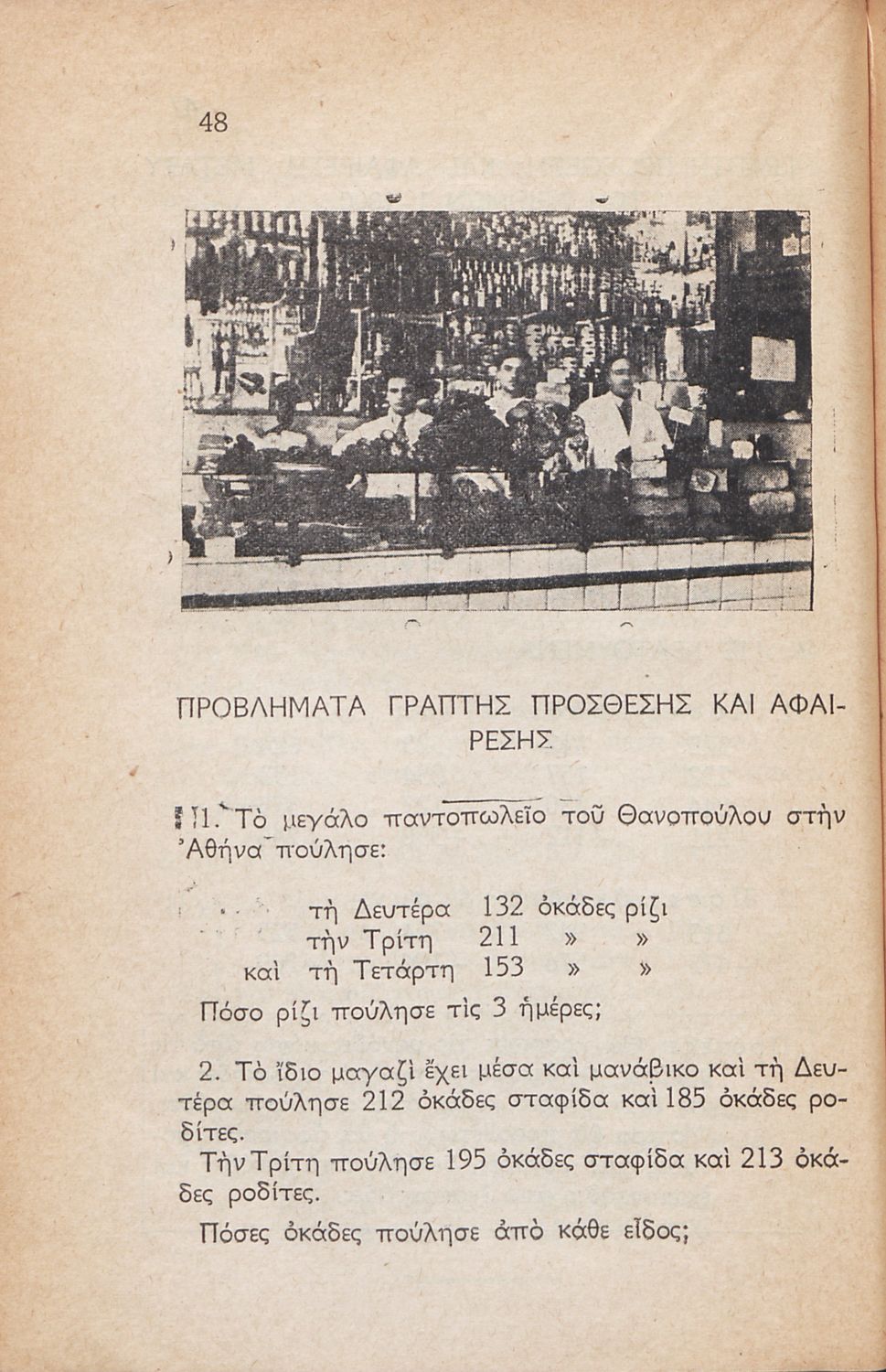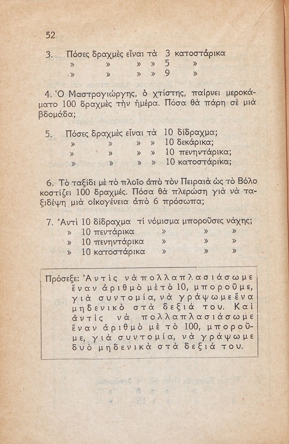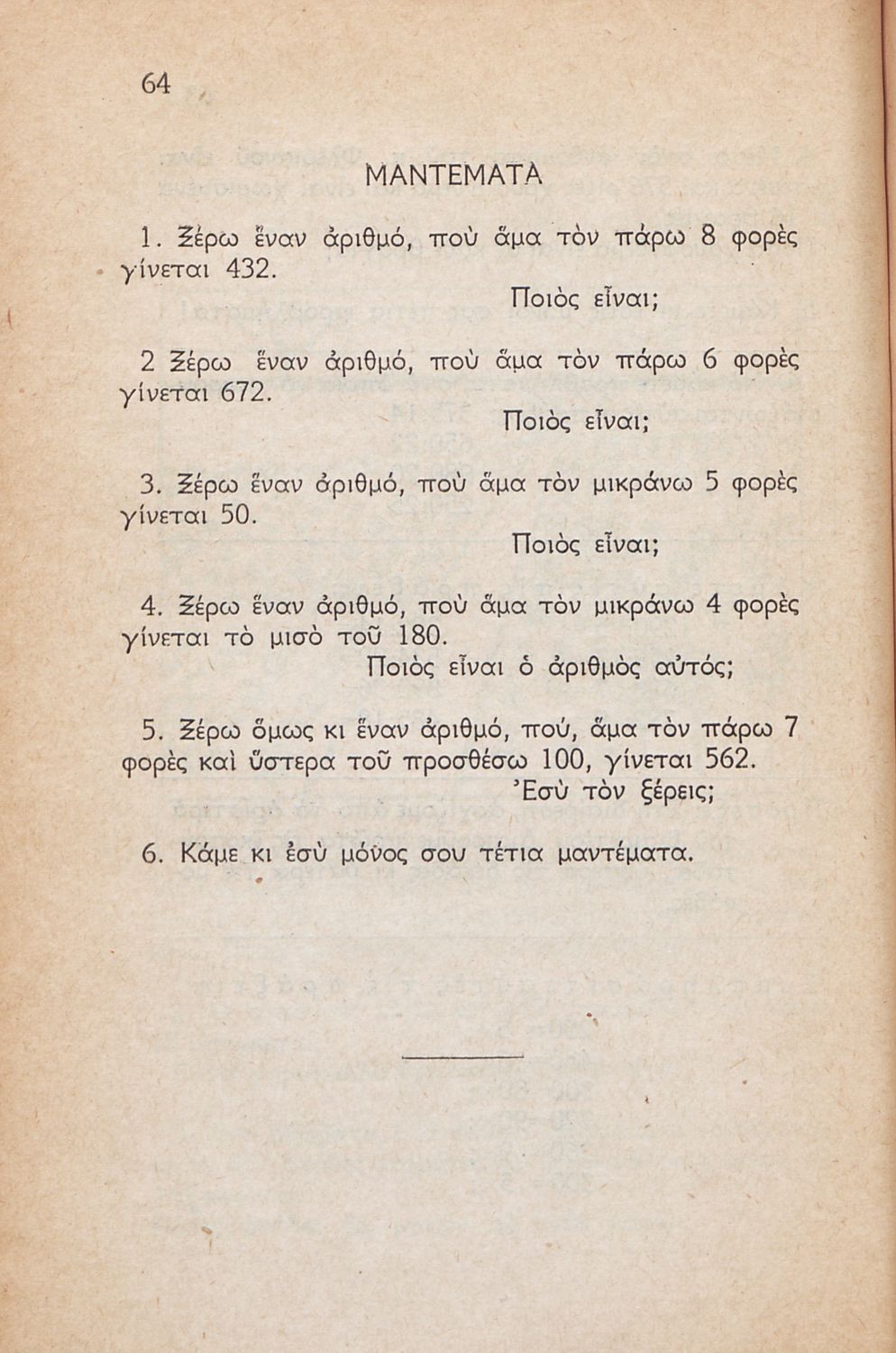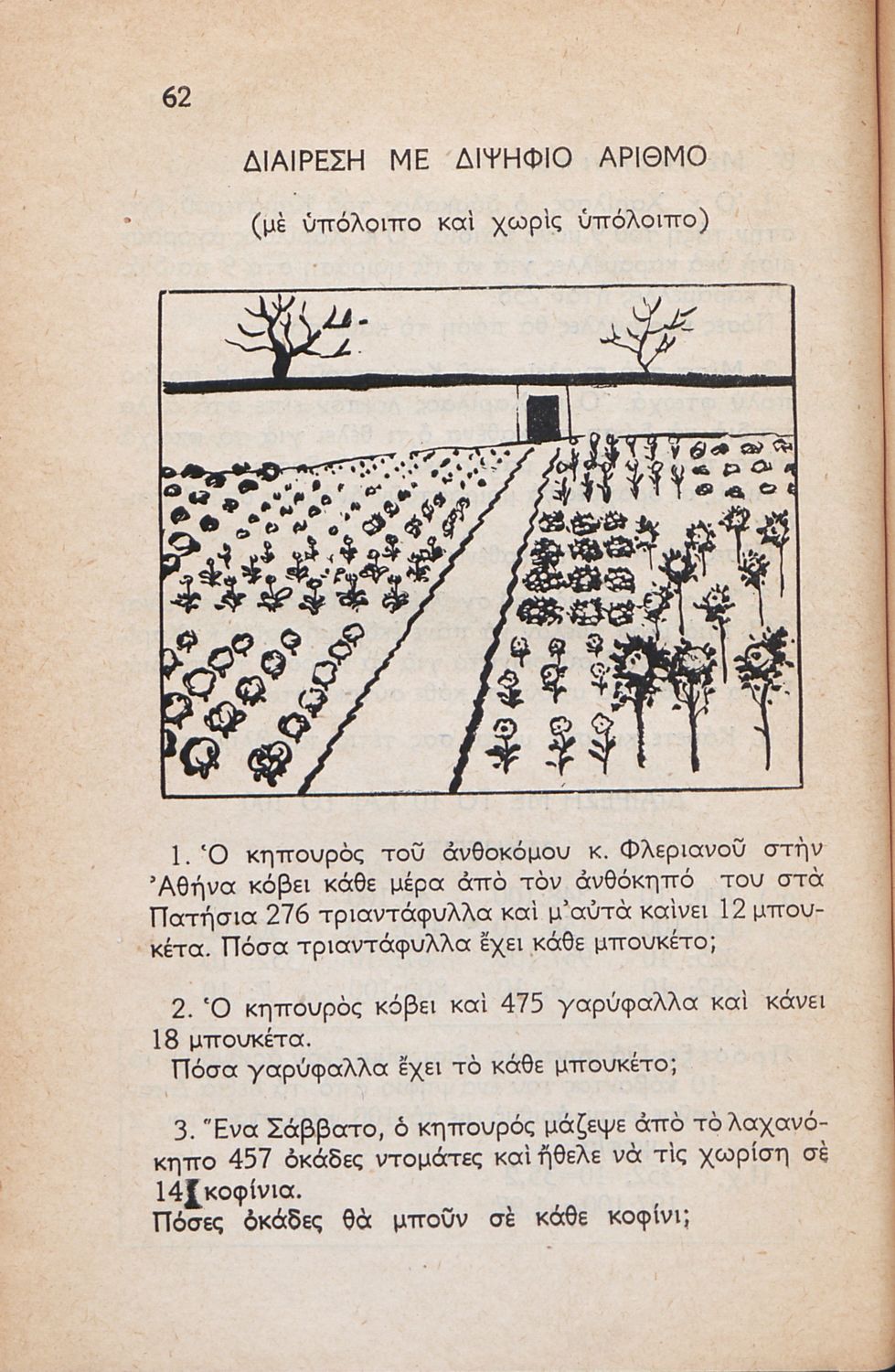 Το σύγγραμμα ήταν μαθητικό βοήθημα για το μαθήματα των Μαθηματικών στο Δημοτικό. Περιέχει ασκήσεις και θεωρία για τις 4 βασικές πράξεις. Επίσης, έχει προβλήματα με τις βασικές πράξεις. Διαθέτει σχήματα για την