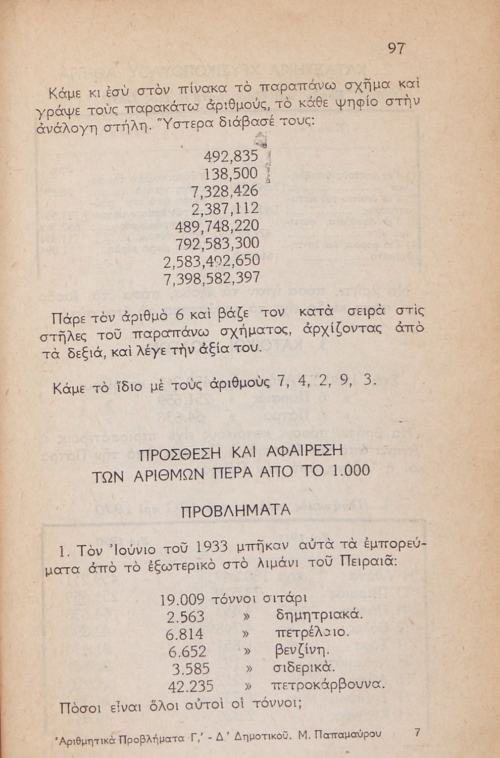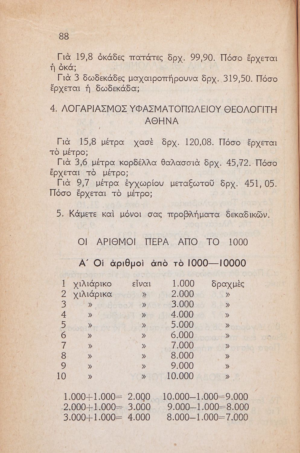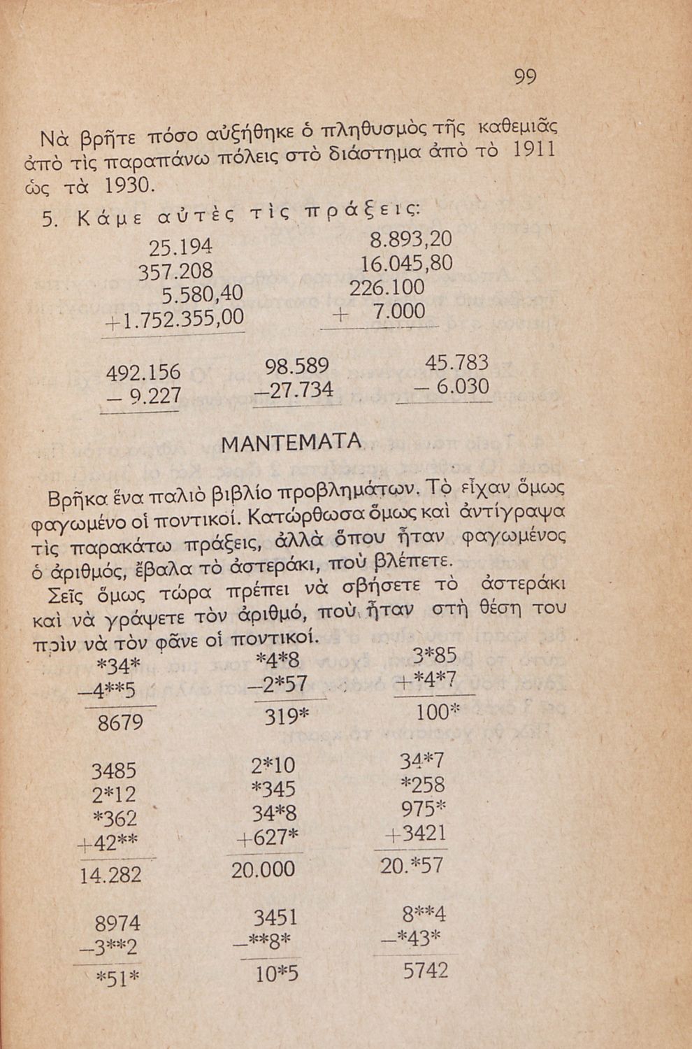 Το σύγγραμμα ήταν μαθητικό βοήθημα για το μαθήματα των Μαθηματικών στο Δημοτικό. Περιέχει ασκήσεις και θεωρία για τις 4 βασικές πράξεις. Επίσης, έχει προβλήματα με τις βασικές πράξεις. Διαθέτει σχήματα για την