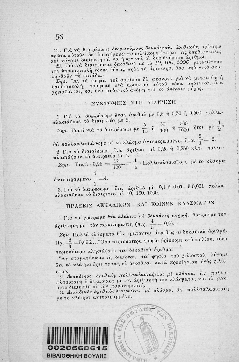Σχολικό εγχειρίδιο Αριθμητικής Δ΄ Δημοτικού χωρισμένο σε πρακτικά προβλήματα και τις λύσεις τους που περιλαμβάνει και κάποια στοιχεία Γεωμετρίας.