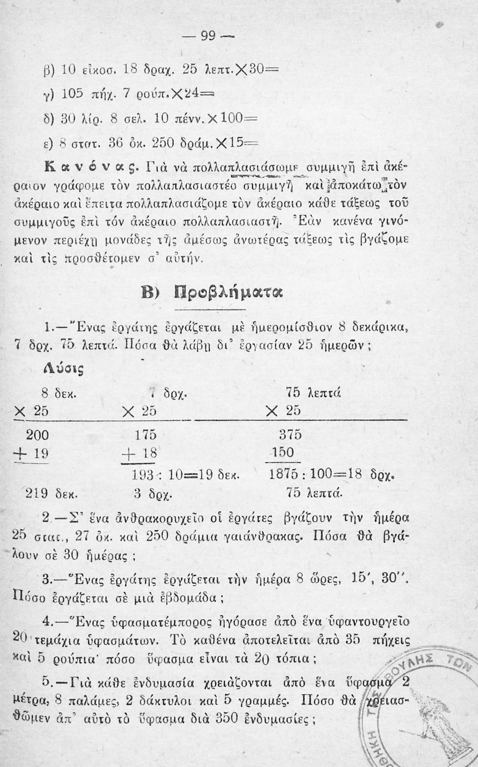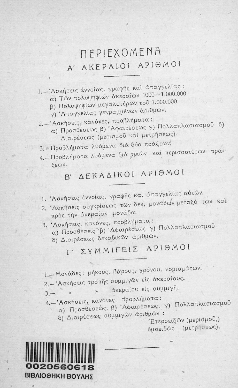 Το σύγγραμμα ήταν σχολικό εγχειρίδιο για το μάθημα των Μαθηματικών στο Δημοτικό. Περιέχει ασκήσεις και προβλήματα αριθμητικής.