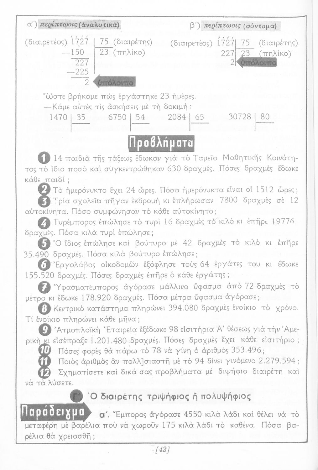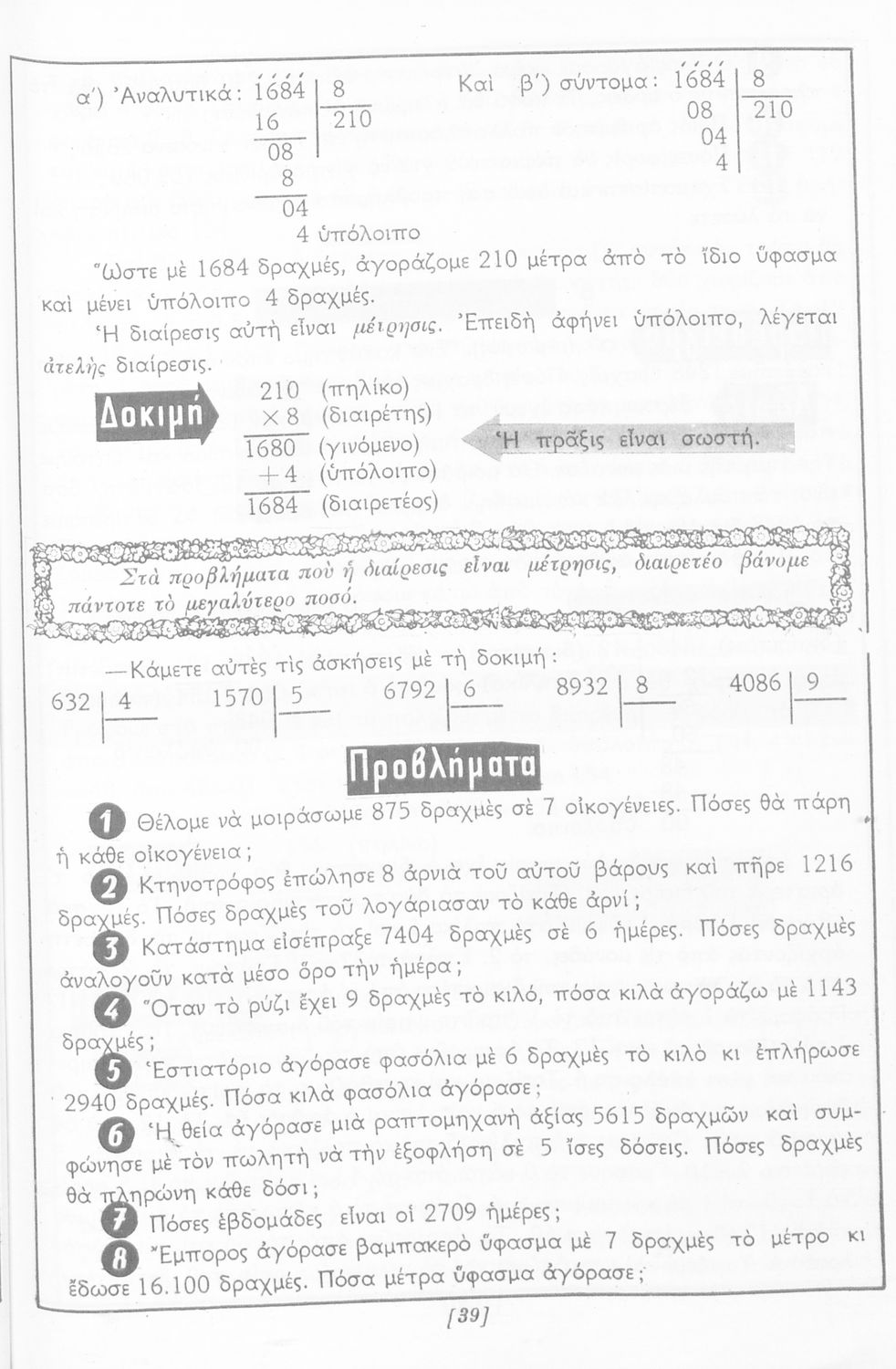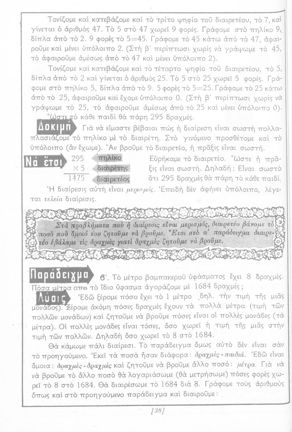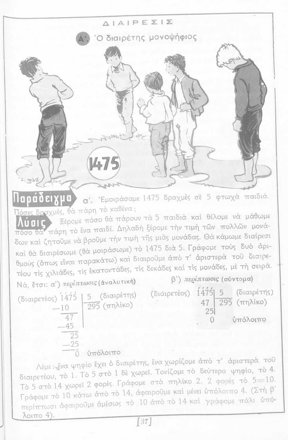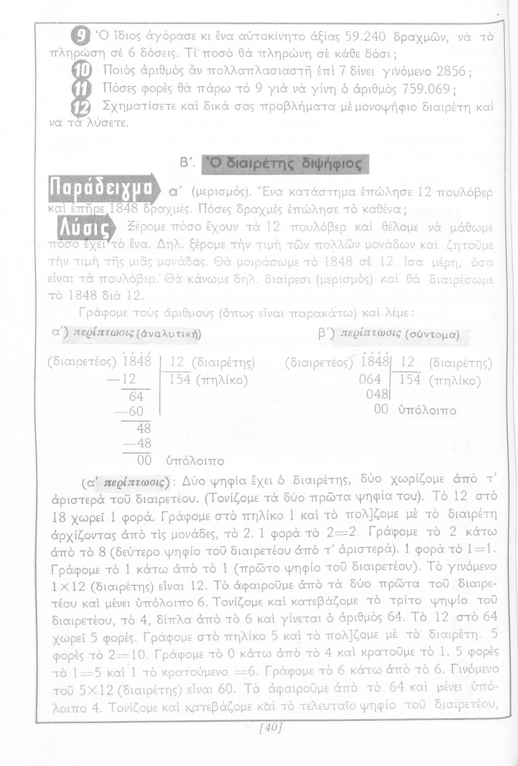 Σχολικό εγχειρίδιο Αριθμητικής Δ΄ Δημοτικού χωρισμένο σε πρακτικά προβλήματα και τις λύσεις τους που περιλαμβάνει και κάποια στοιχεία Γεωμετρίας.