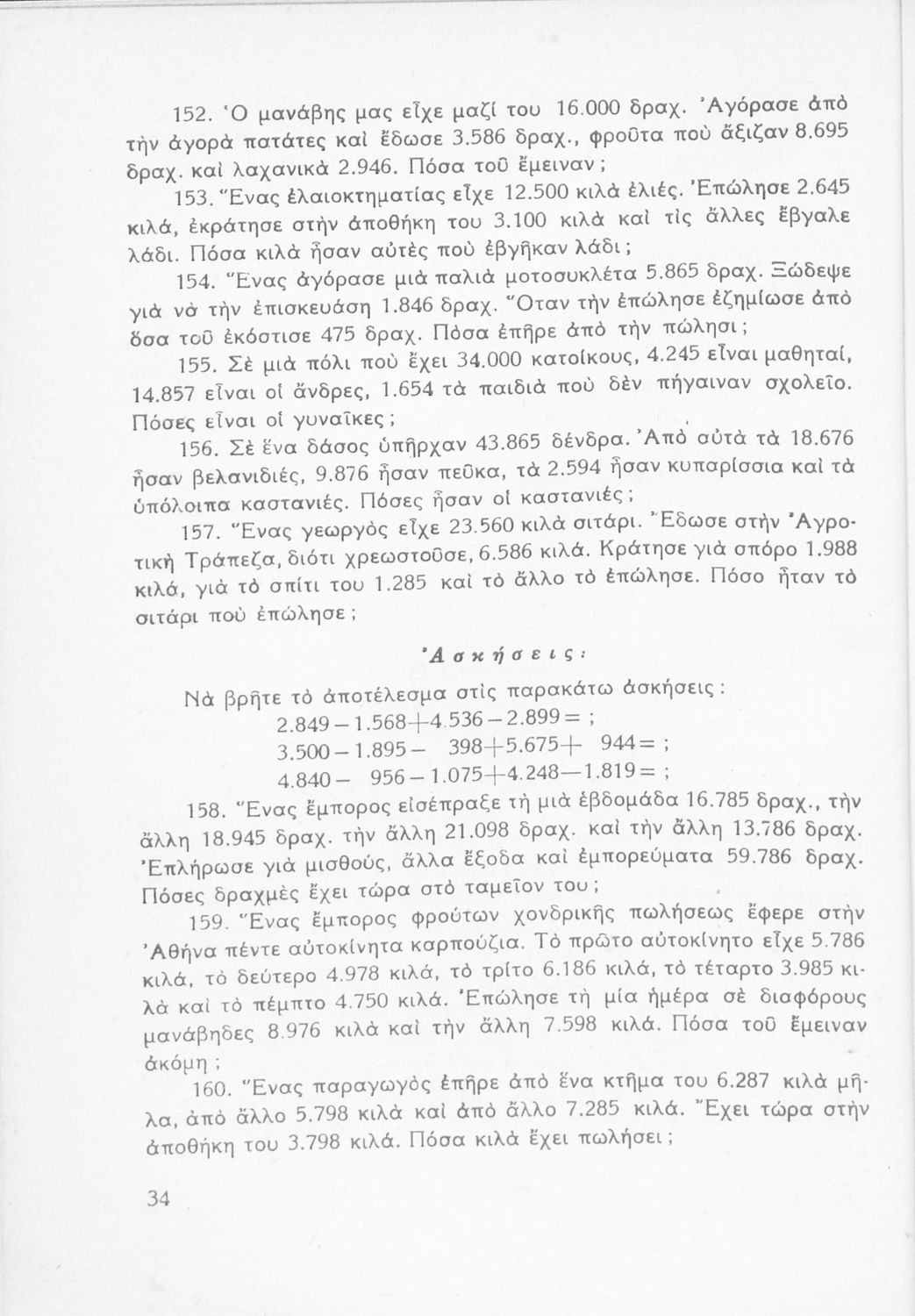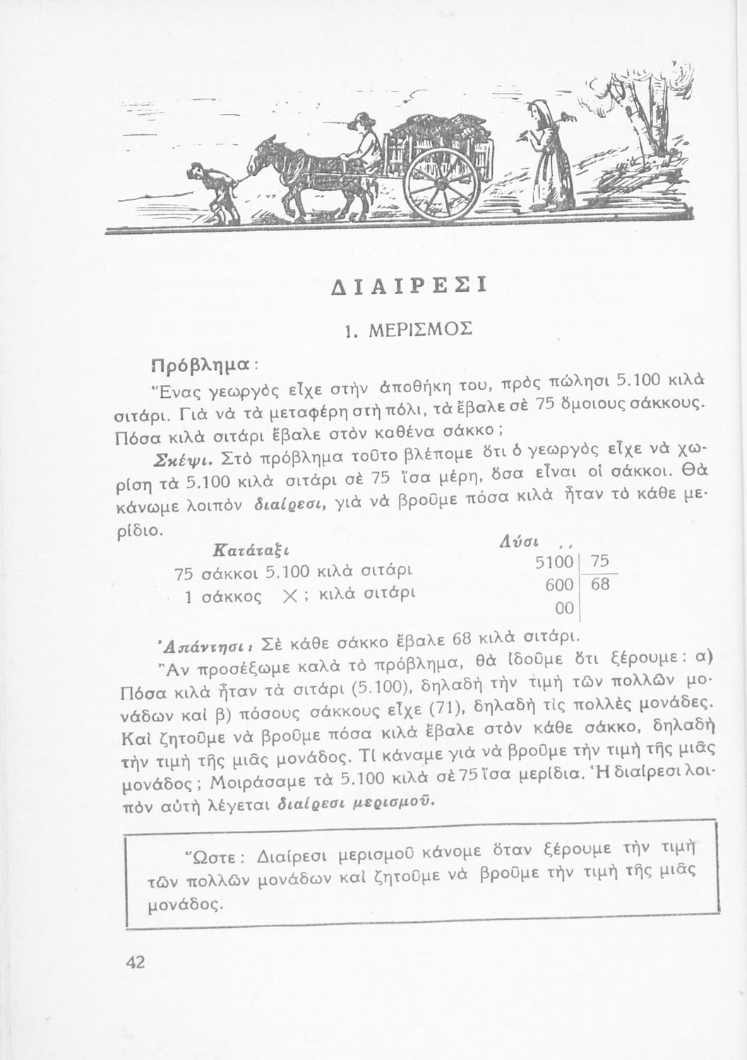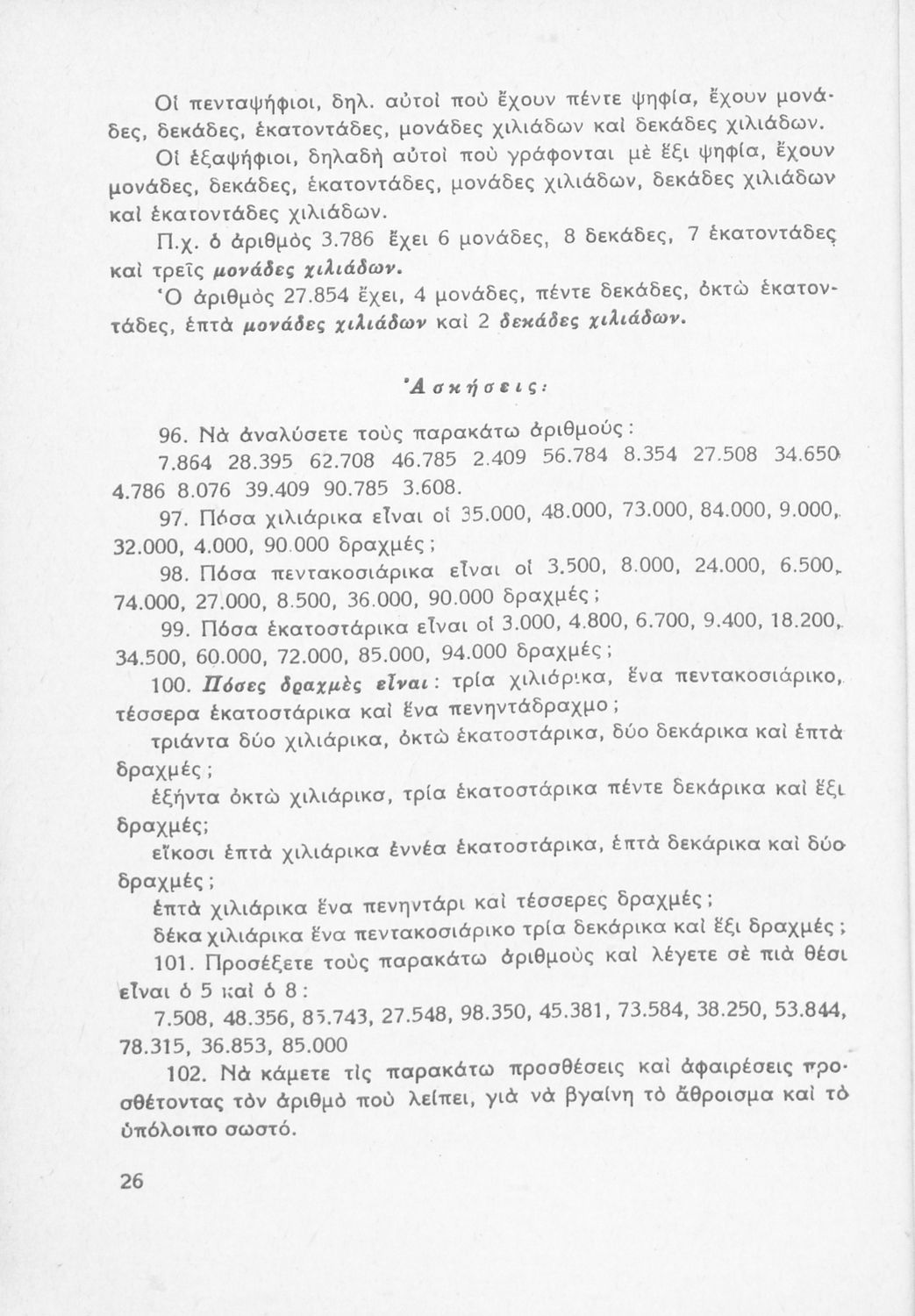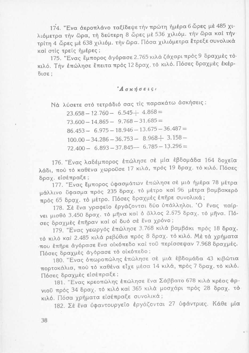 Βαθμίδα εκπαίδευσης: Πρωτοβάθμια Τάξη: Δ' Δημοτικού Μάθημα: Μαθηματικά Γλώσσα: Δημοτική Παρουσίαση περιεχομένου: Μαθητικό βοήθημα Μαθηματικών Δ' Δημοτικού που περιέχει εισαγωγή στις βασικές πράξεις αριθμητικής πολυψήφιων ακέραιων και δεκαδικών αριθμών και κλασμάτων, και στις μονάδες μέτρησης όγκου, βάρους και επιφάνειας. |