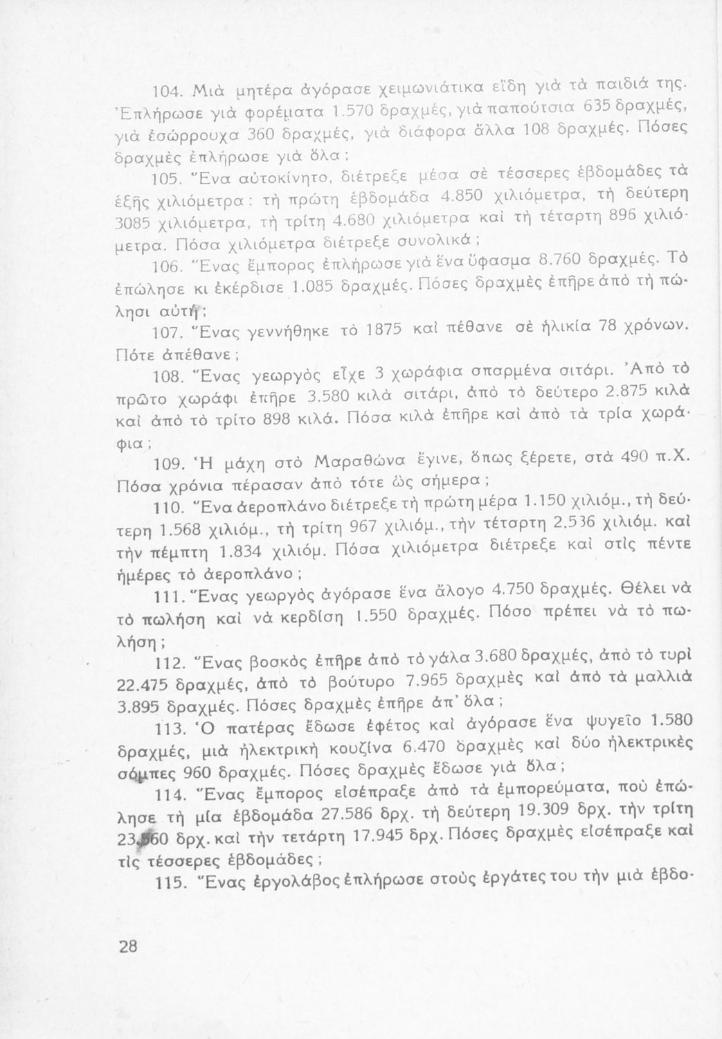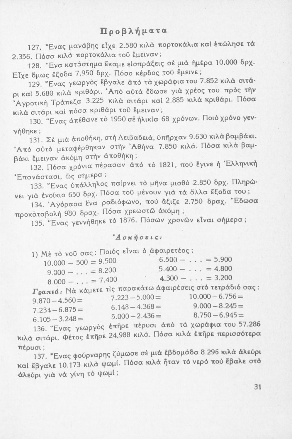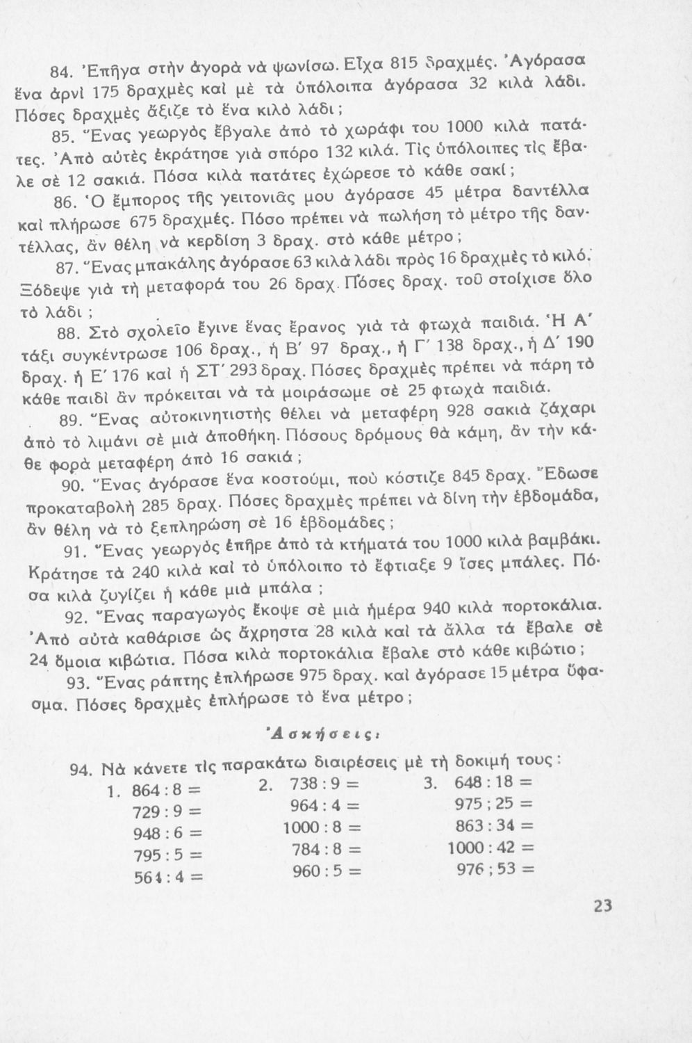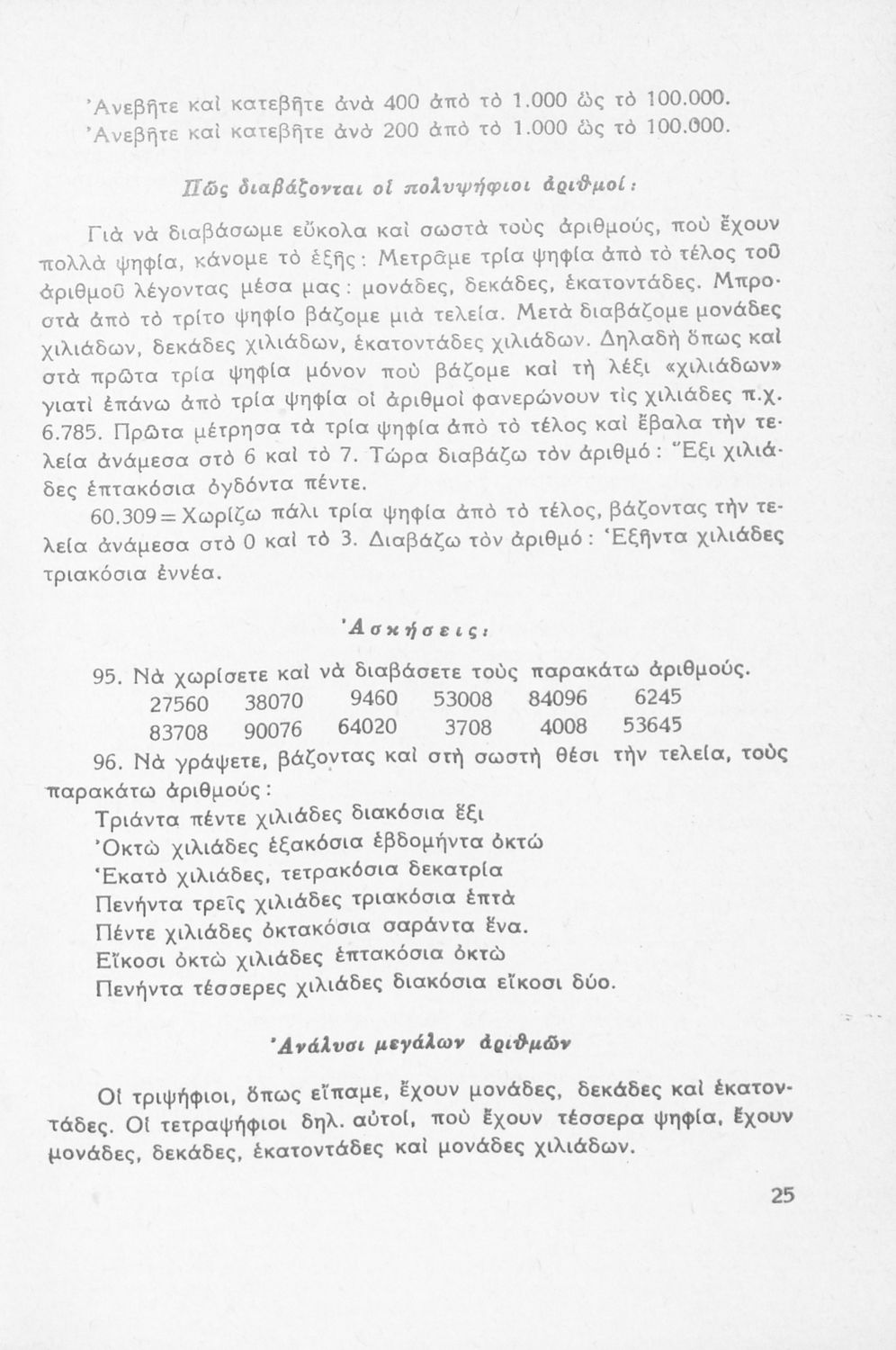 Βαθμίδα εκπαίδευσης: Πρωτοβάθμια Τάξη: Δ' Δημοτικού Μάθημα: Μαθηματικά Γλώσσα: Δημοτική Παρουσίαση περιεχομένου: Μαθητικό βοήθημα Μαθηματικών Δ' Δημοτικού που περιέχει εισαγωγή στις βασικές πράξεις αριθμητικής πολυψήφιων ακέραιων και δεκαδικών αριθμών και κλασμάτων, και στις μονάδες μέτρησης όγκου, βάρους και επιφάνειας. |