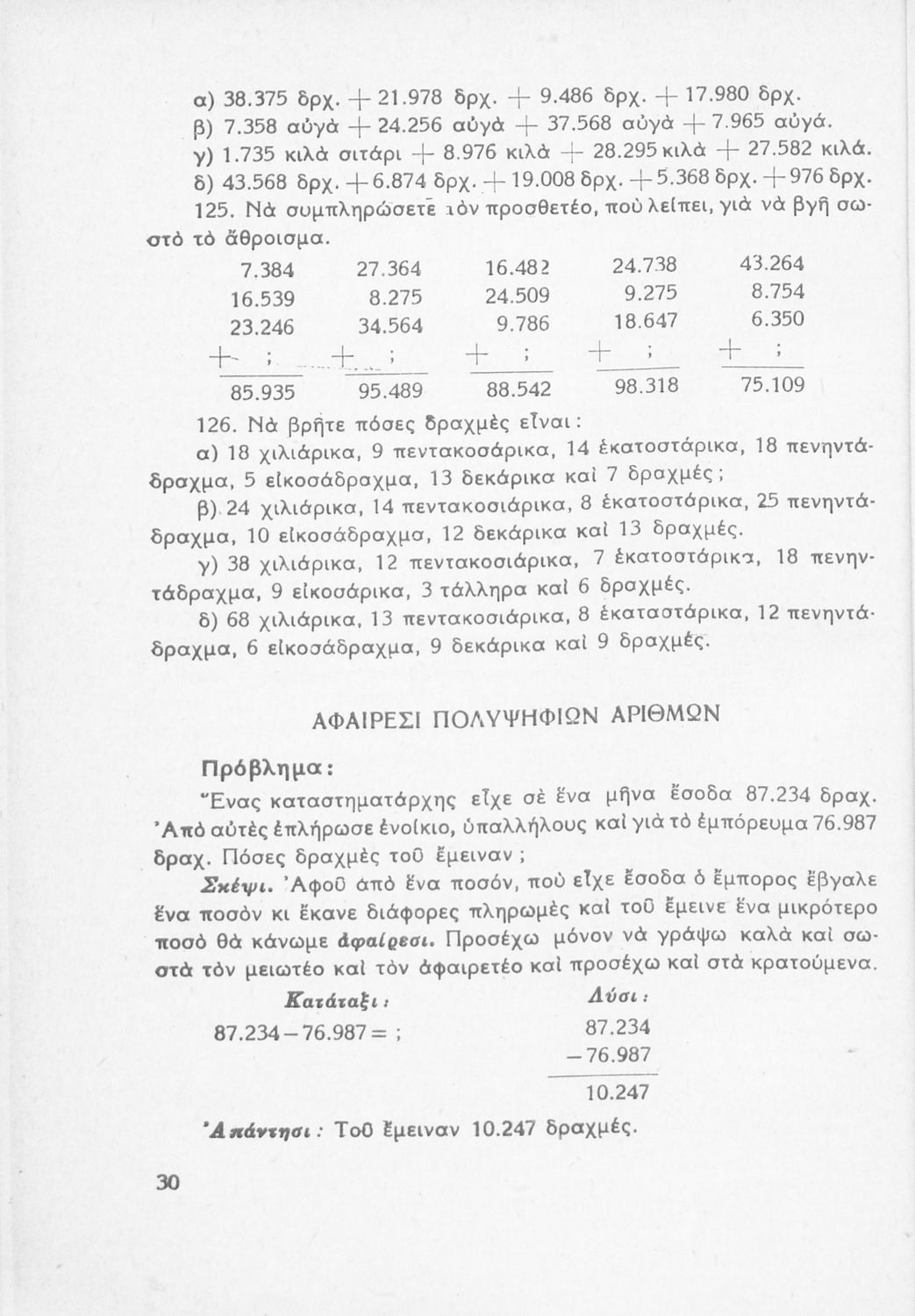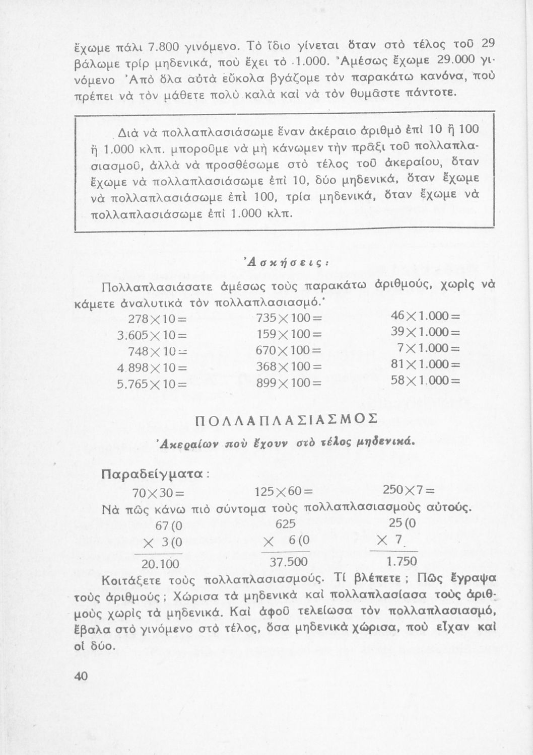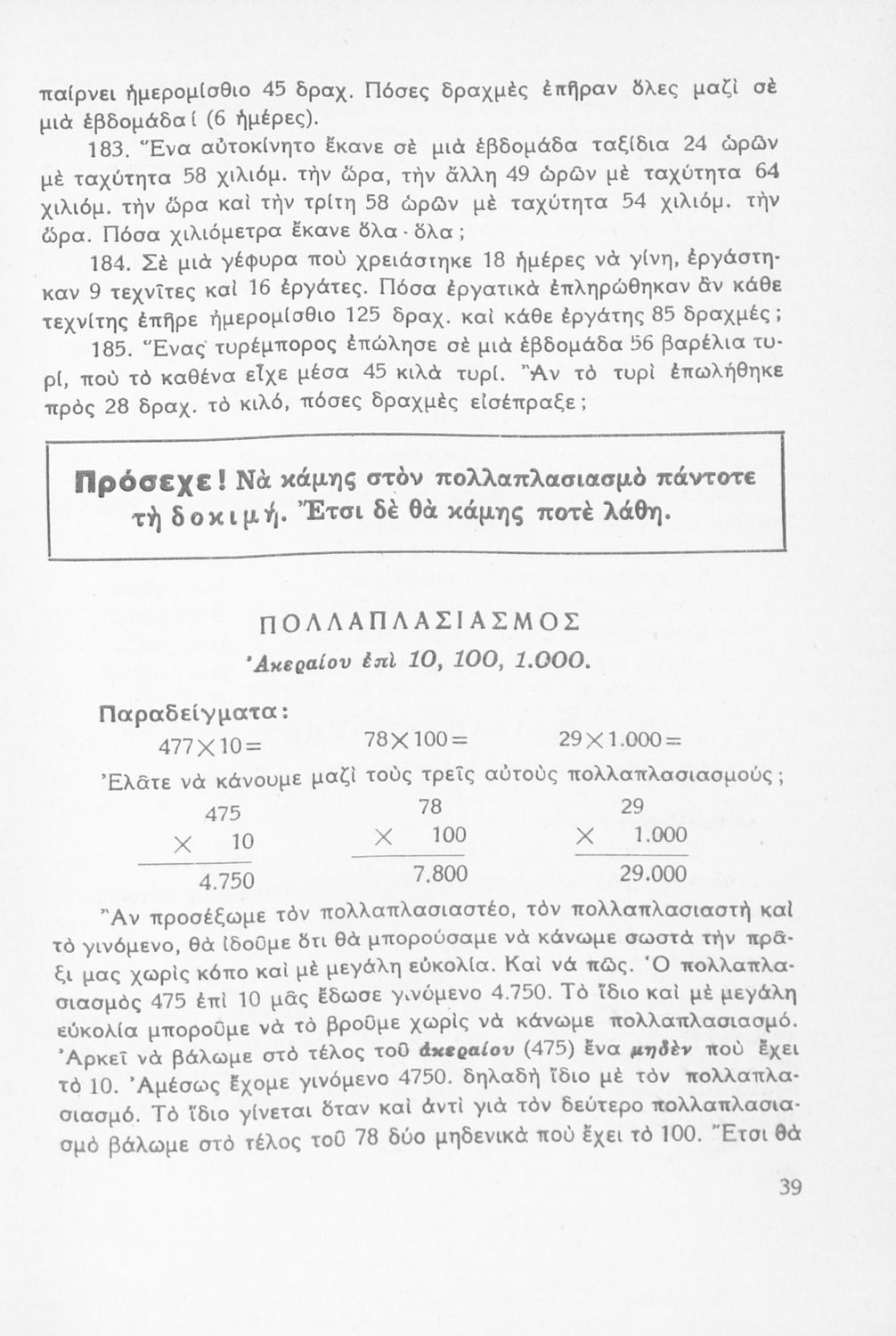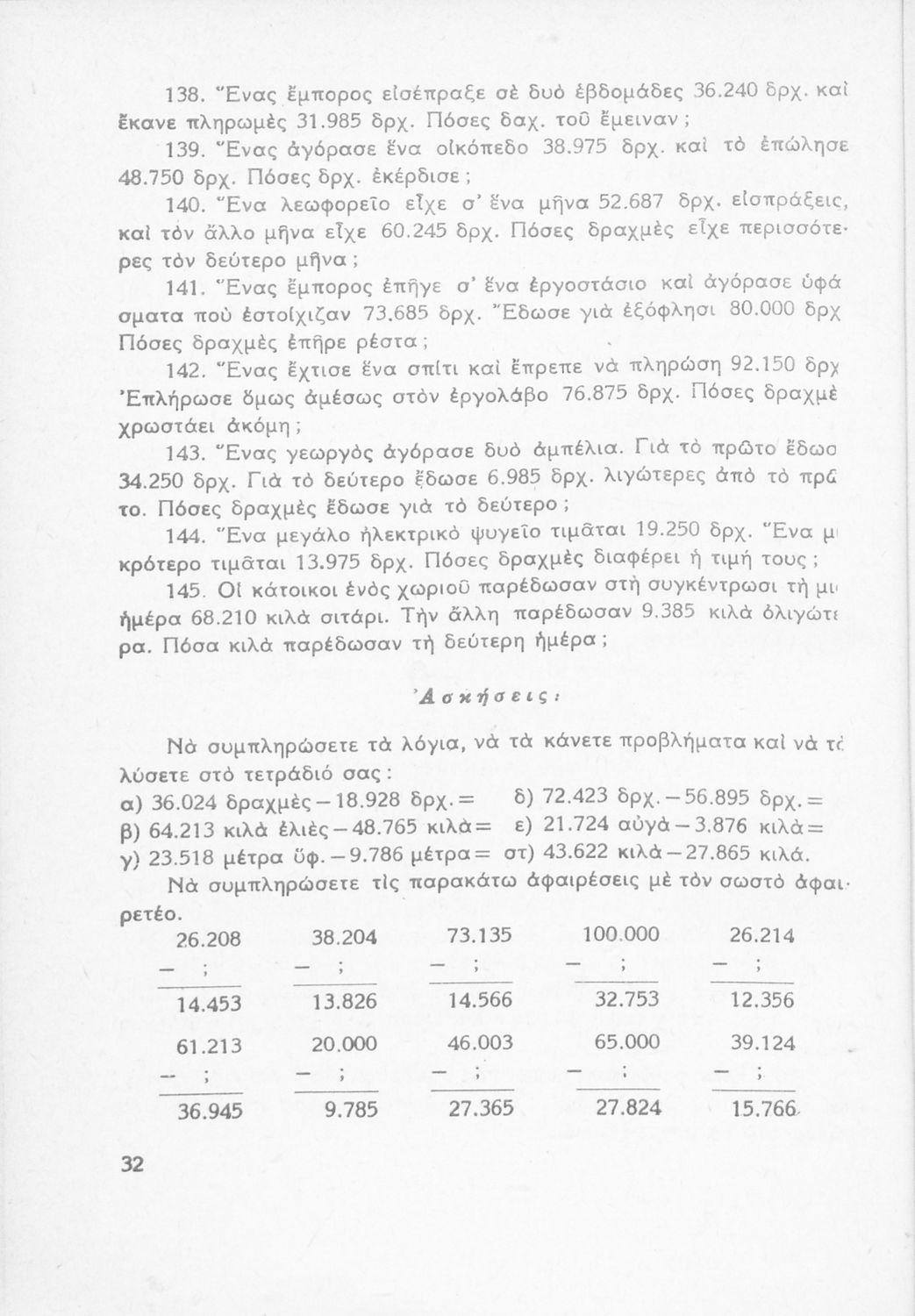 Βαθμίδα εκπαίδευσης: Πρωτοβάθμια Τάξη: Δ' Δημοτικού Μάθημα: Μαθηματικά Γλώσσα: Δημοτική Παρουσίαση περιεχομένου: Μαθητικό βοήθημα Μαθηματικών Δ' Δημοτικού που περιέχει εισαγωγή στις βασικές πράξεις αριθμητικής πολυψήφιων ακέραιων και δεκαδικών αριθμών και κλασμάτων, και στις μονάδες μέτρησης όγκου, βάρους και επιφάνειας. |