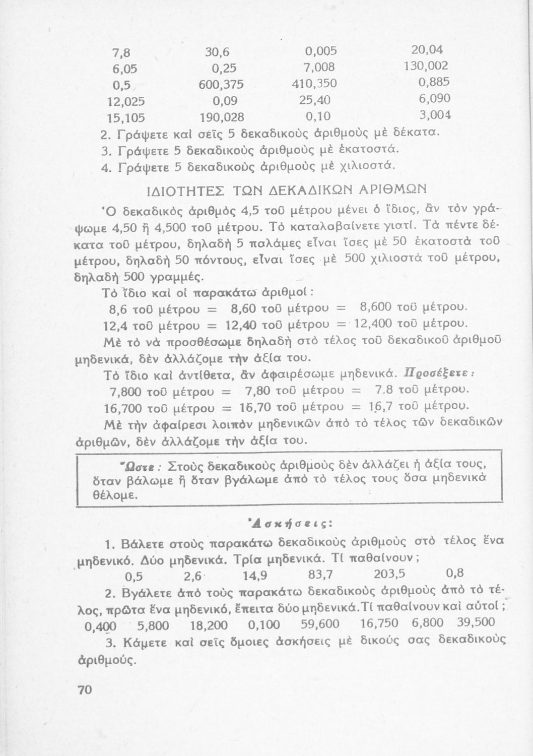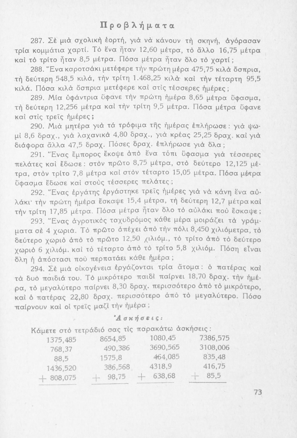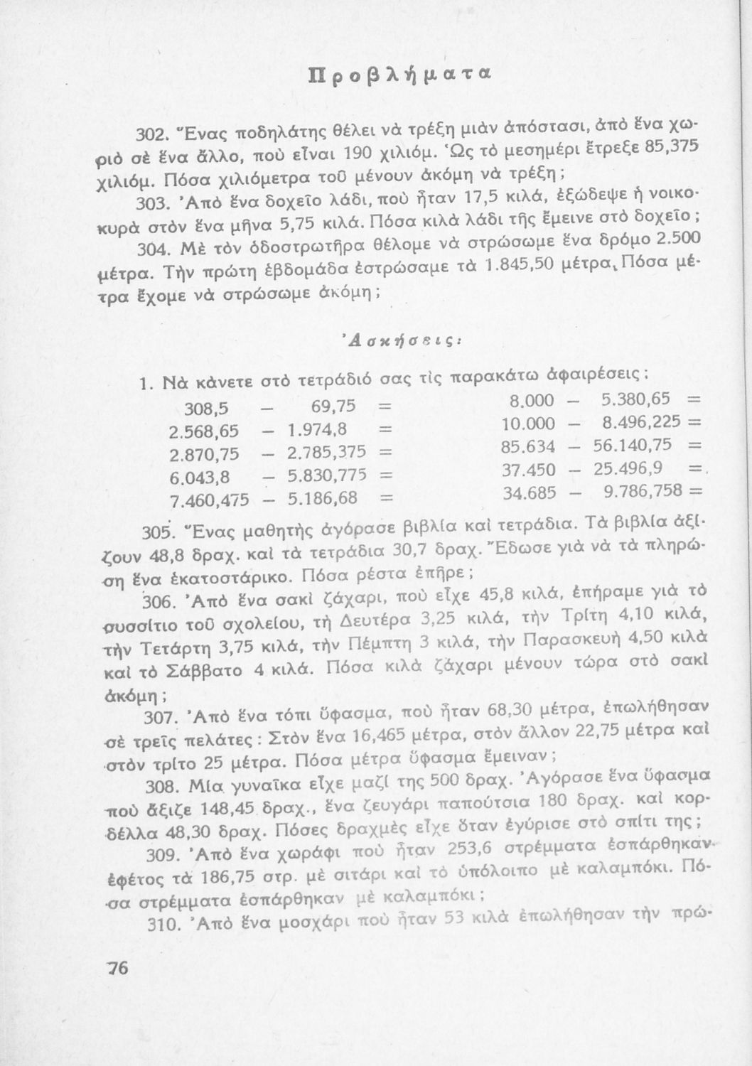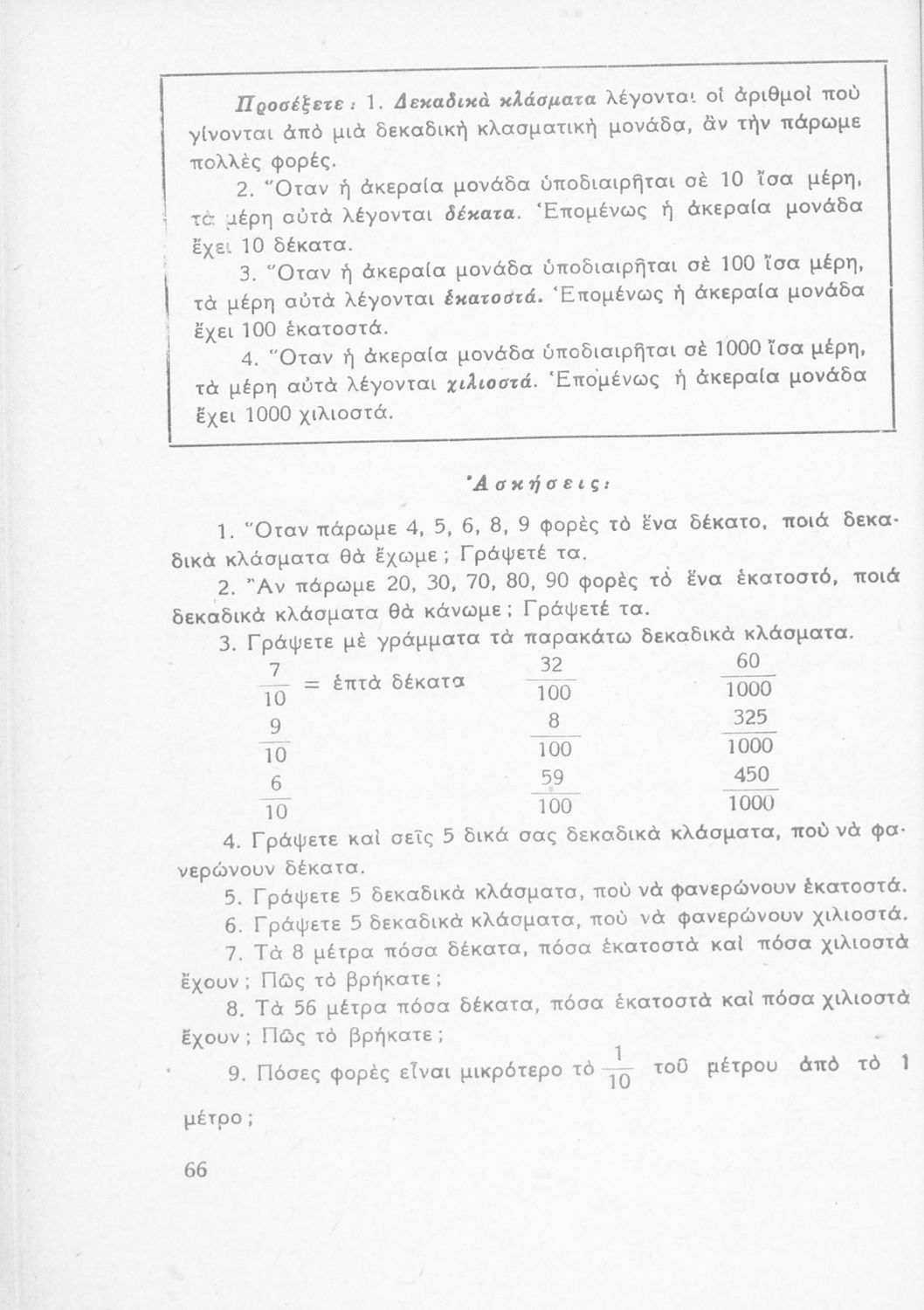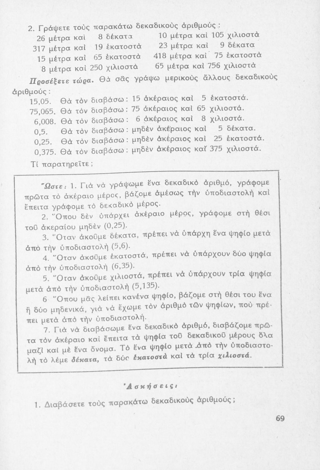 Βαθμίδα εκπαίδευσης: Πρωτοβάθμια Τάξη: Δ' Δημοτικού Μάθημα: Μαθηματικά Γλώσσα: Δημοτική Παρουσίαση περιεχομένου: Μαθητικό βοήθημα Μαθηματικών Δ' Δημοτικού που περιέχει εισαγωγή στις βασικές πράξεις αριθμητικής πολυψήφιων ακέραιων και δεκαδικών αριθμών και κλασμάτων, και στις μονάδες μέτρησης όγκου, βάρους και επιφάνειας. |