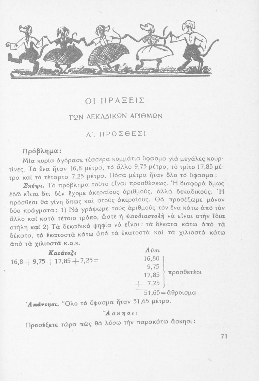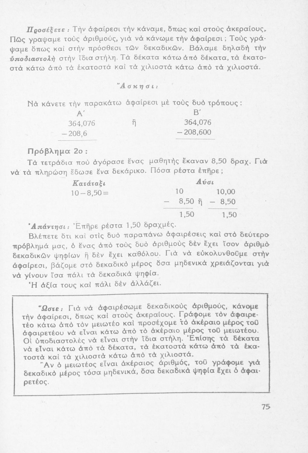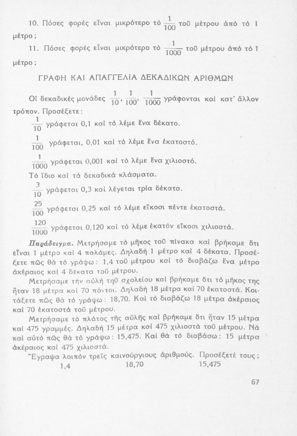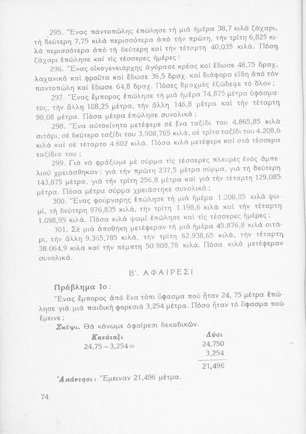 Βαθμίδα εκπαίδευσης: Πρωτοβάθμια Τάξη: Δ' Δημοτικού Μάθημα: Μαθηματικά Γλώσσα: Δημοτική Παρουσίαση περιεχομένου: Μαθητικό βοήθημα Μαθηματικών Δ' Δημοτικού που περιέχει εισαγωγή στις βασικές πράξεις αριθμητικής πολυψήφιων ακέραιων και δεκαδικών αριθμών και κλασμάτων, και στις μονάδες μέτρησης όγκου, βάρους και επιφάνειας. |