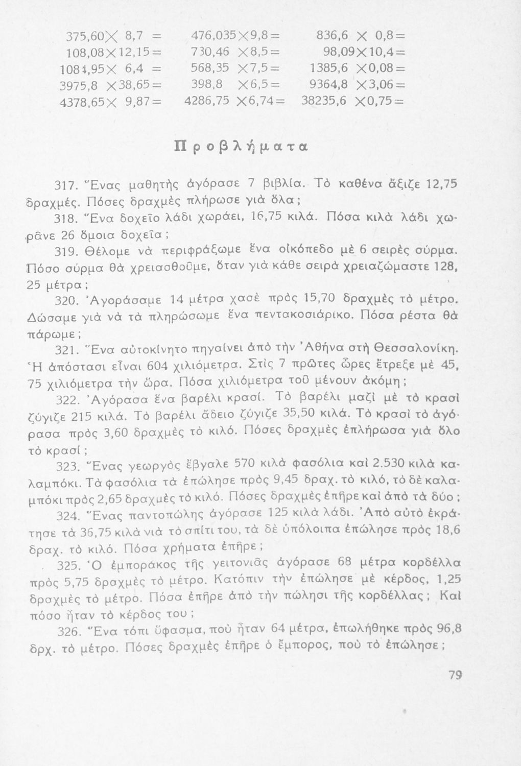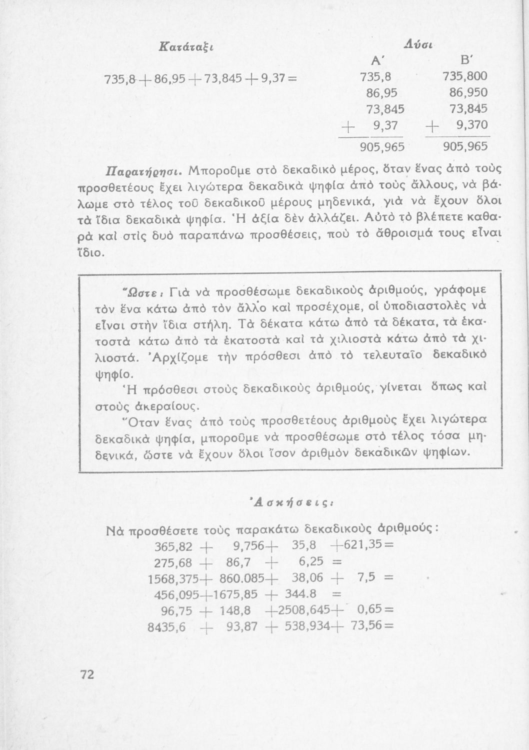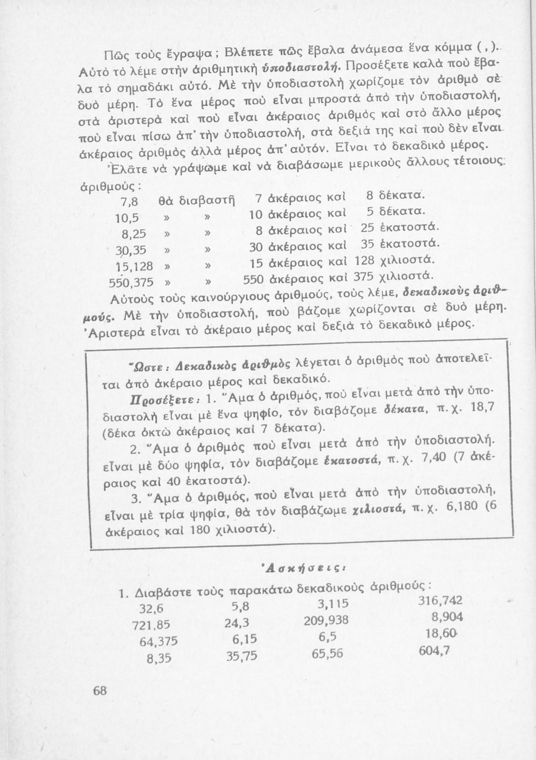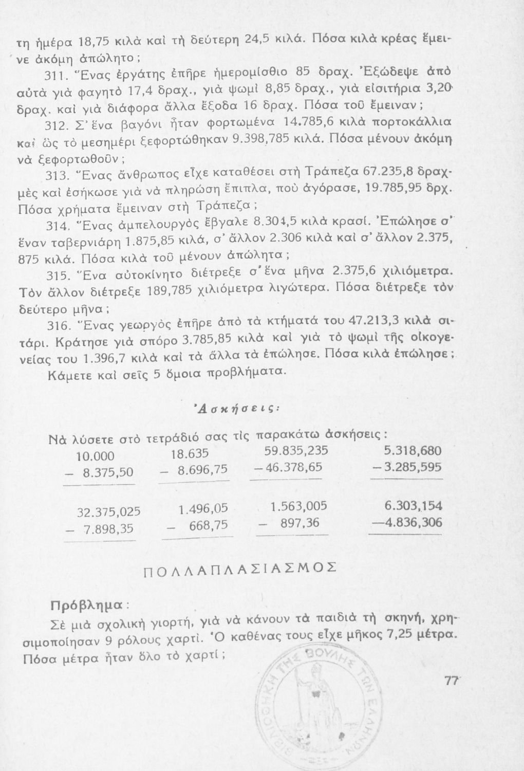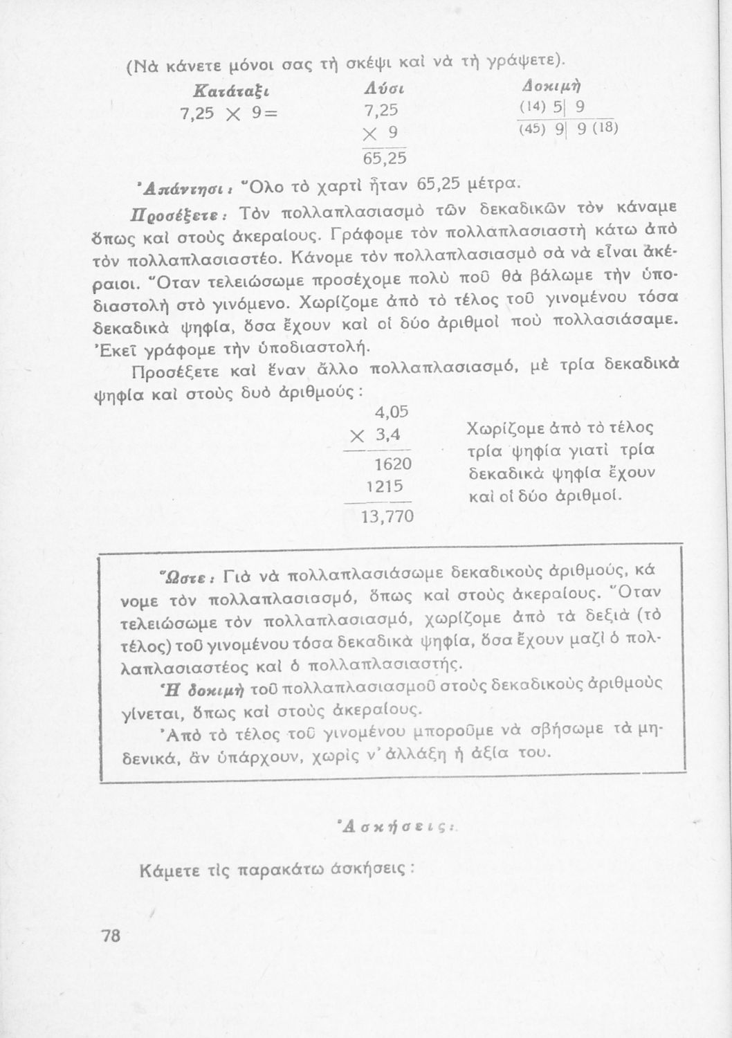 Βαθμίδα εκπαίδευσης: Πρωτοβάθμια Τάξη: Δ' Δημοτικού Μάθημα: Μαθηματικά Γλώσσα: Δημοτική Παρουσίαση περιεχομένου: Μαθητικό βοήθημα Μαθηματικών Δ' Δημοτικού που περιέχει εισαγωγή στις βασικές πράξεις αριθμητικής πολυψήφιων ακέραιων και δεκαδικών αριθμών και κλασμάτων, και στις μονάδες μέτρησης όγκου, βάρους και επιφάνειας. |