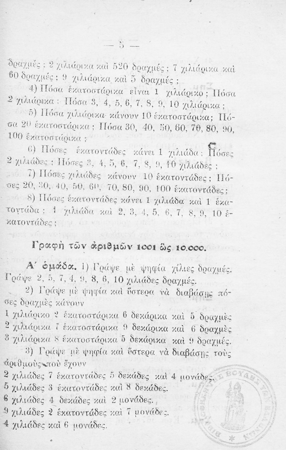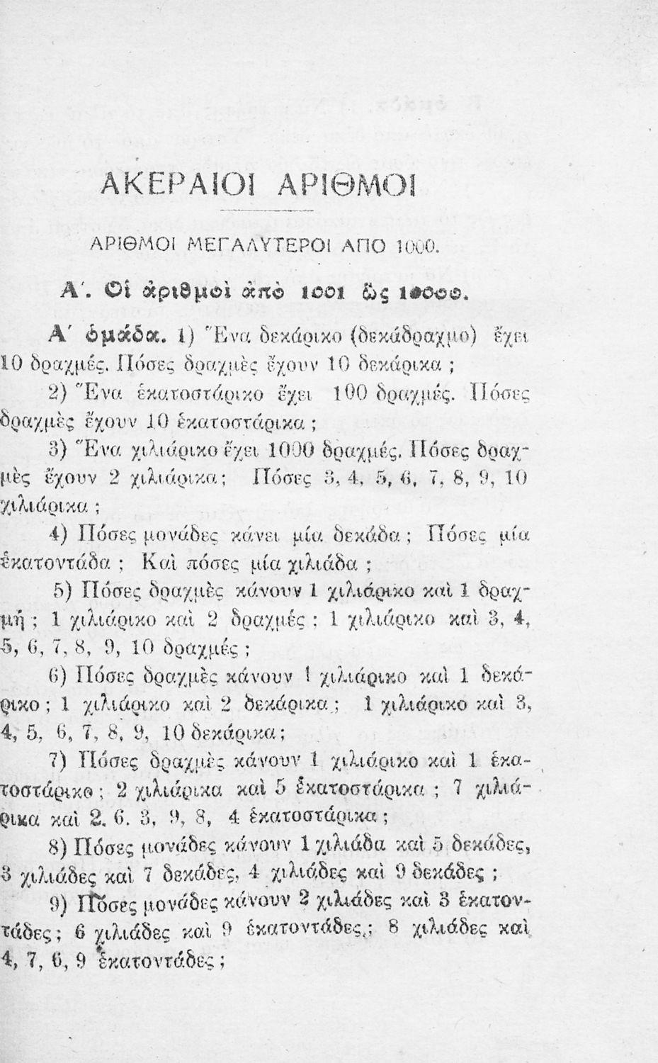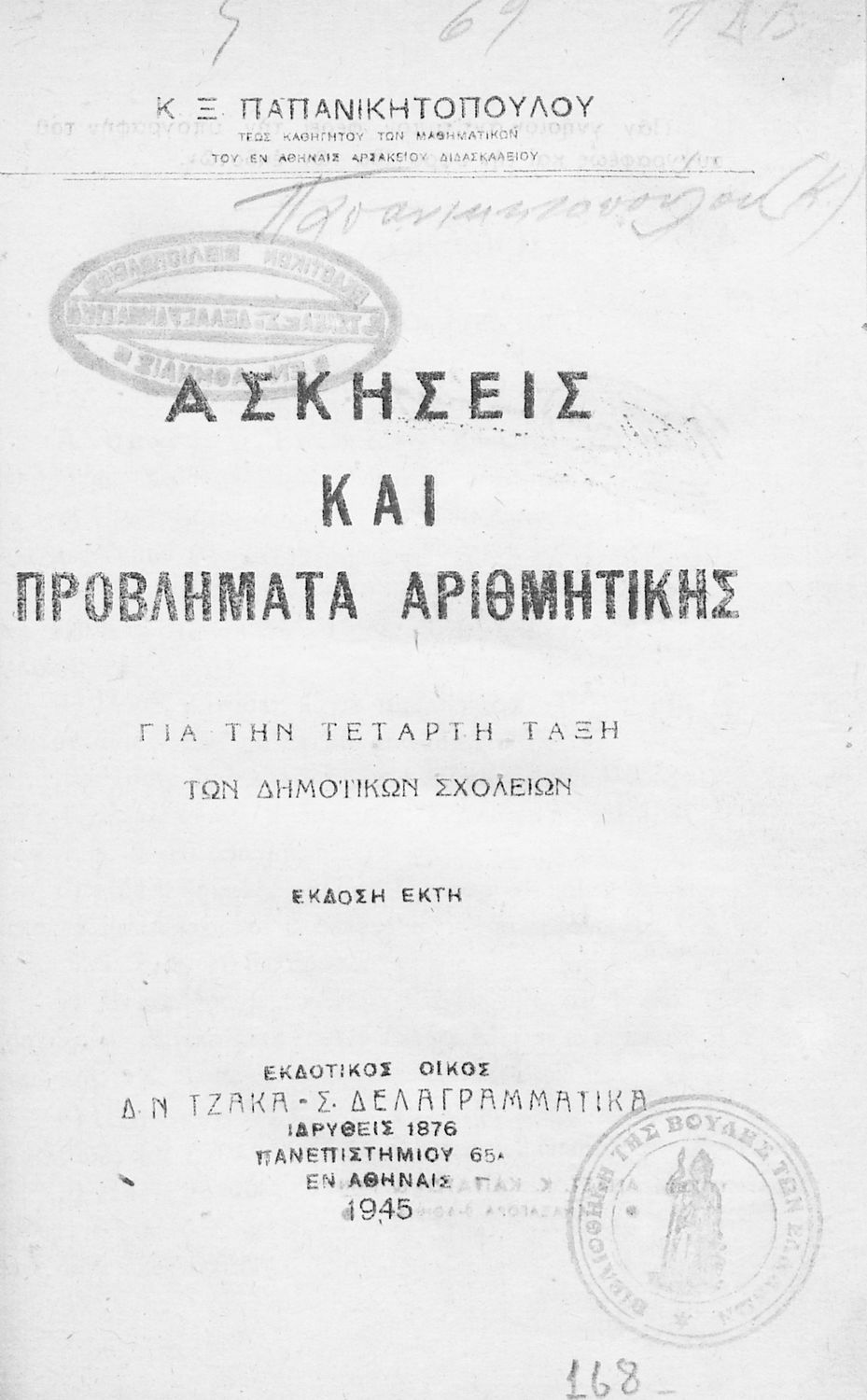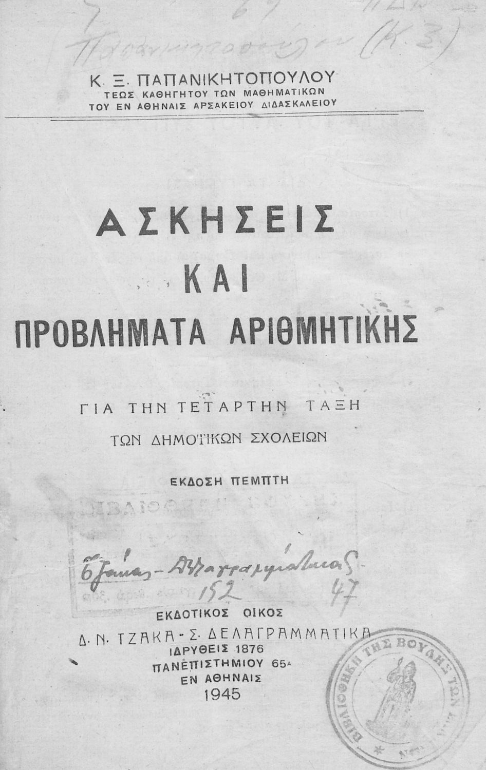 Παρουσίαση περιεχομένου: Το σύγγραμμα ήταν σχολικό εγχειρίδιο για το μάθημα των Μαθηματικών στο Δημοτικό. Περιέχει ασκήσεις και προβλήματα αριθμητικής.