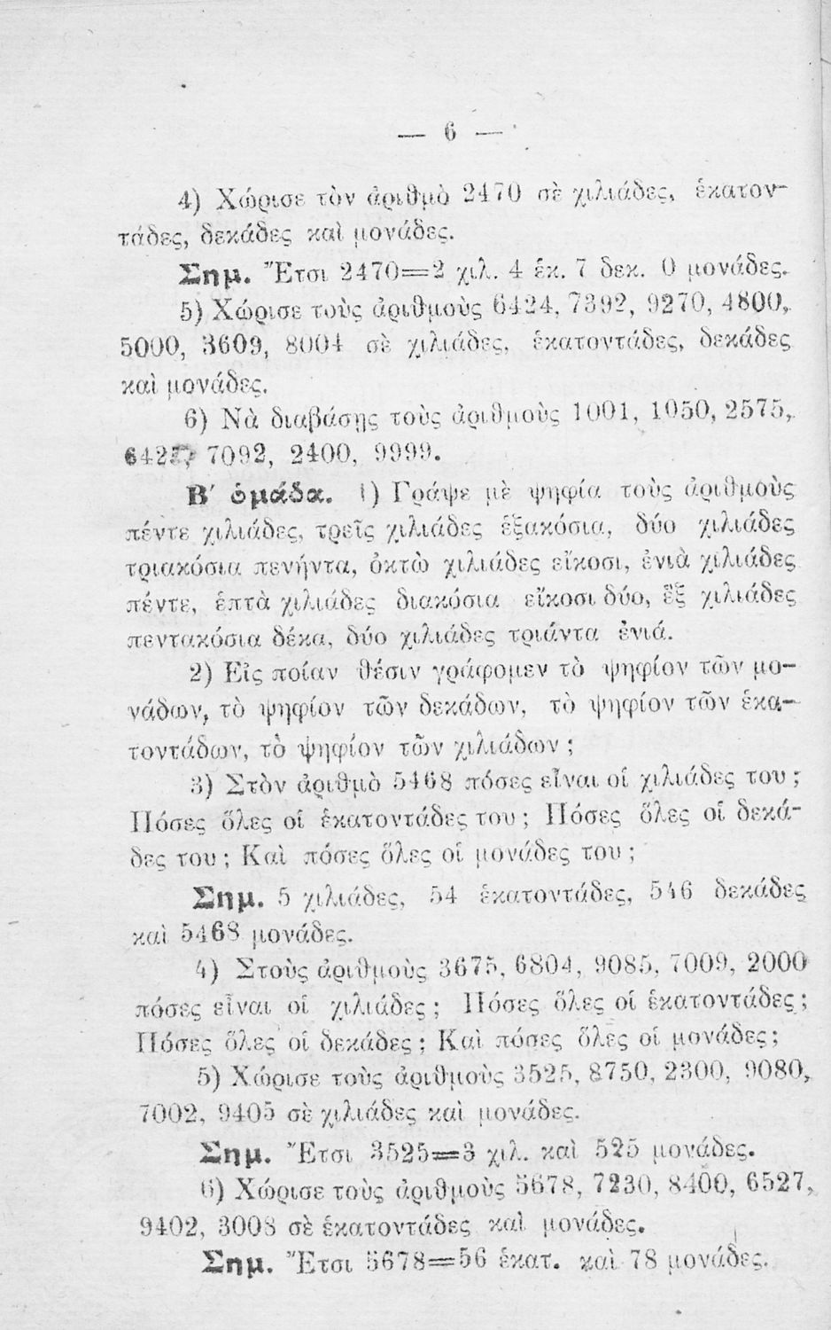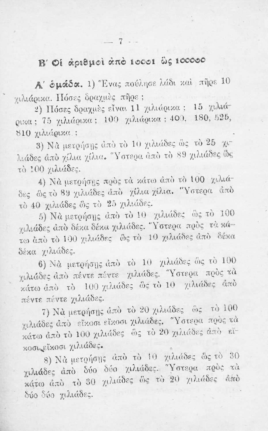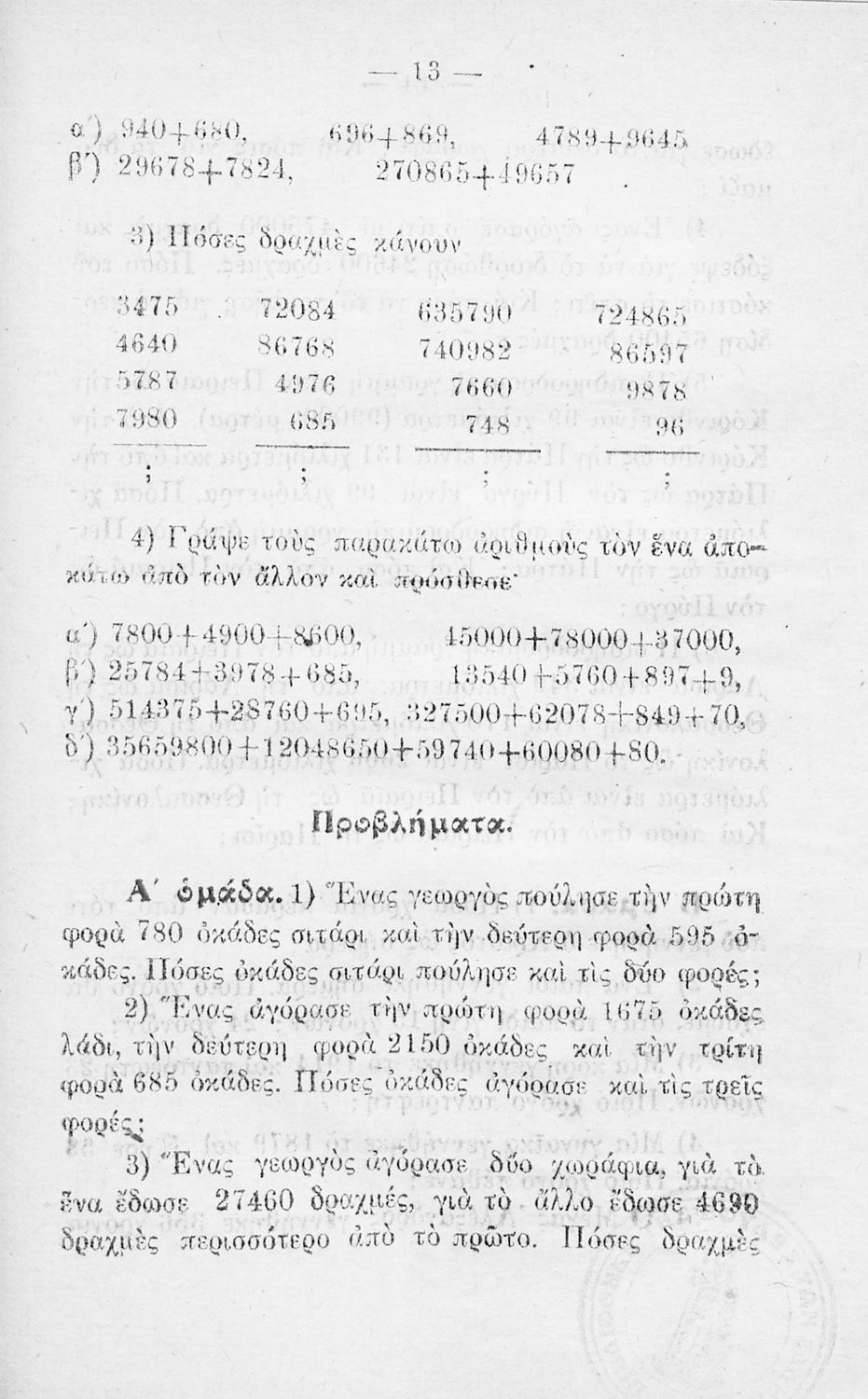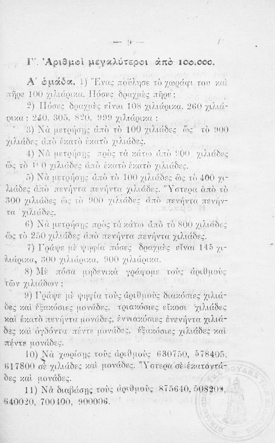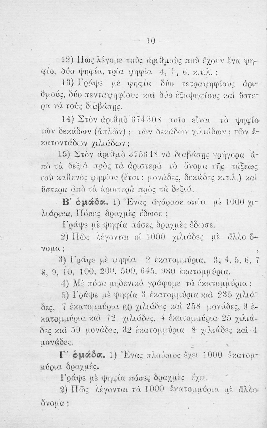 Παρουσίαση περιεχομένου: Το σύγγραμμα ήταν σχολικό εγχειρίδιο για το μάθημα των Μαθηματικών στο Δημοτικό. Περιέχει ασκήσεις και προβλήματα αριθμητικής.
