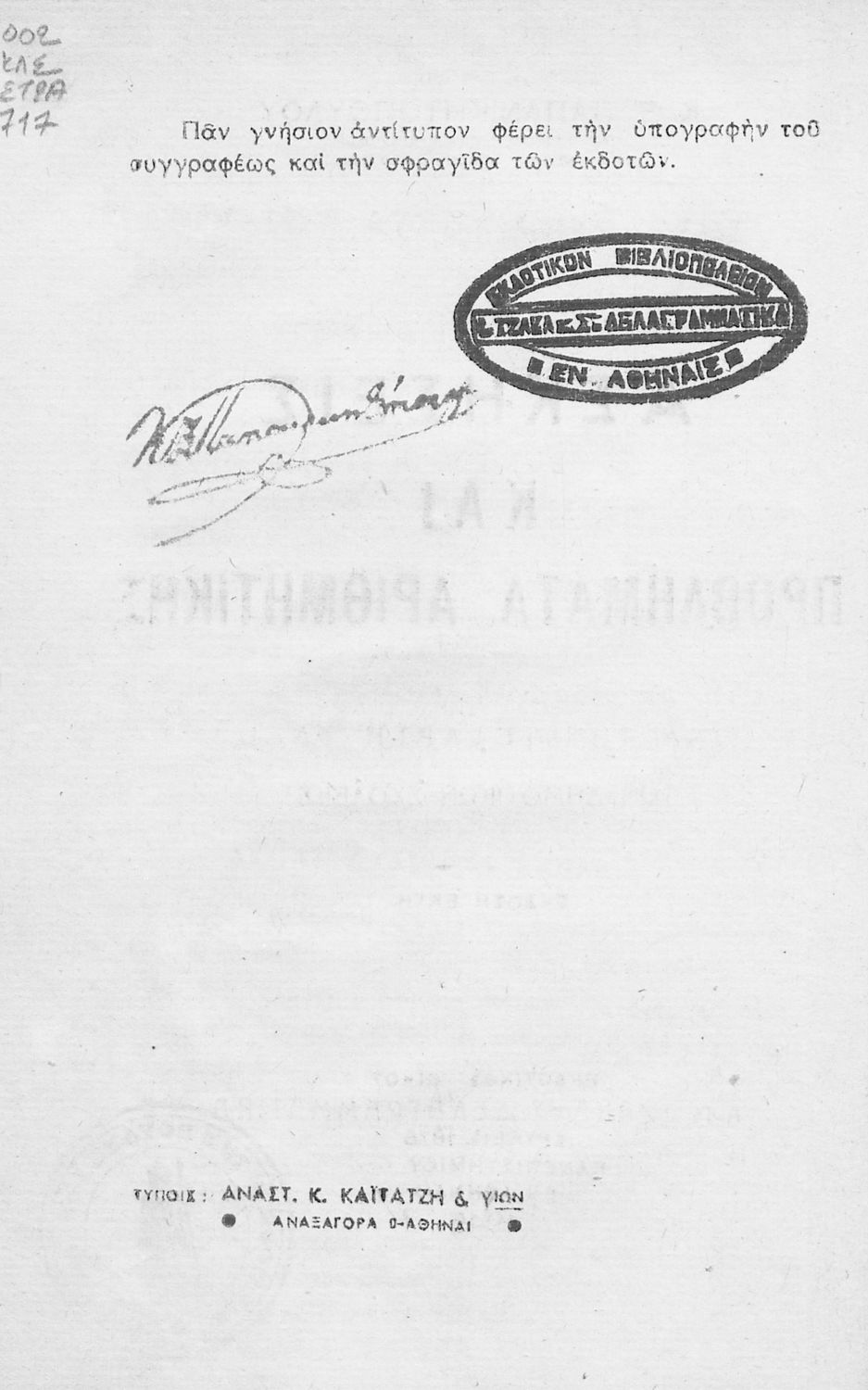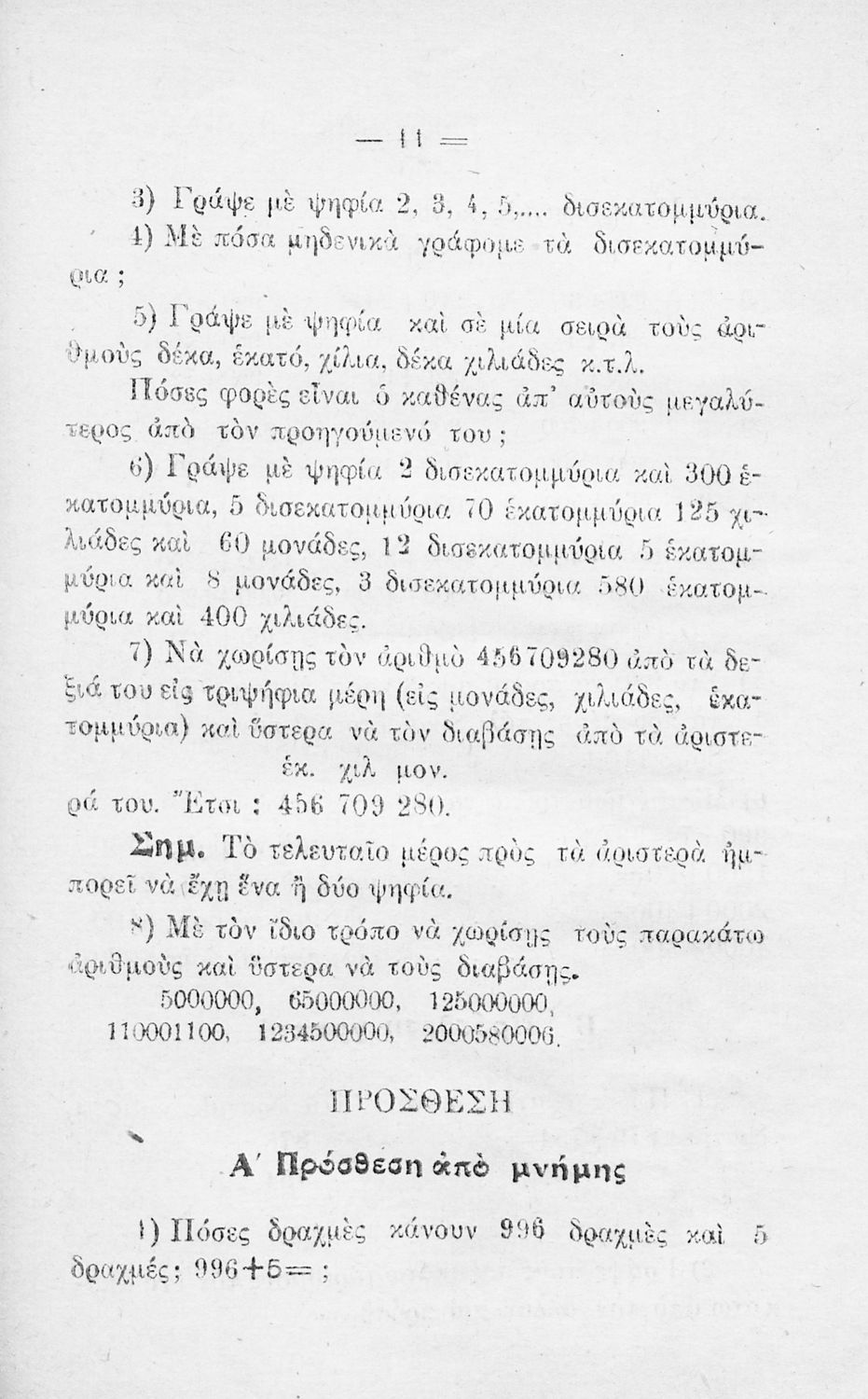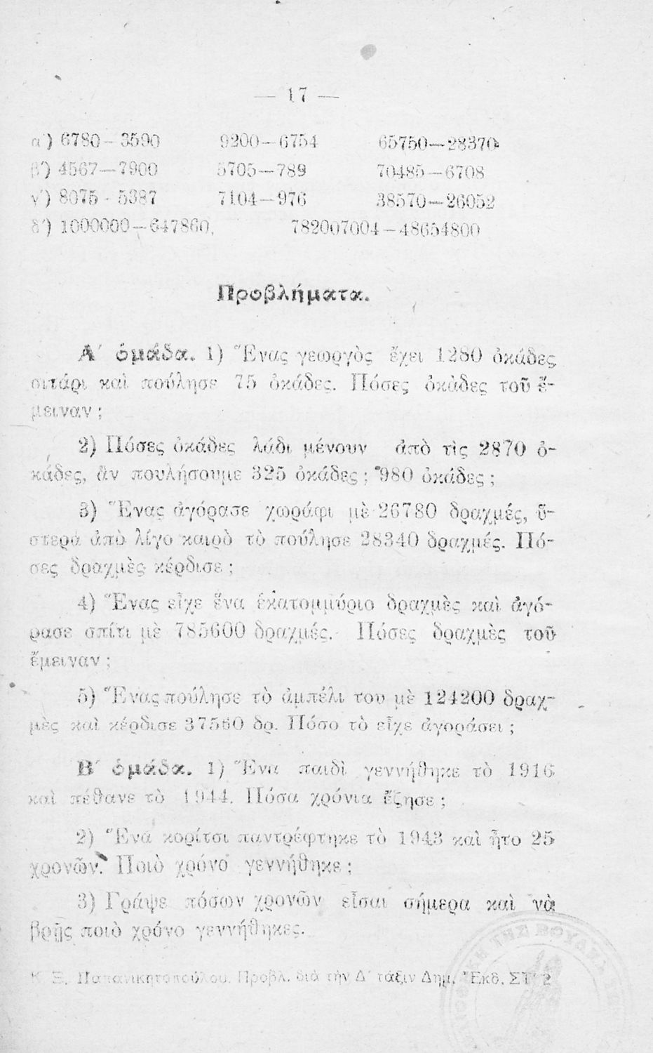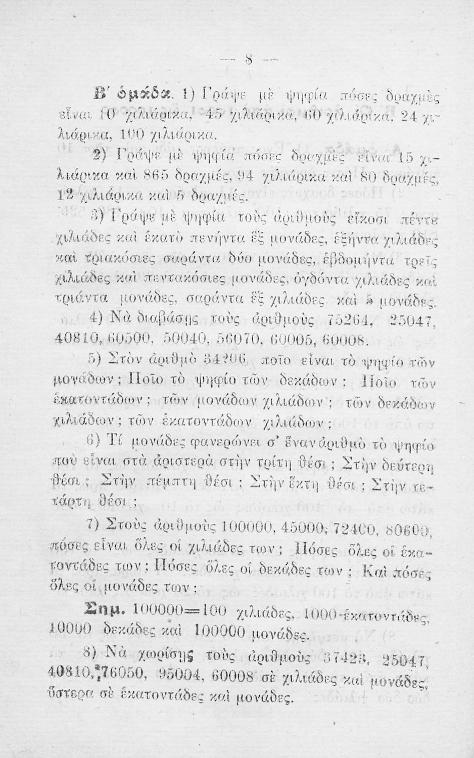 Παρουσίαση περιεχομένου: Το σύγγραμμα ήταν σχολικό εγχειρίδιο για το μάθημα των Μαθηματικών στο Δημοτικό. Περιέχει ασκήσεις και προβλήματα αριθμητικής.