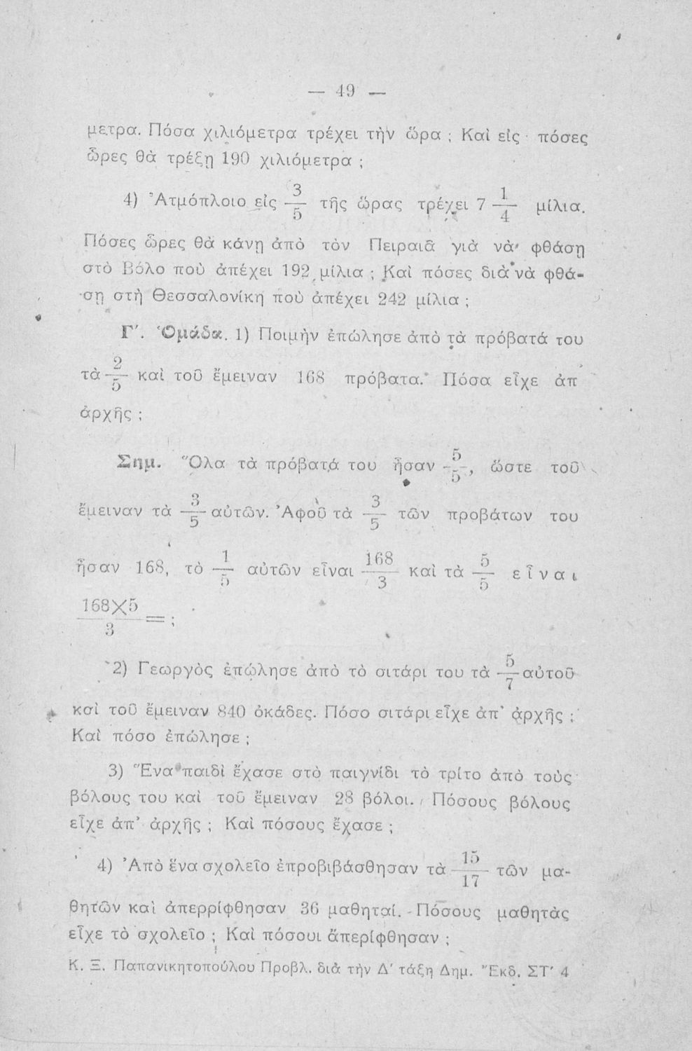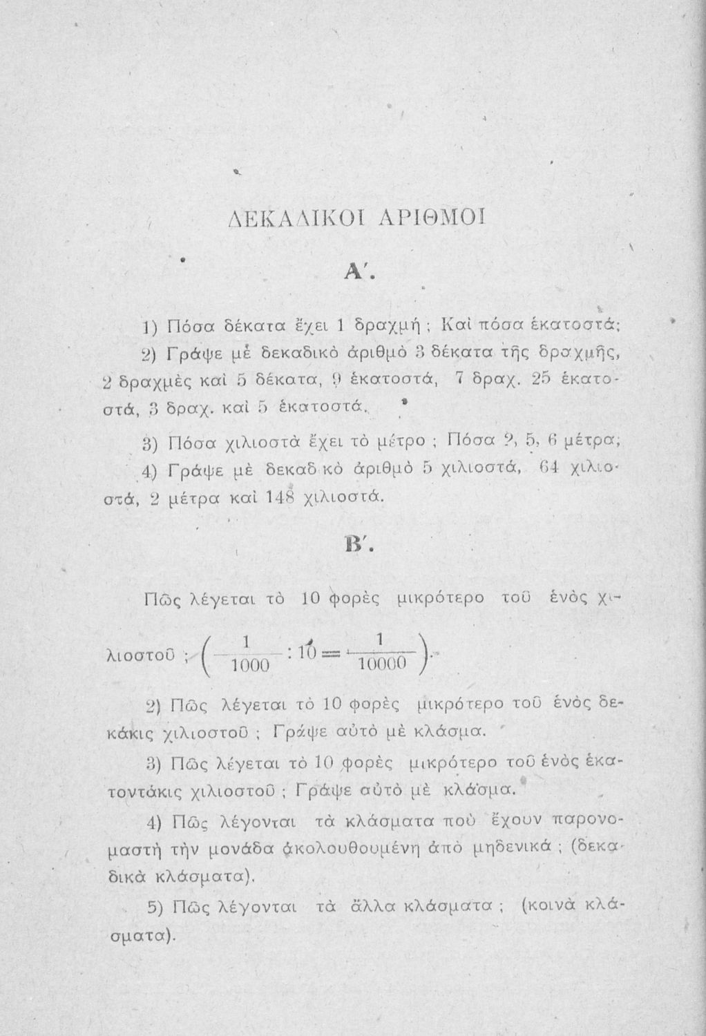 Το σύγγραμμα ήταν μαθητικό βοήθημα για τα Μαθηματικά του Δημοτικού. Περιλαμβάνει ασκήσεις και προβλήματα για την εξάσκηση των μαθητών στις μαθηματικές έννοιες. Αναφέρεται στις 4 βασικές πράξεις περιλαμβάνοντας