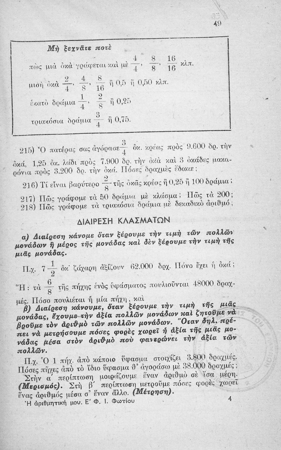Μαθητικό βοήθημα Μαθηματικών Ε΄ Δημοτικού που περιέχει ασκήσεις και προβλήματα αριθμητικής με κλάσματα