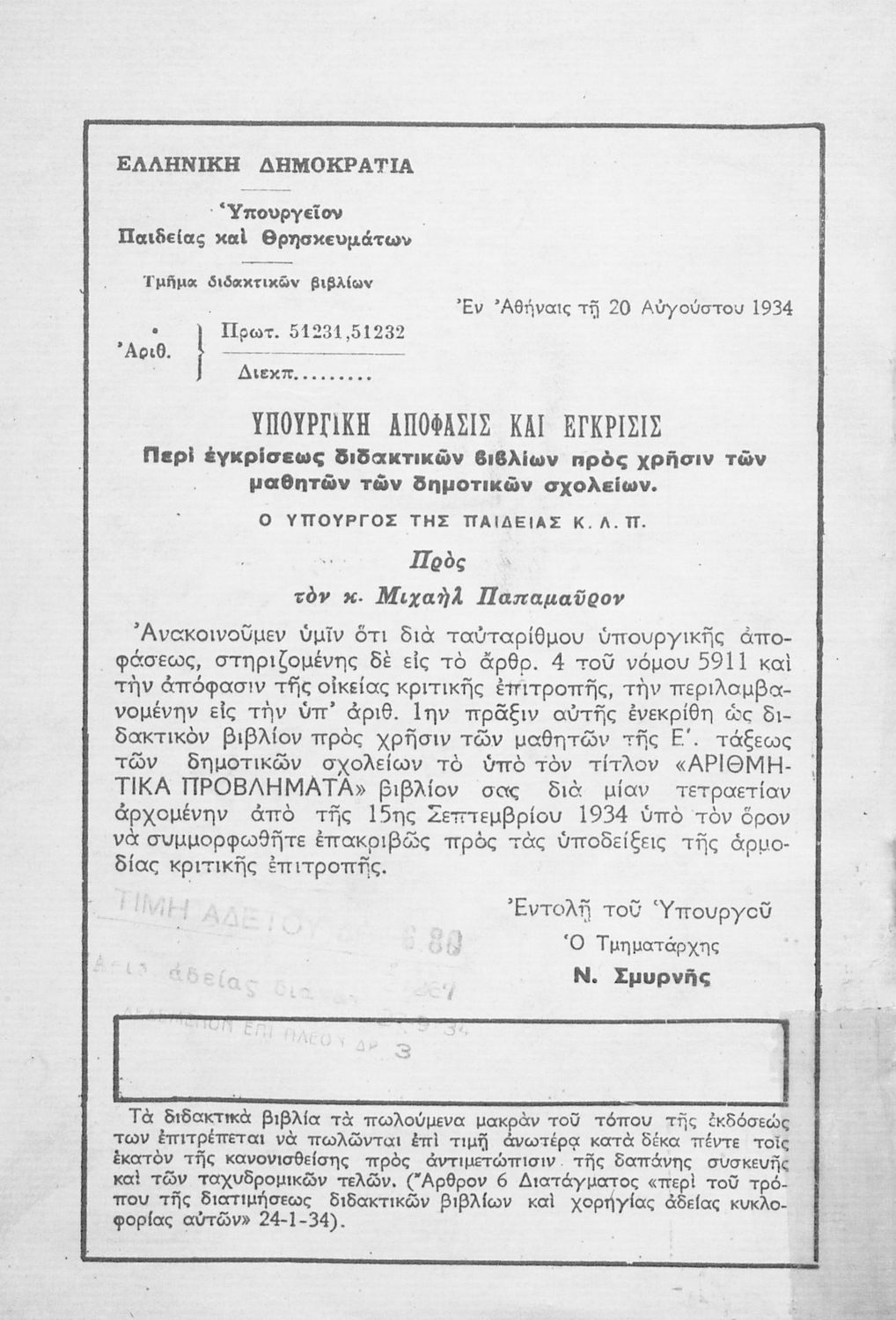 Υπουργική απόφαση / Σύμβαση: 51231,51232/20-8-1934