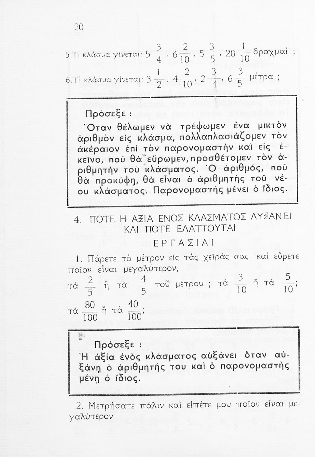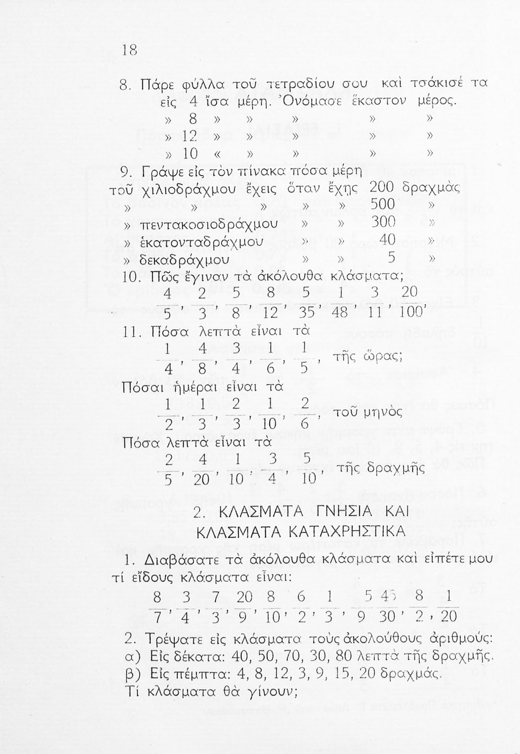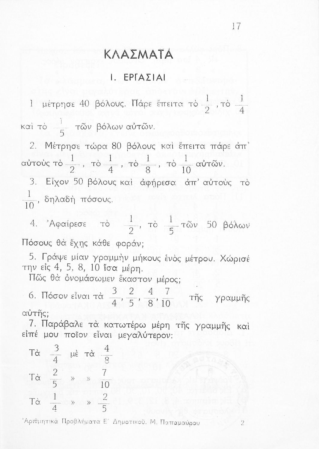 Βαθμίδα εκπαίδευσης: Πρωτοβάθμια Τάξη: Ε' Δημοτικού Μάθημα: Μαθηματικά Γλώσσα: Απλή καθαρεύουσα Παρουσίαση περιεχομένου: Μαθητικό βοήθημα Μαθηματικών Ε΄ Δημοτικού που περιλαμβάνει ασκήσεις και προβλήματα με κλάσματα. |