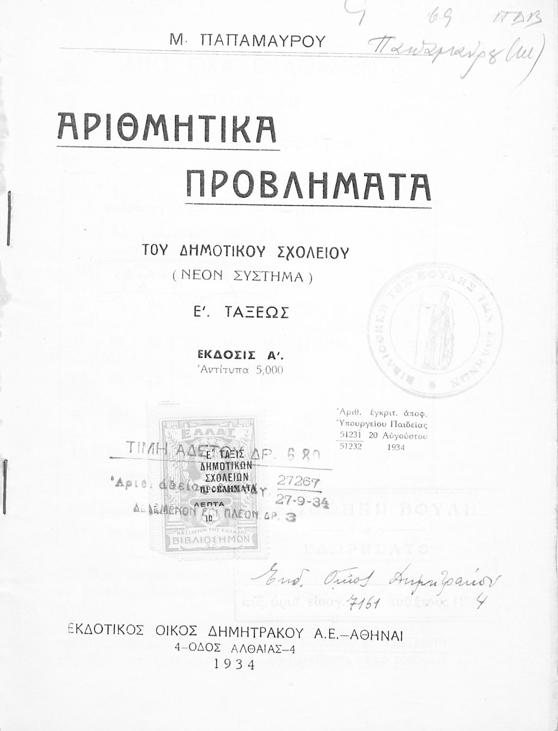 Εκδότης: Δημ. Δημητράκος Έτος έκδοσης: 1934 Τόπος έκδοσης: Αθήνα Έκδοση: 1η Υπουργική απόφαση / Σύμβαση: 51231,51232/20-8-1934 Έτος έγκρισης: 1934 |