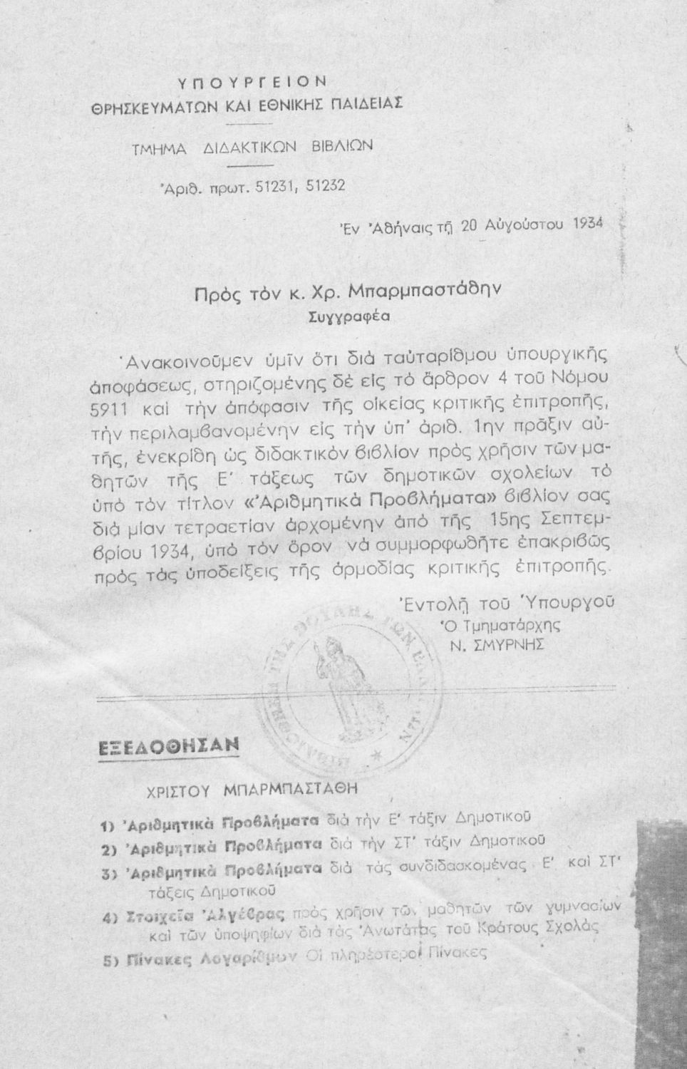 Υπουργική απόφαση / Σύμβαση: 51231/ 51232/ 22-8-1934