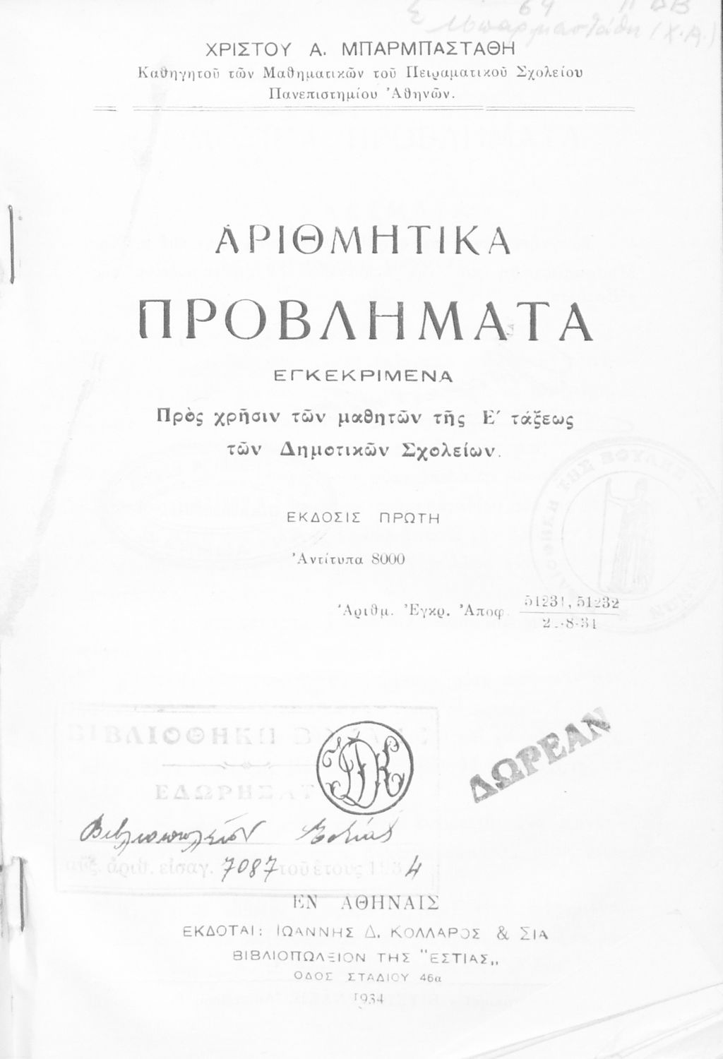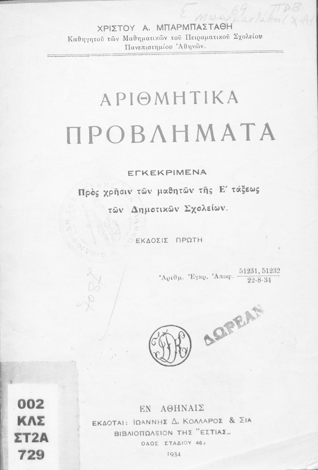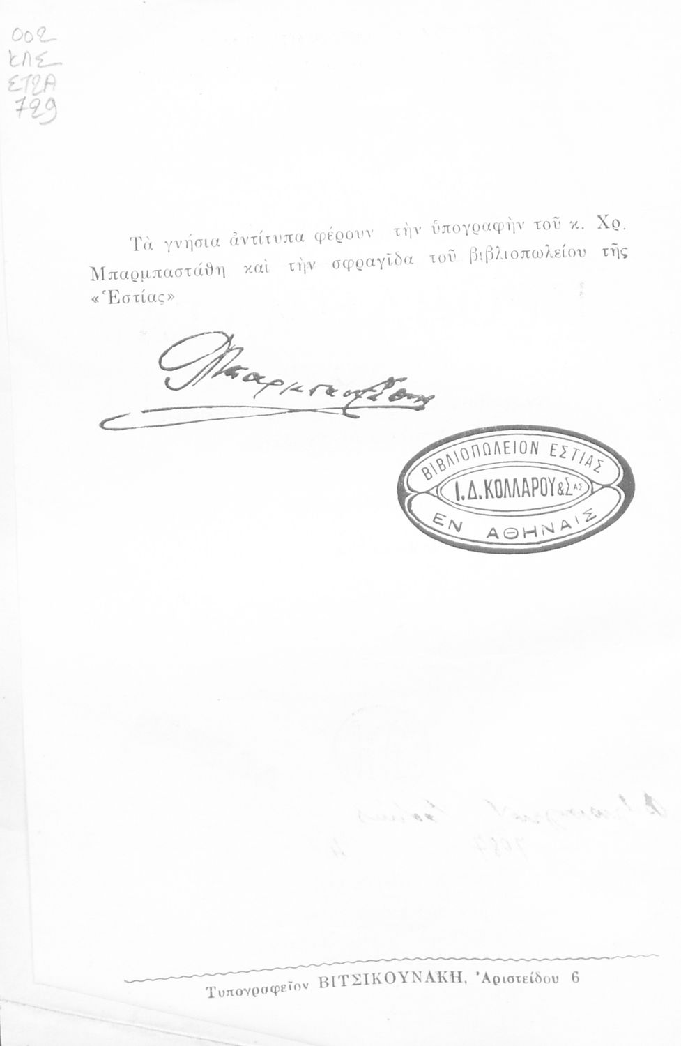 Εκδότης: Ιωάννης Δ. Κολλάρος και ΣΙΑ, Βιβλιοπωλείο της "Εστίας" Έτος έκδοσης: 1934 Τόπος έκδοσης: Αθήνα Έκδοση: 1η Υπουργική απόφαση / Σύμβαση: 51231, 51232/ 20-8-1934 Έτος έγκρισης: 1934 |