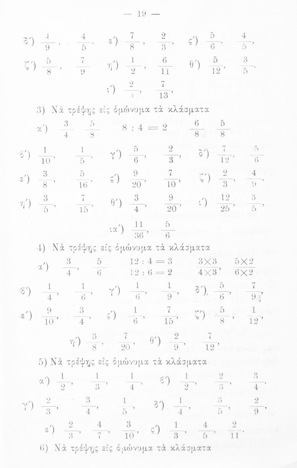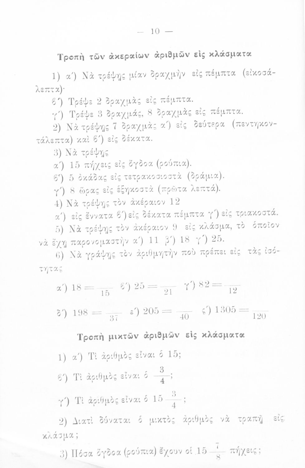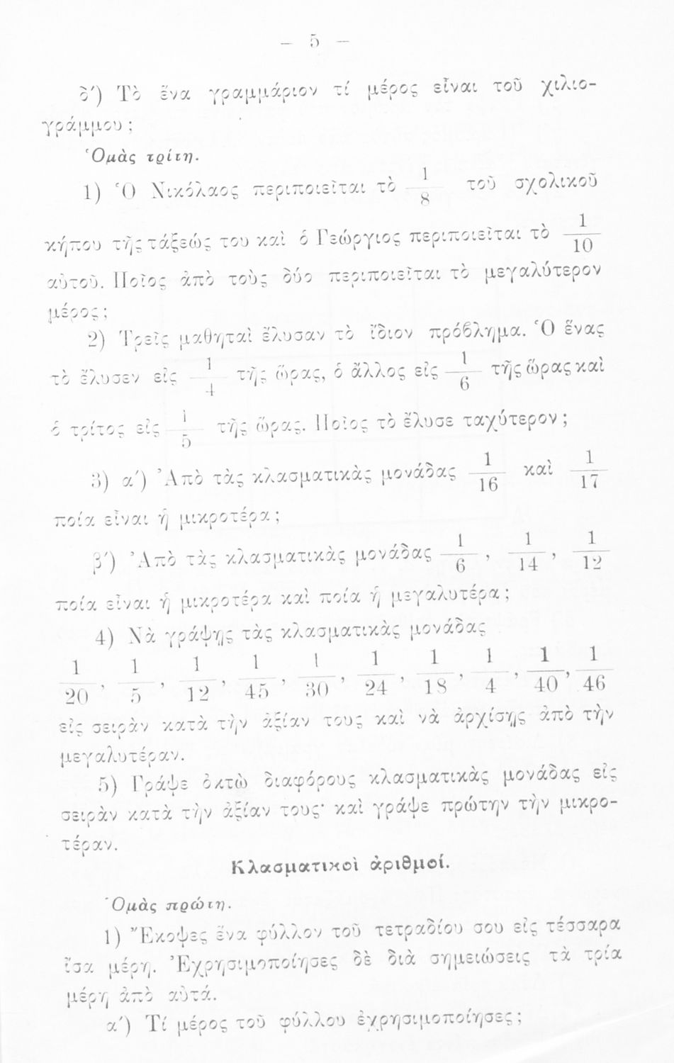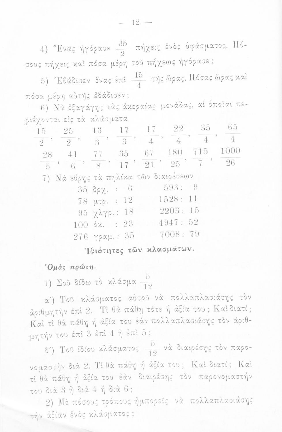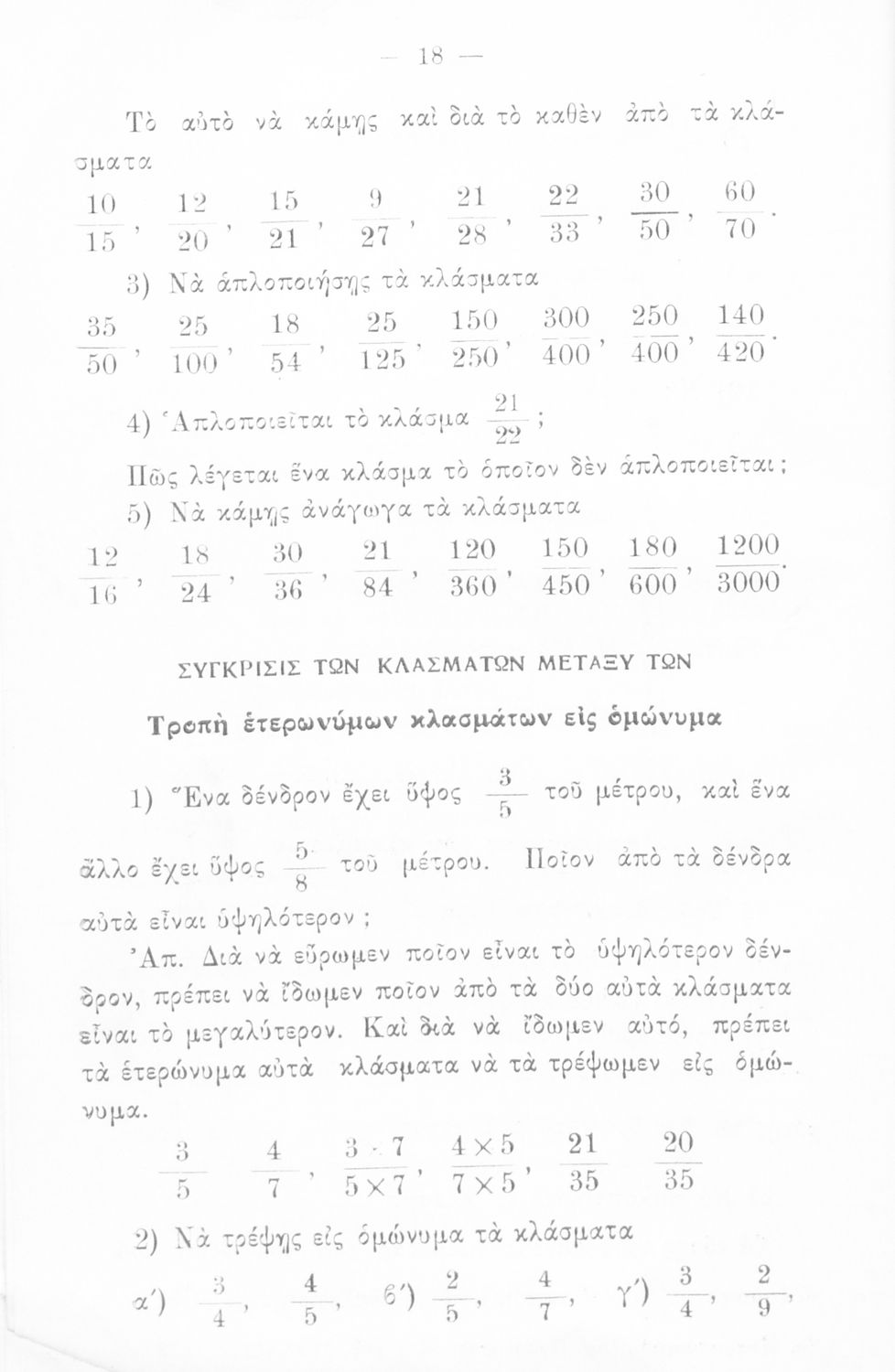 Βαθμίδα εκπαίδευσης: Πρωτοβάθμια Τάξη: Ε' Δημοτικού Μάθημα: Μαθηματικά Γλώσσα: Απλή καθαρεύουσα Παρουσίαση περιεχομένου: Μαθητικό βοήθημα Μαθηματικών. Ε΄ Δημοτικού που εστιάζει στις τέσσερις αριθμητικές πράξεις μεταξύ κλασμάτων. |