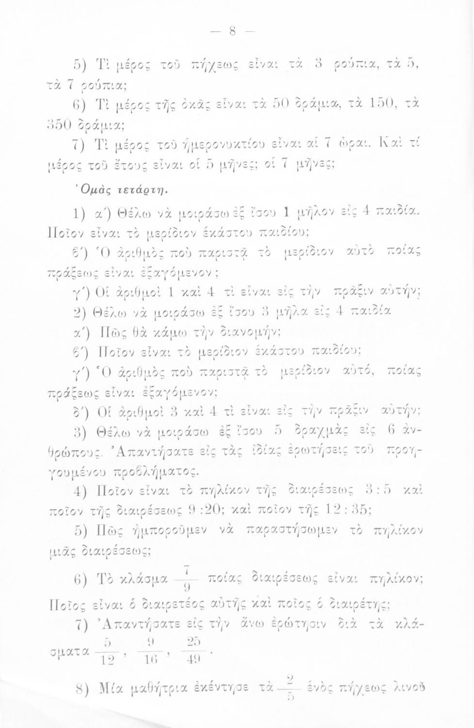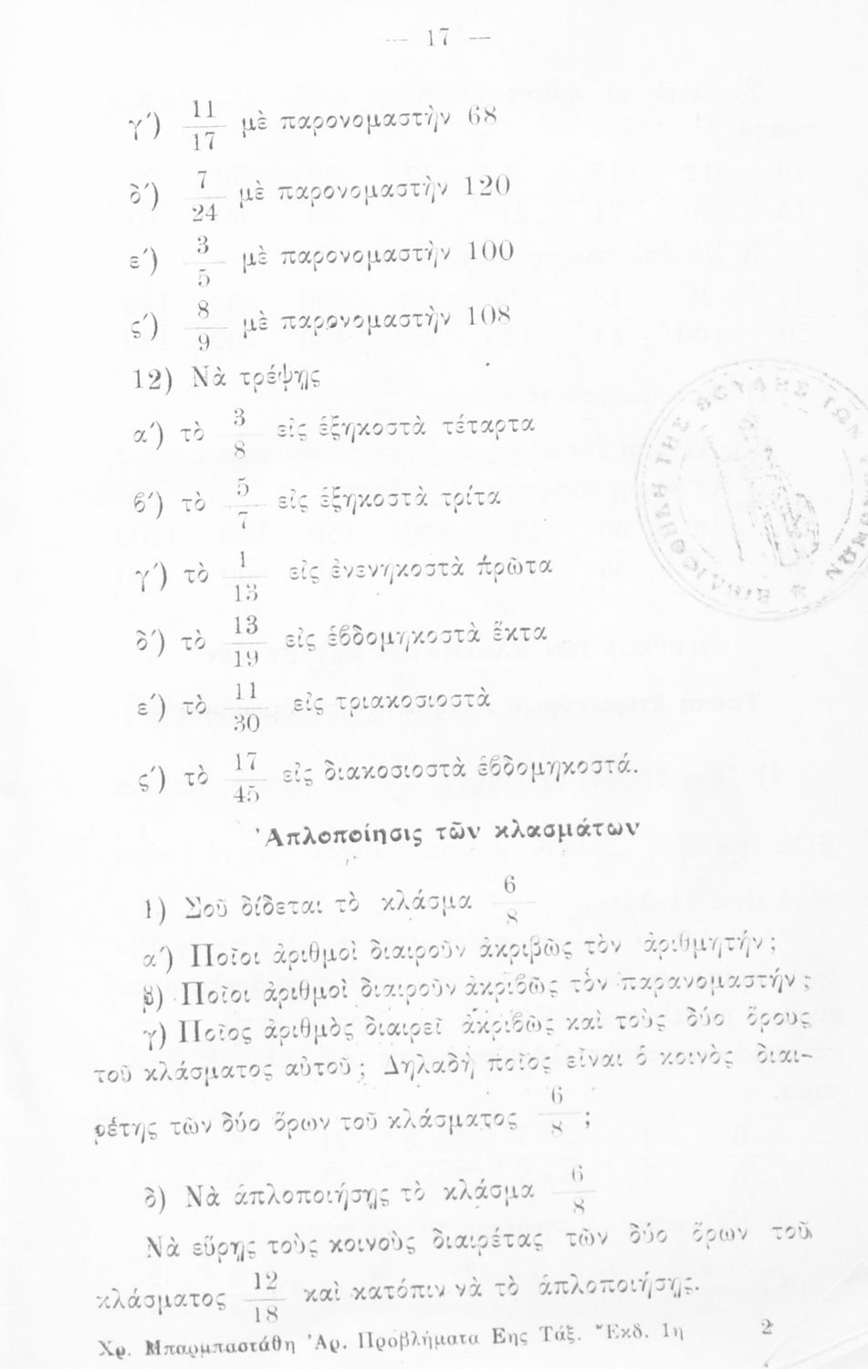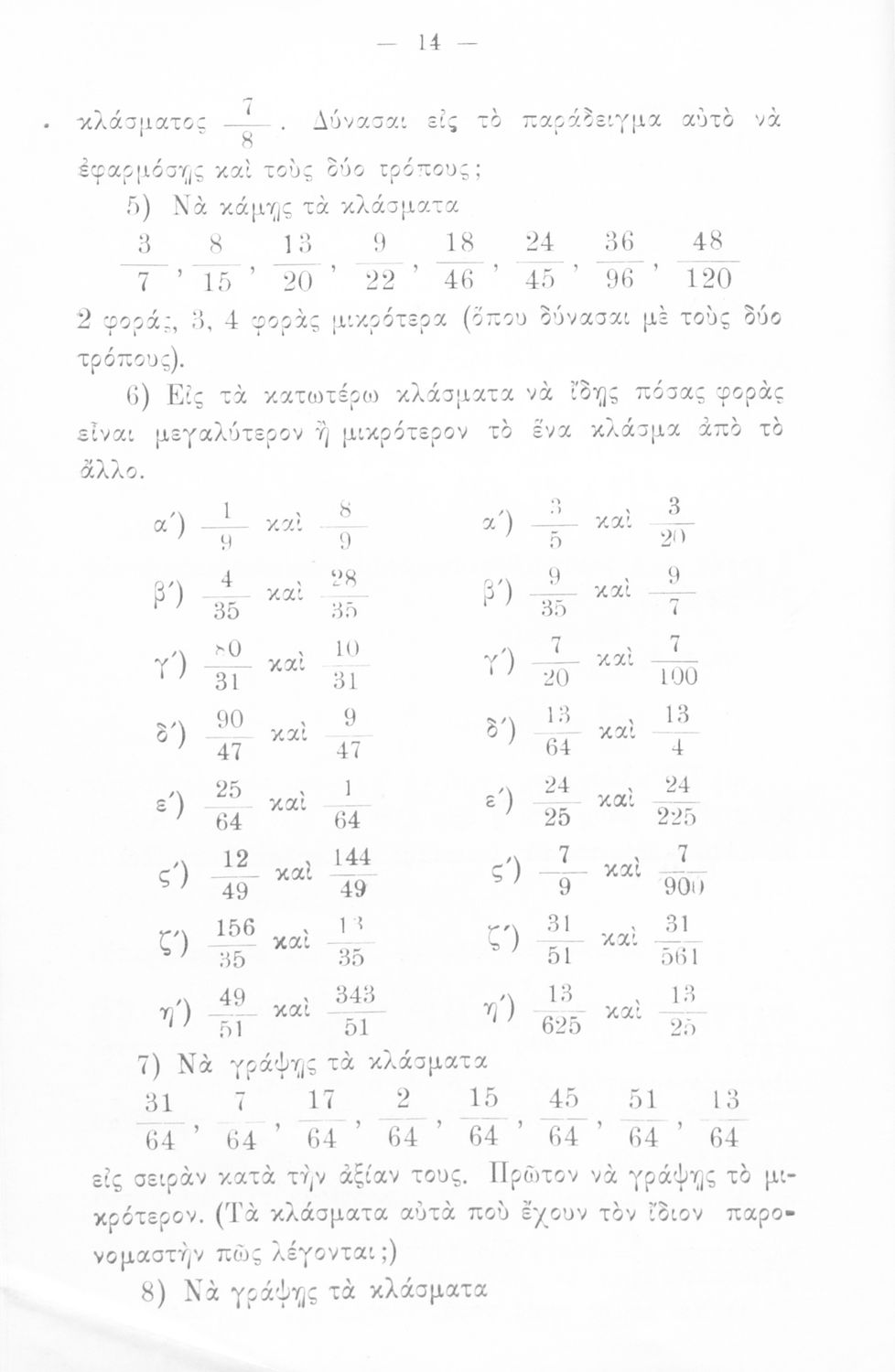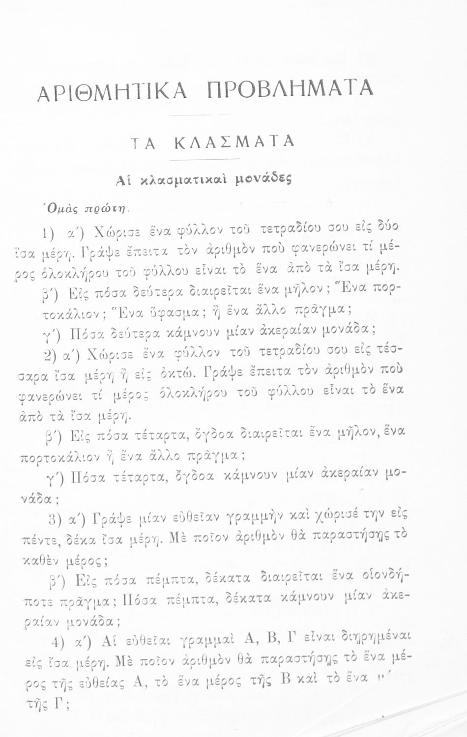Βαθμίδα εκπαίδευσης: Πρωτοβάθμια Τάξη: Ε' Δημοτικού Μάθημα: Μαθηματικά Γλώσσα: Απλή καθαρεύουσα Παρουσίαση περιεχομένου: Μαθητικό βοήθημα Μαθηματικών. Ε΄ Δημοτικού που εστιάζει στις τέσσερις αριθμητικές πράξεις μεταξύ κλασμάτων. |
