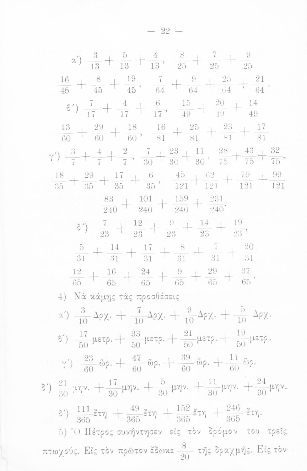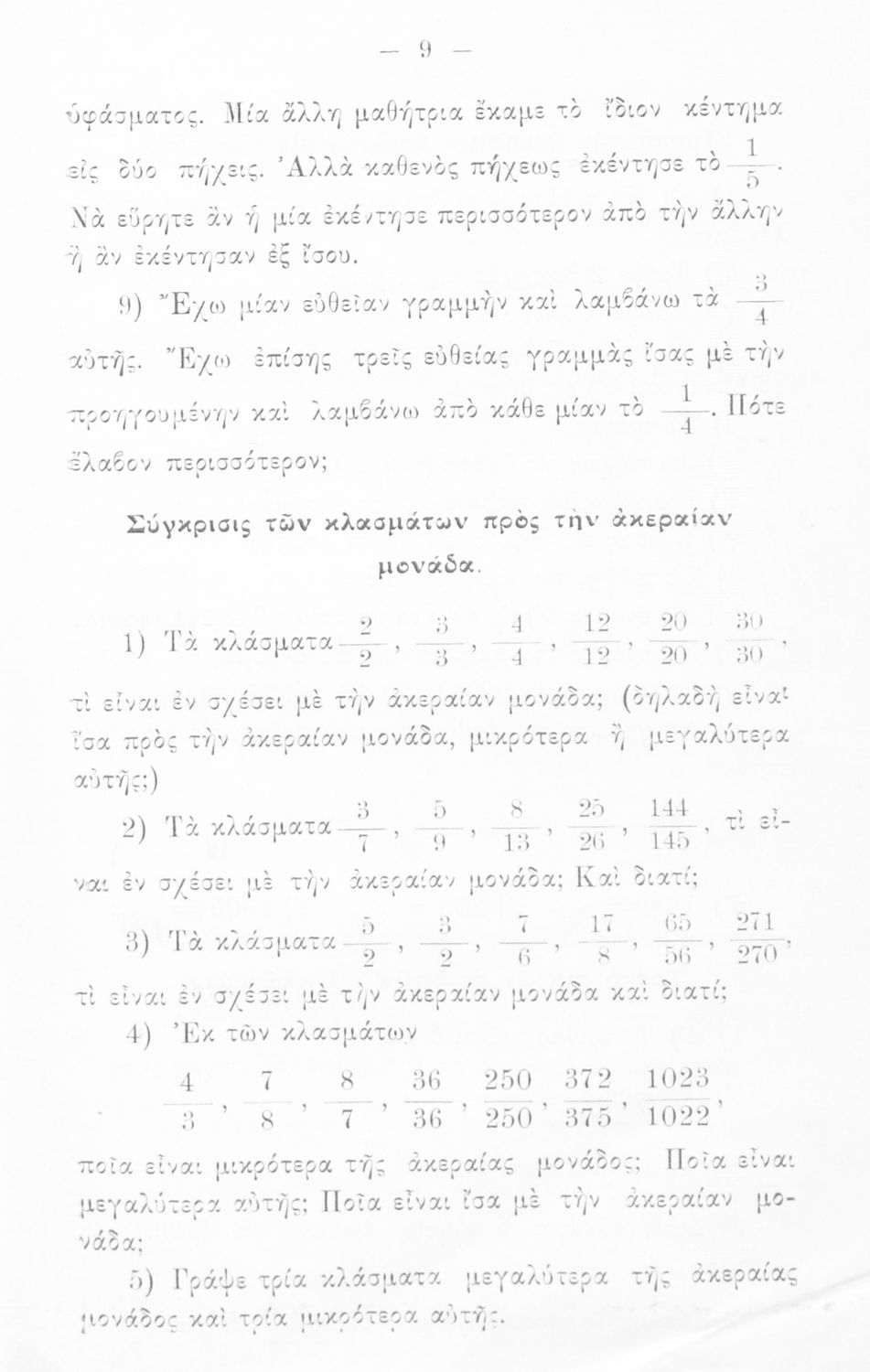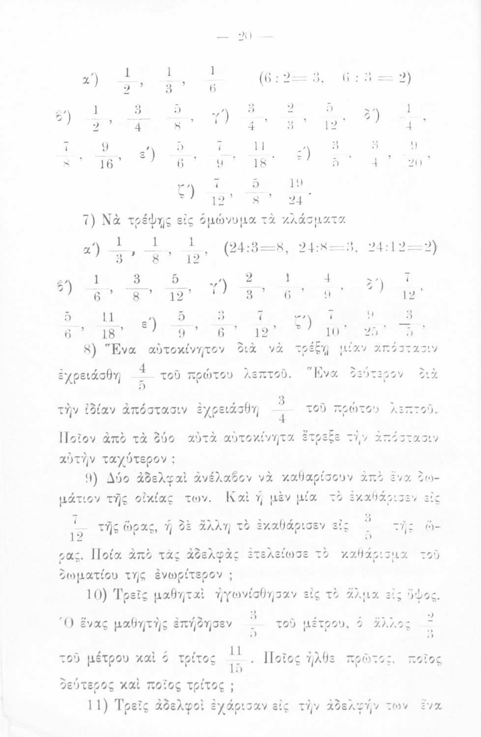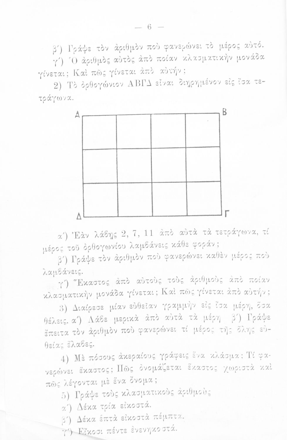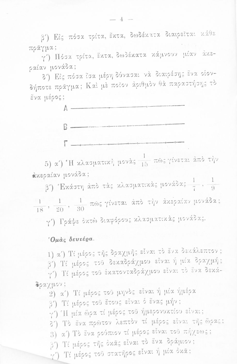 Βαθμίδα εκπαίδευσης: Πρωτοβάθμια Τάξη: Ε' Δημοτικού Μάθημα: Μαθηματικά Γλώσσα: Απλή καθαρεύουσα Παρουσίαση περιεχομένου: Μαθητικό βοήθημα Μαθηματικών. Ε΄ Δημοτικού που εστιάζει στις τέσσερις αριθμητικές πράξεις μεταξύ κλασμάτων. |