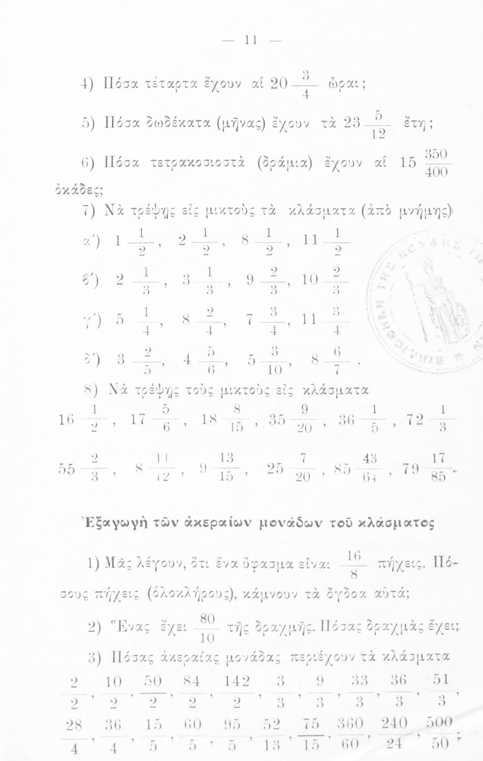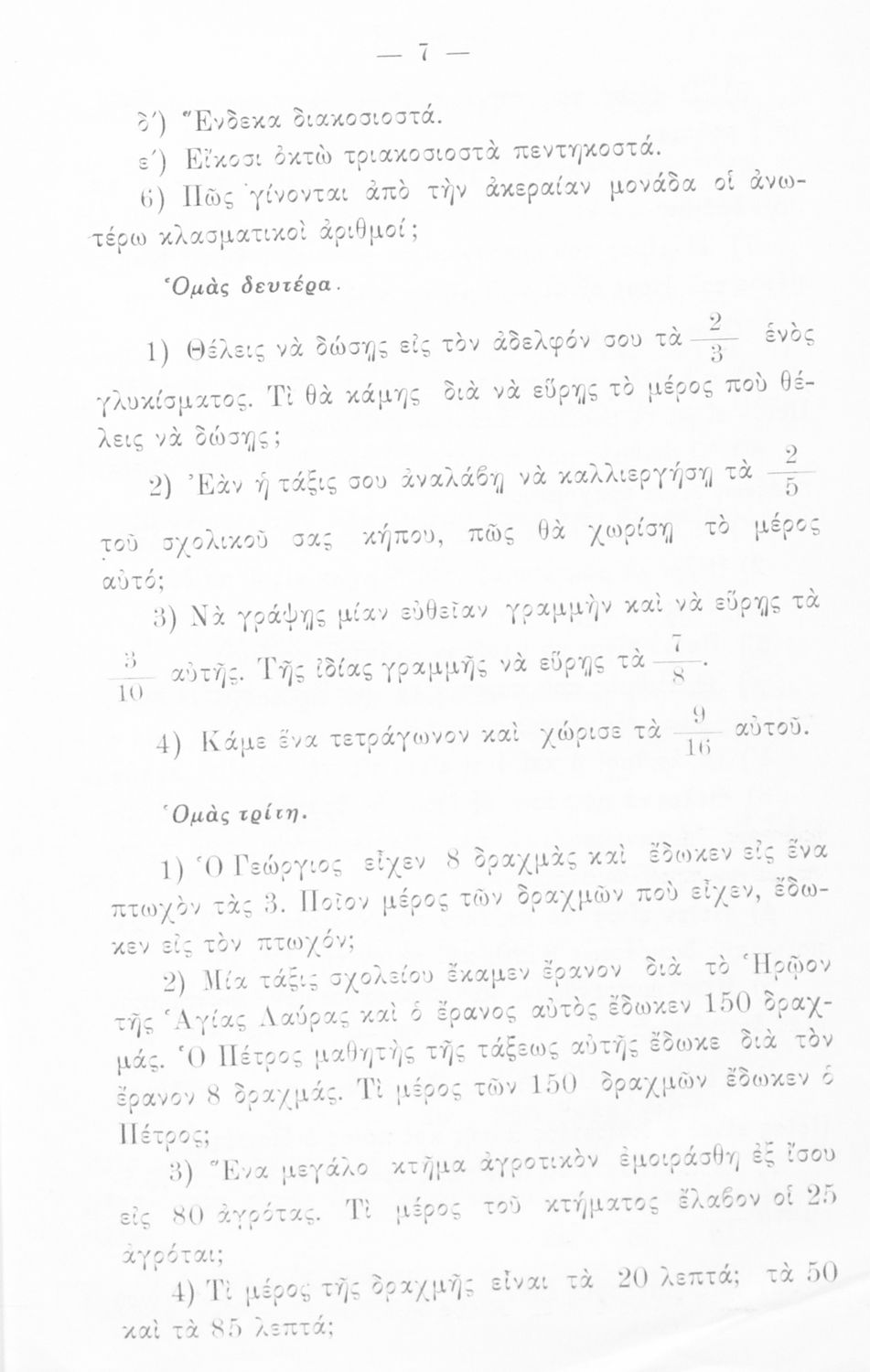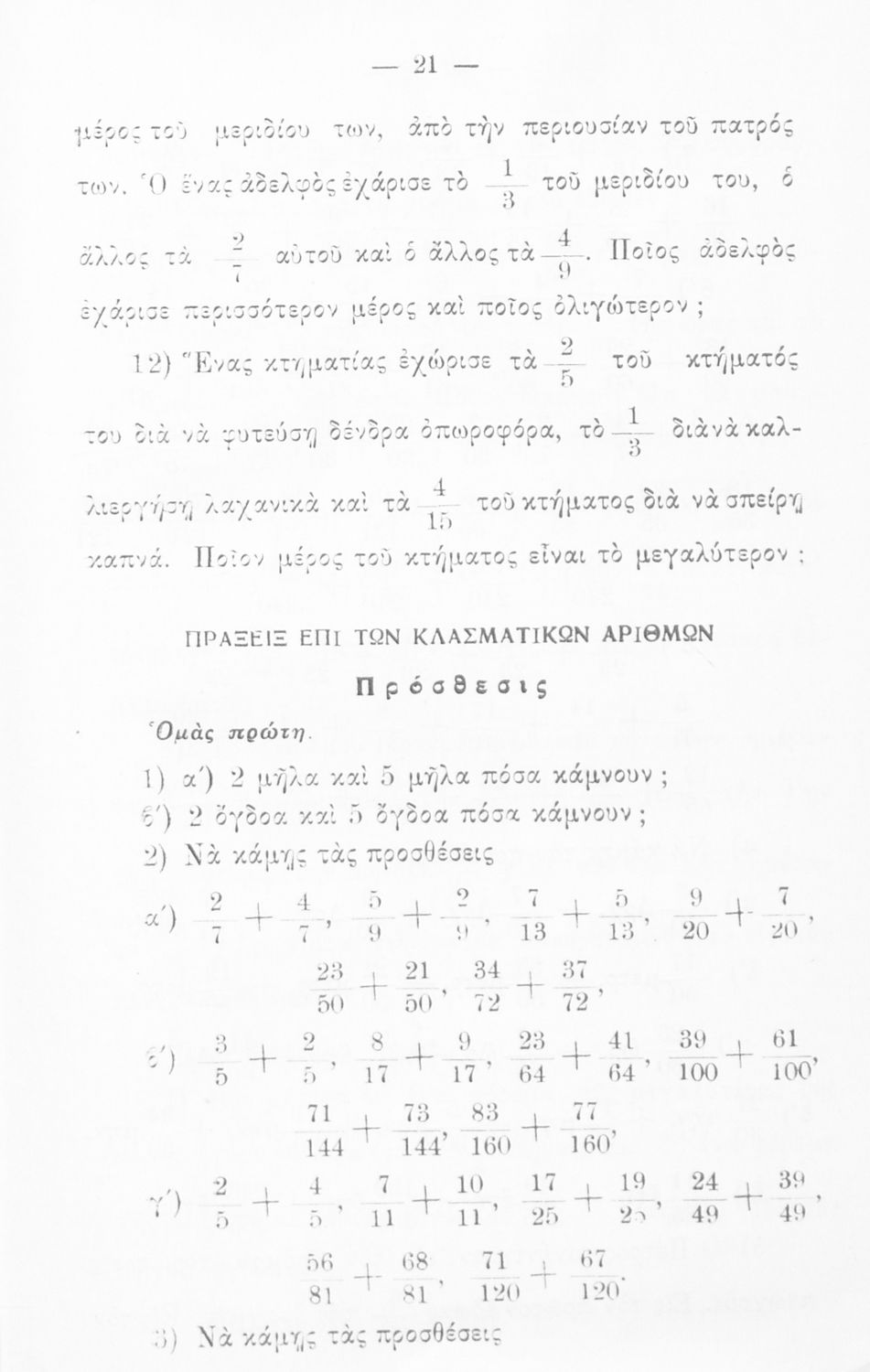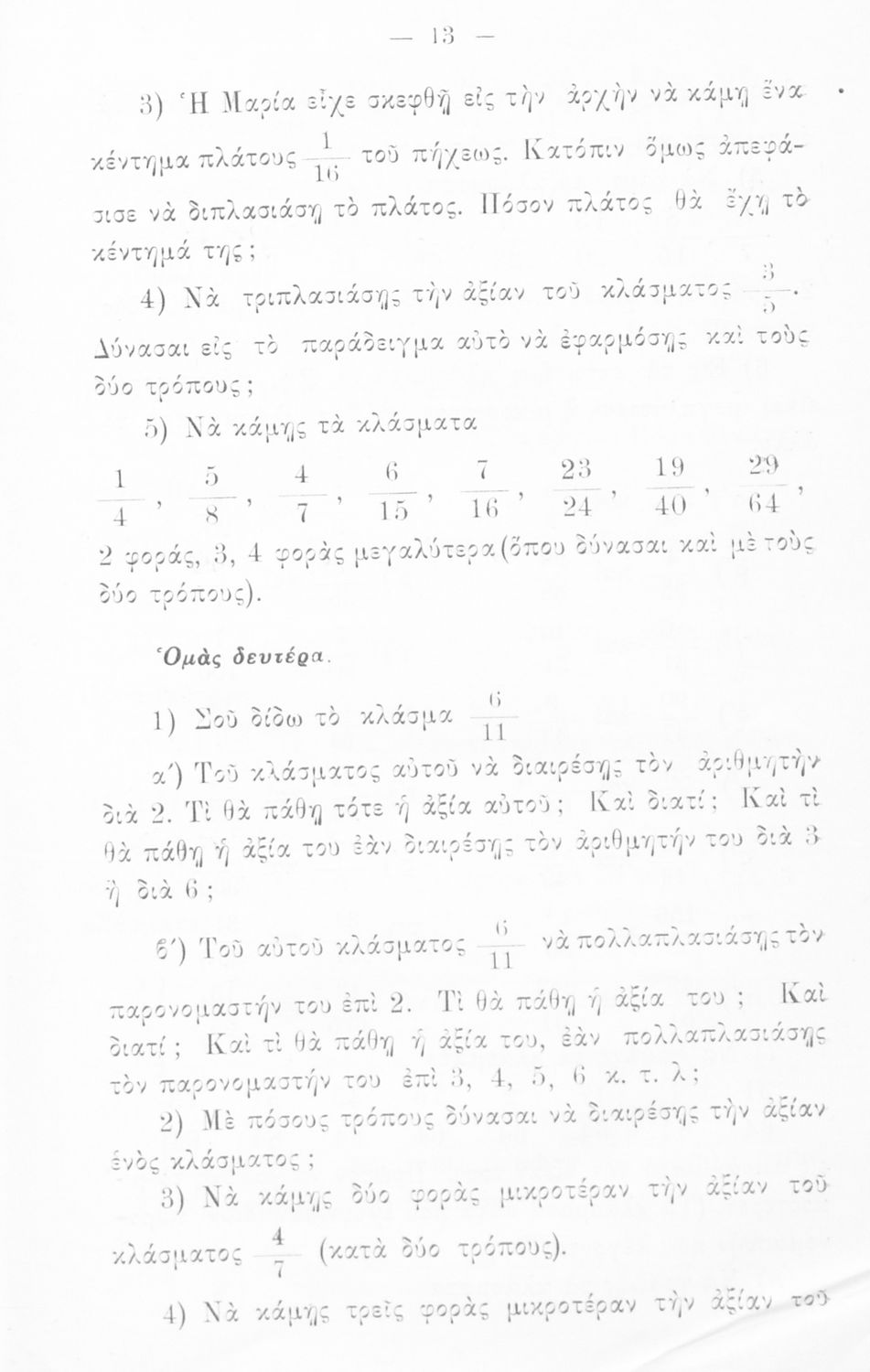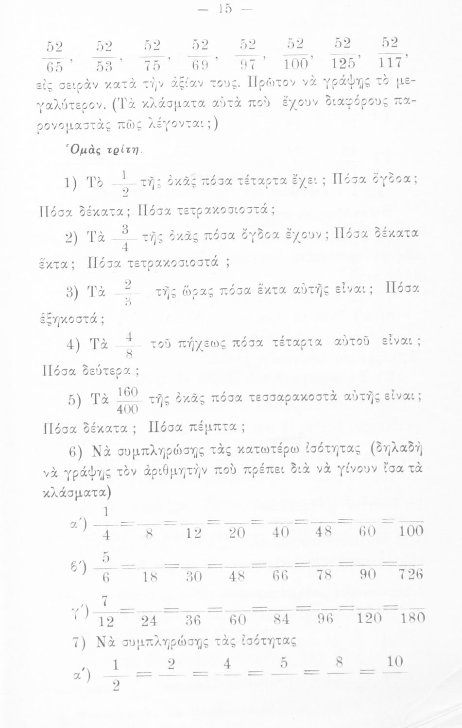 Βαθμίδα εκπαίδευσης: Πρωτοβάθμια Τάξη: Ε' Δημοτικού Μάθημα: Μαθηματικά Γλώσσα: Απλή καθαρεύουσα Παρουσίαση περιεχομένου: Μαθητικό βοήθημα Μαθηματικών. Ε΄ Δημοτικού που εστιάζει στις τέσσερις αριθμητικές πράξεις μεταξύ κλασμάτων. |