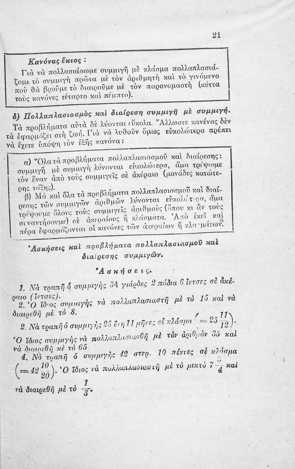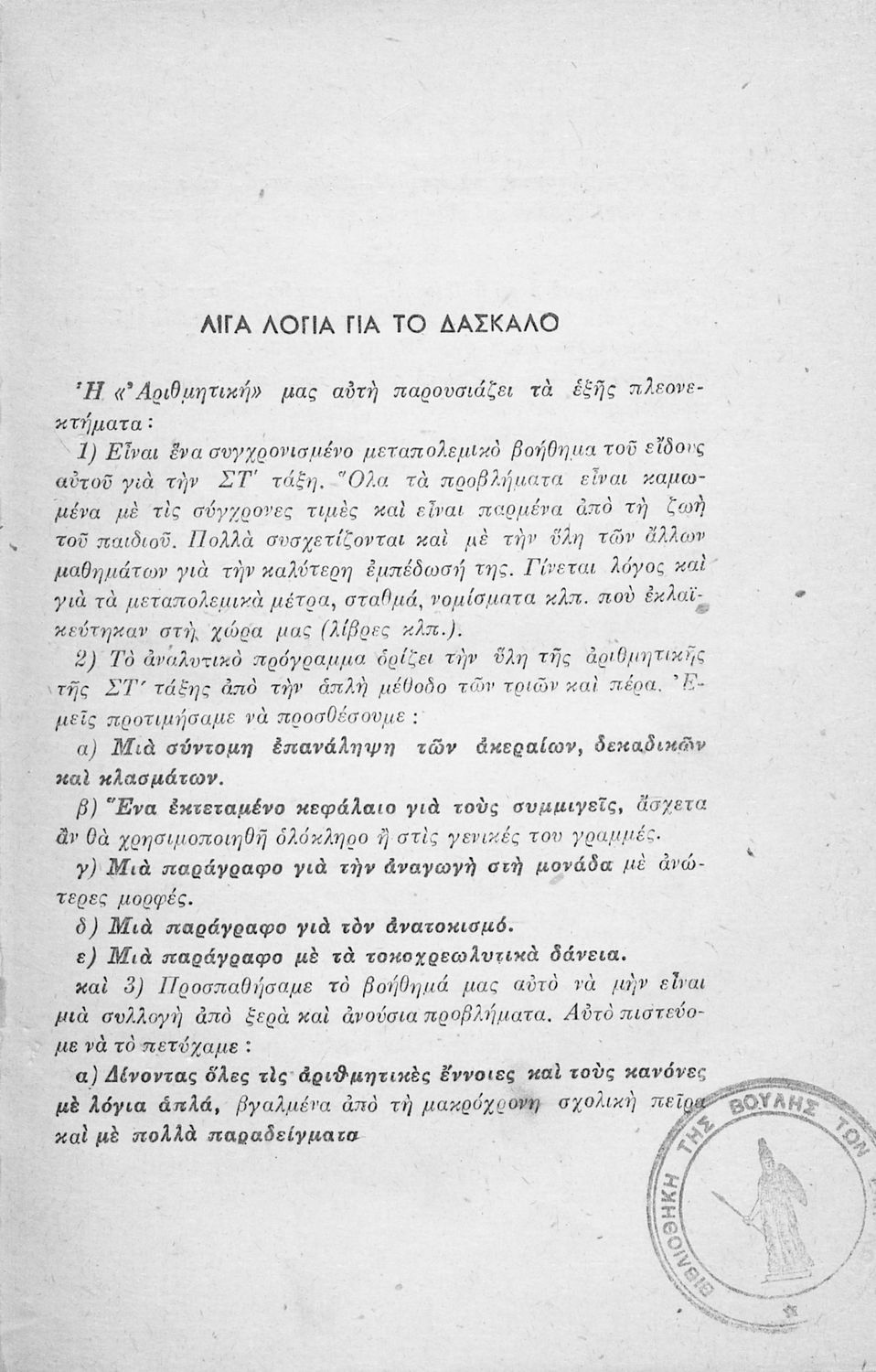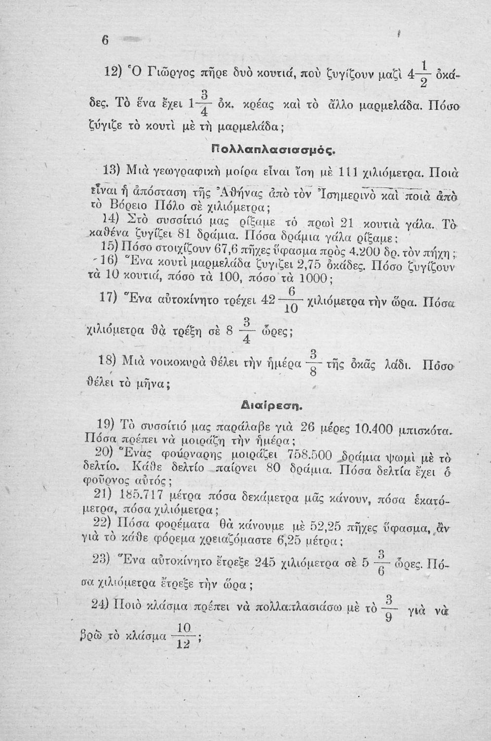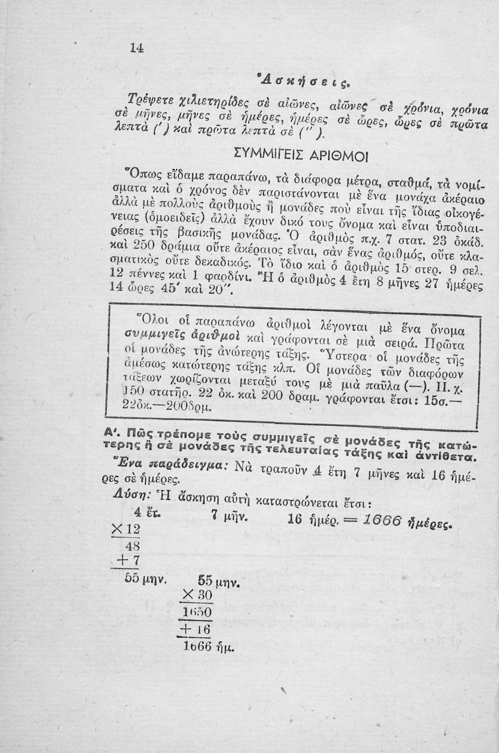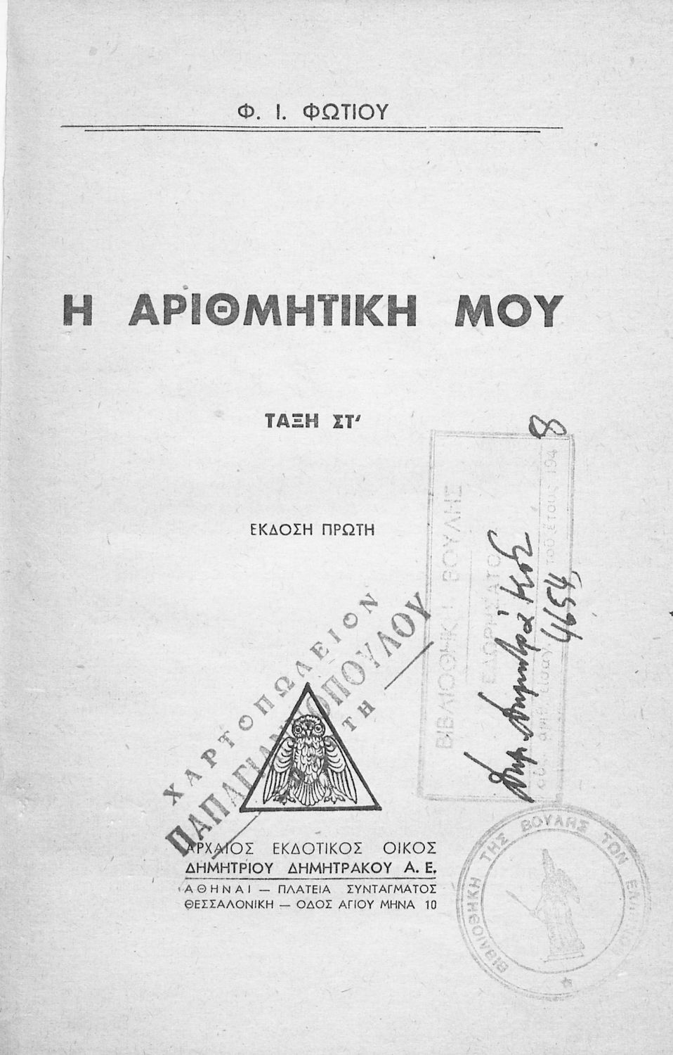Βαθμίδα εκπαίδευσης: Πρωτοβάθμια Τάξη: ΣΤ' Δημοτικού Μάθημα: Μαθηματικά Γλώσσα: Απλή καθαρεύουσα Παρουσίαση περιεχομένου: Μαθητικό βοήθημα Αριθμητικής ΣΤ΄ Δημοτικού που εστιάζει στις αριθμητικές πράξεις με συμμιγείς αριθμούς, τη μέθοδο των τριών και την αναγωγή στη μονάδα. |