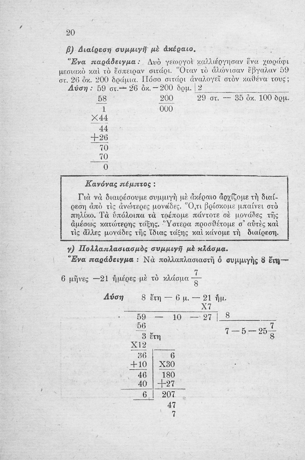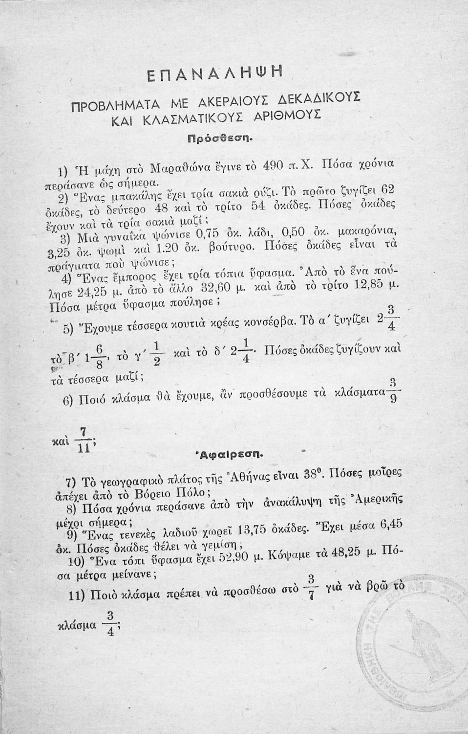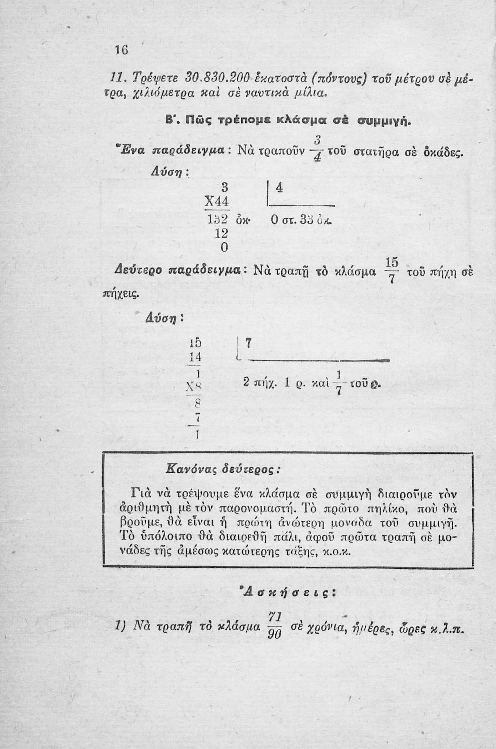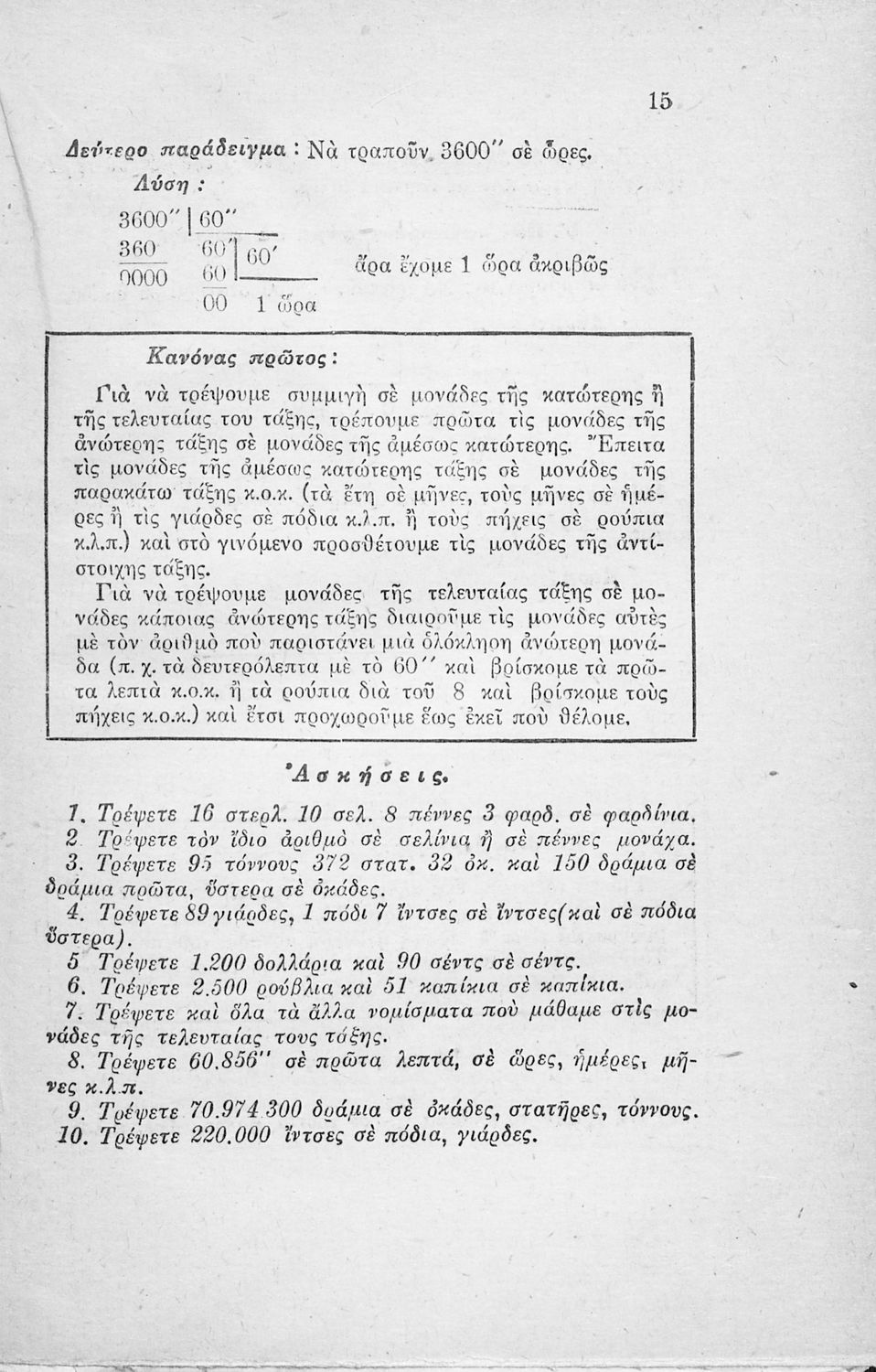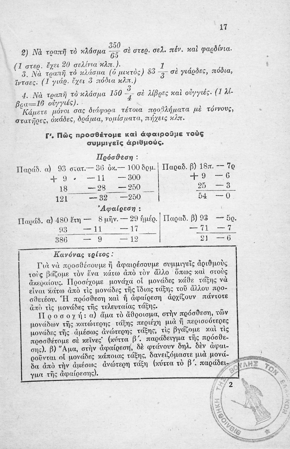 Βαθμίδα εκπαίδευσης: Πρωτοβάθμια Τάξη: ΣΤ' Δημοτικού Μάθημα: Μαθηματικά Γλώσσα: Απλή καθαρεύουσα Παρουσίαση περιεχομένου: Μαθητικό βοήθημα Αριθμητικής ΣΤ΄ Δημοτικού που εστιάζει στις αριθμητικές πράξεις με συμμιγείς αριθμούς, τη μέθοδο των τριών και την αναγωγή στη μονάδα. |