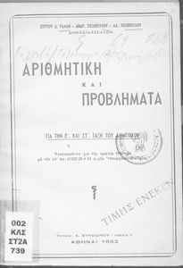 Κωδικός αναγνώρισης: 03-20560654 Τίτλος: Αριθμητική και Προβλήματα για την Ε ́ και ΣΤ ́ τάξη του Δημοτικού Συγγραφέας: Σπυρίδων Ράλλης, Ανδρέας Τοξόπουλος, Αδαμ. Τοξόπουλος Μέγεθος και υπόστρωμα: Μαθητικό βοήθημα, μαλακό εξώφυλλο, 128 σελίδες. |