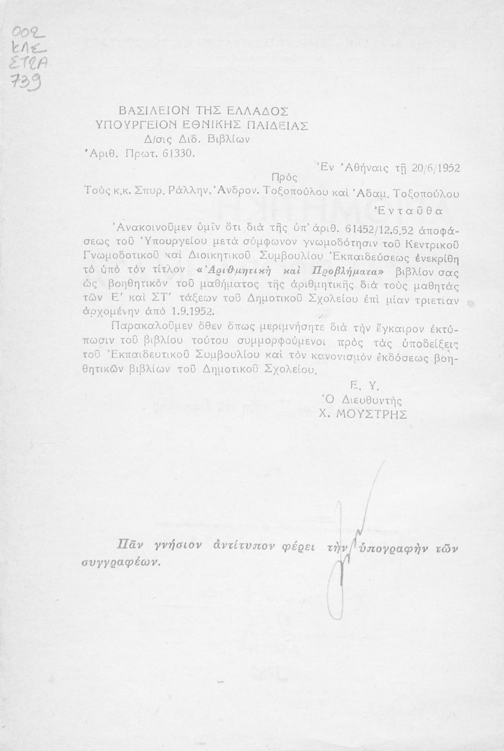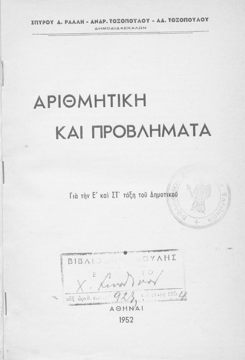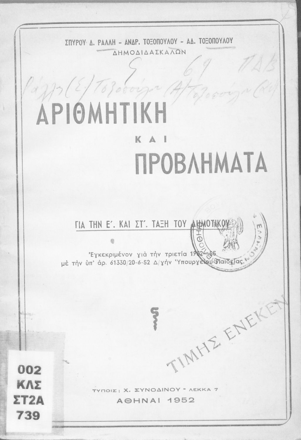 Εκδότης: Χ. Συνοδινός Έτος έκδοσης: 1952 Τόπος έκδοσης: Αθήνα Υπουργική απόφαση / Σύμβαση: 61330/20/6/1952 Έτος έγκρισης: 1952 |