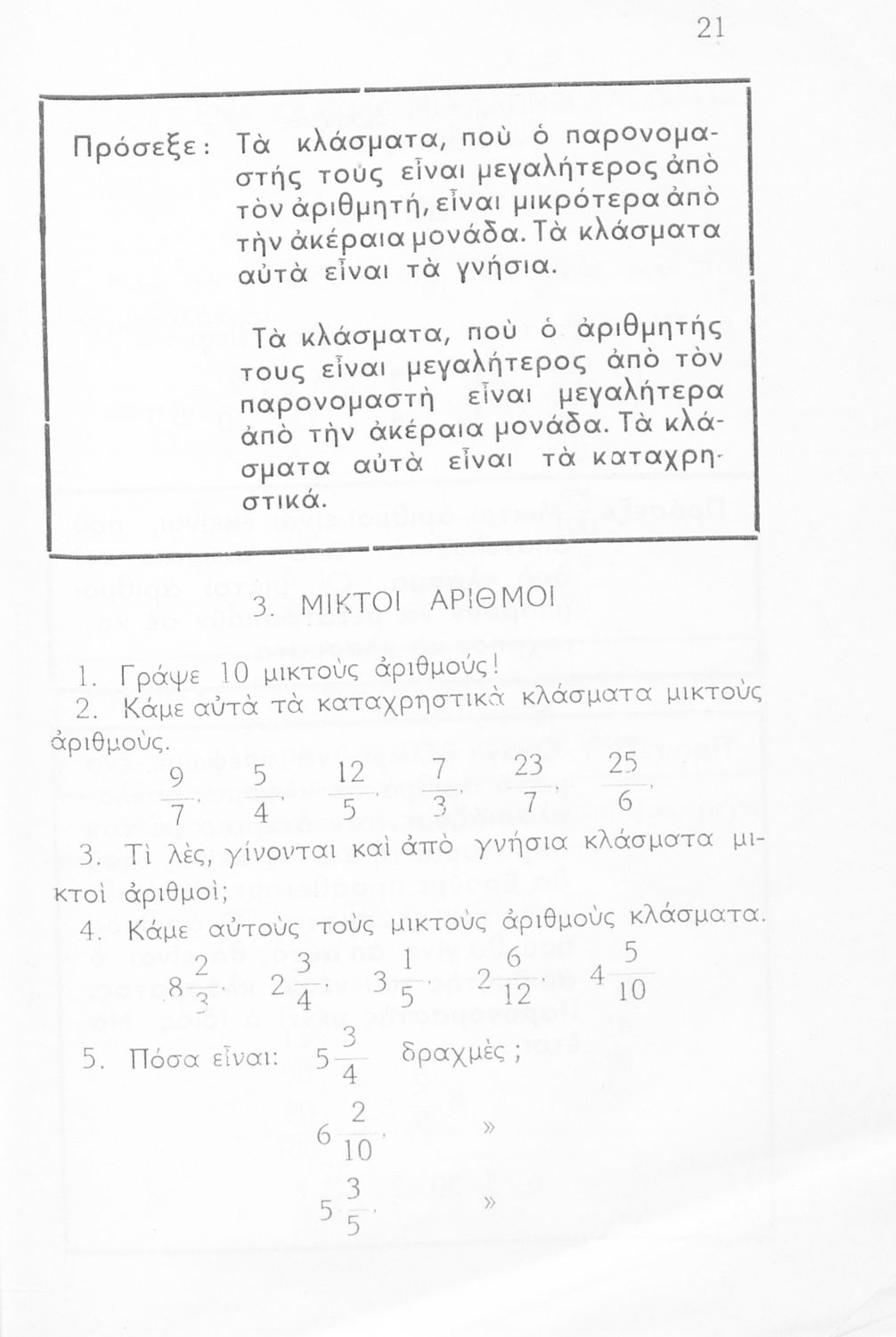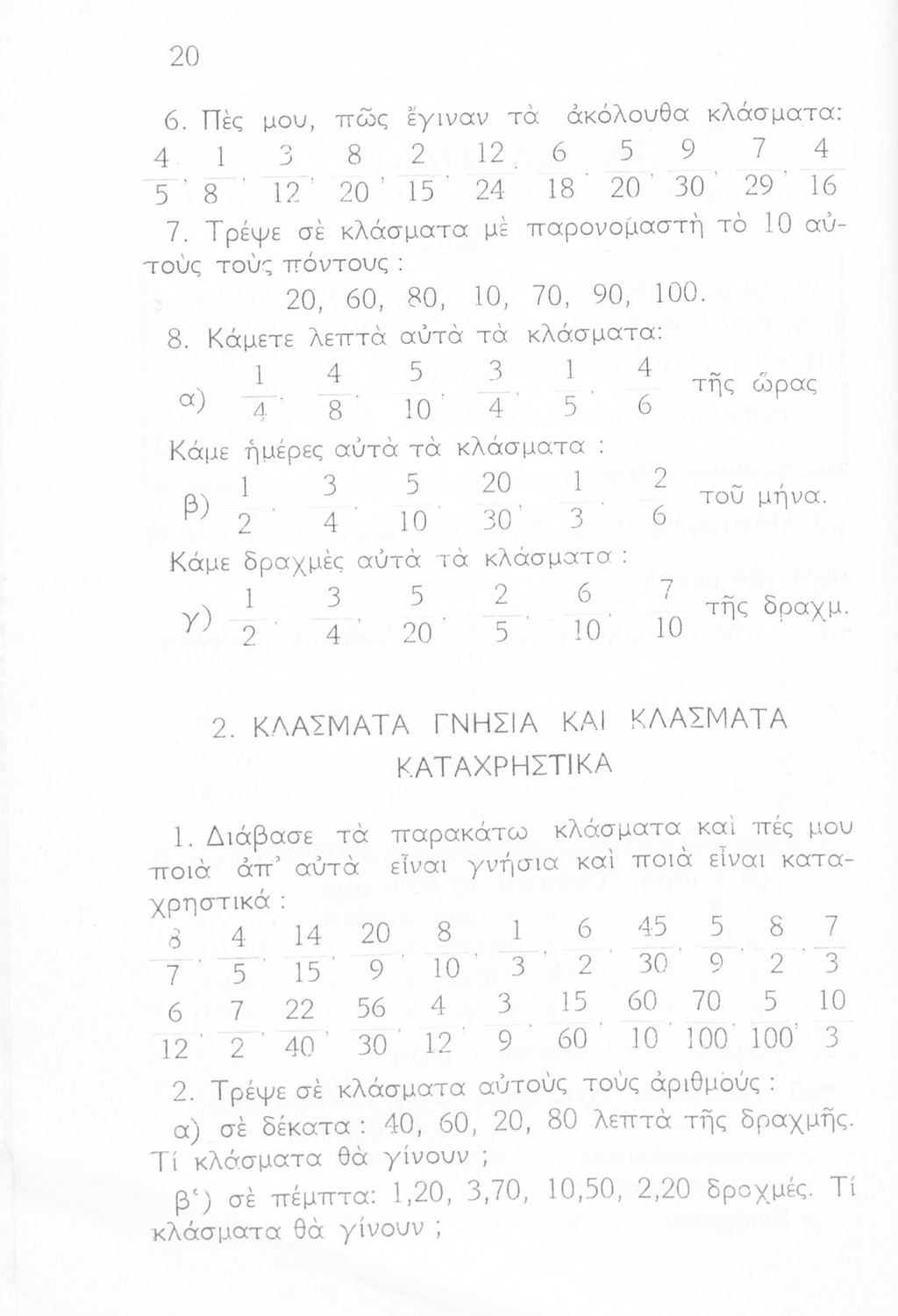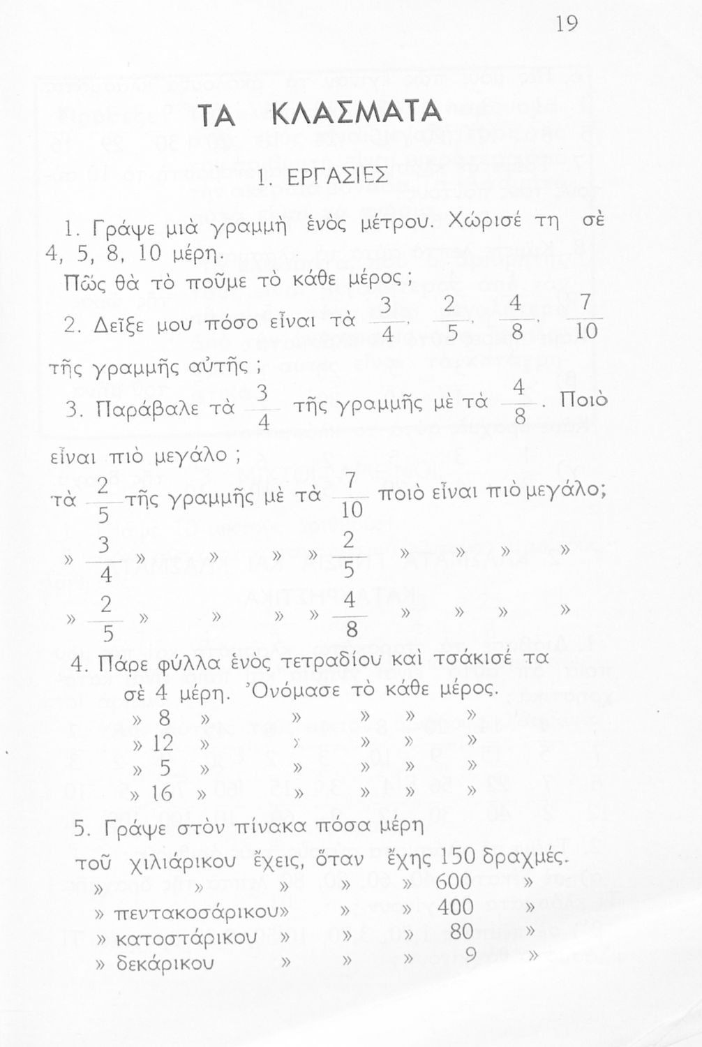 Σχολικό εγχειρίδιο Αριθμητικής Ε΄ Δημοτικού που αναφέρεται αποκλειστικά στα κλάσματα και περιέχει μόνο ασκήσεις.