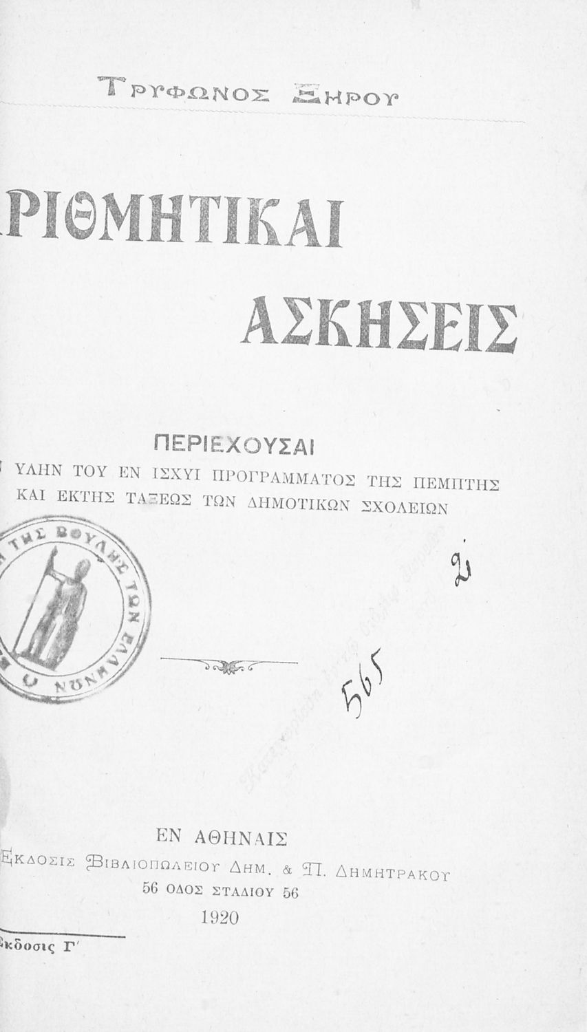 Τίτλος: Αριθμητικαί Ασκήσεις, Περιέχουσαι την ύλην του εν ισχύι προγράμματος της Πέμπτης και Έκτης τάξεως των Δημοτικών Σχολείων