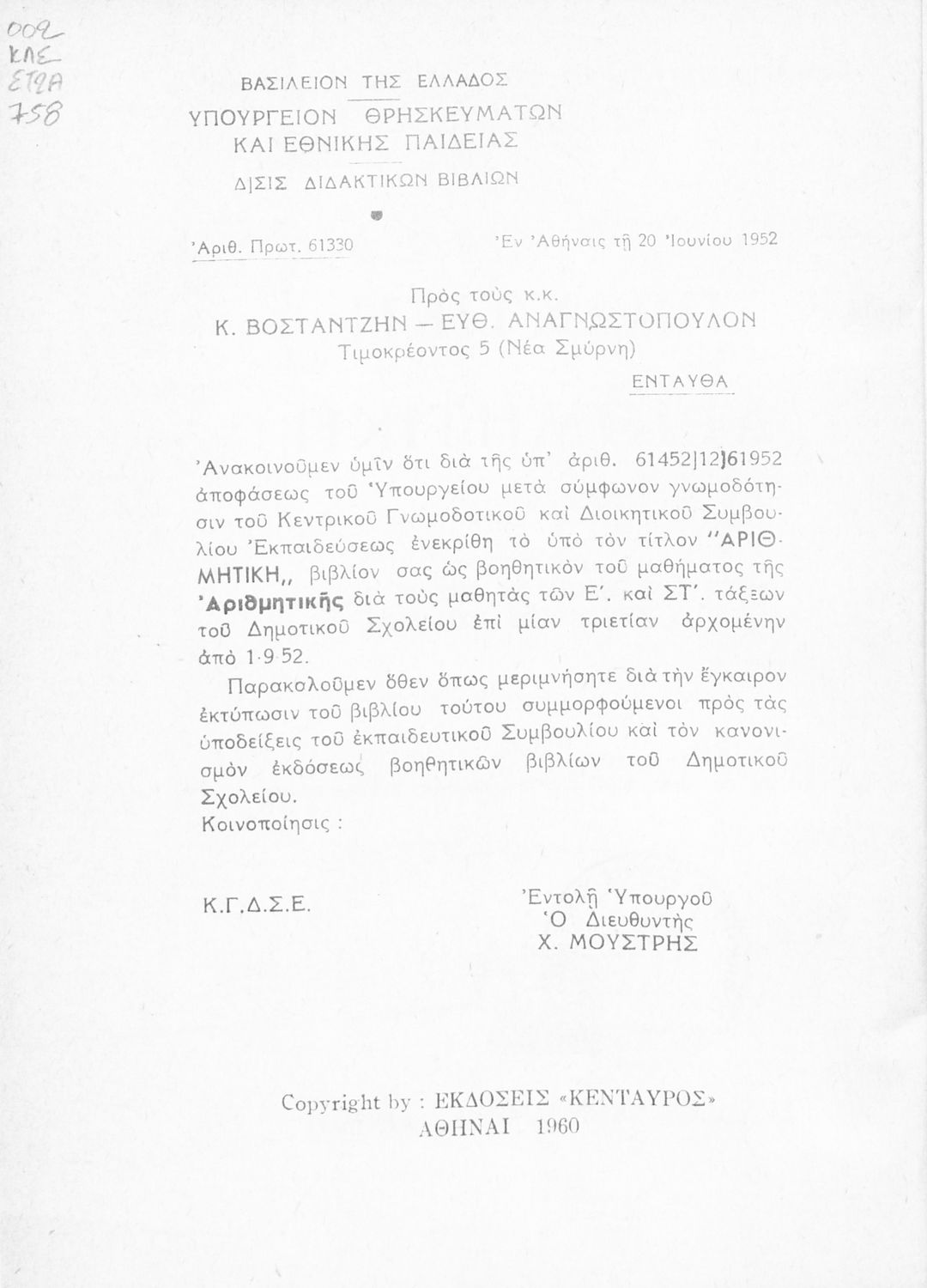 Εκδότης: Κένταυρος Έτος έκδοσης: 1959 Τόπος έκδοσης: Αθήνα Υπουργική απόφαση / Σύμβαση: 61452/12-6-1952 Έτος έγκρισης: 1959 |