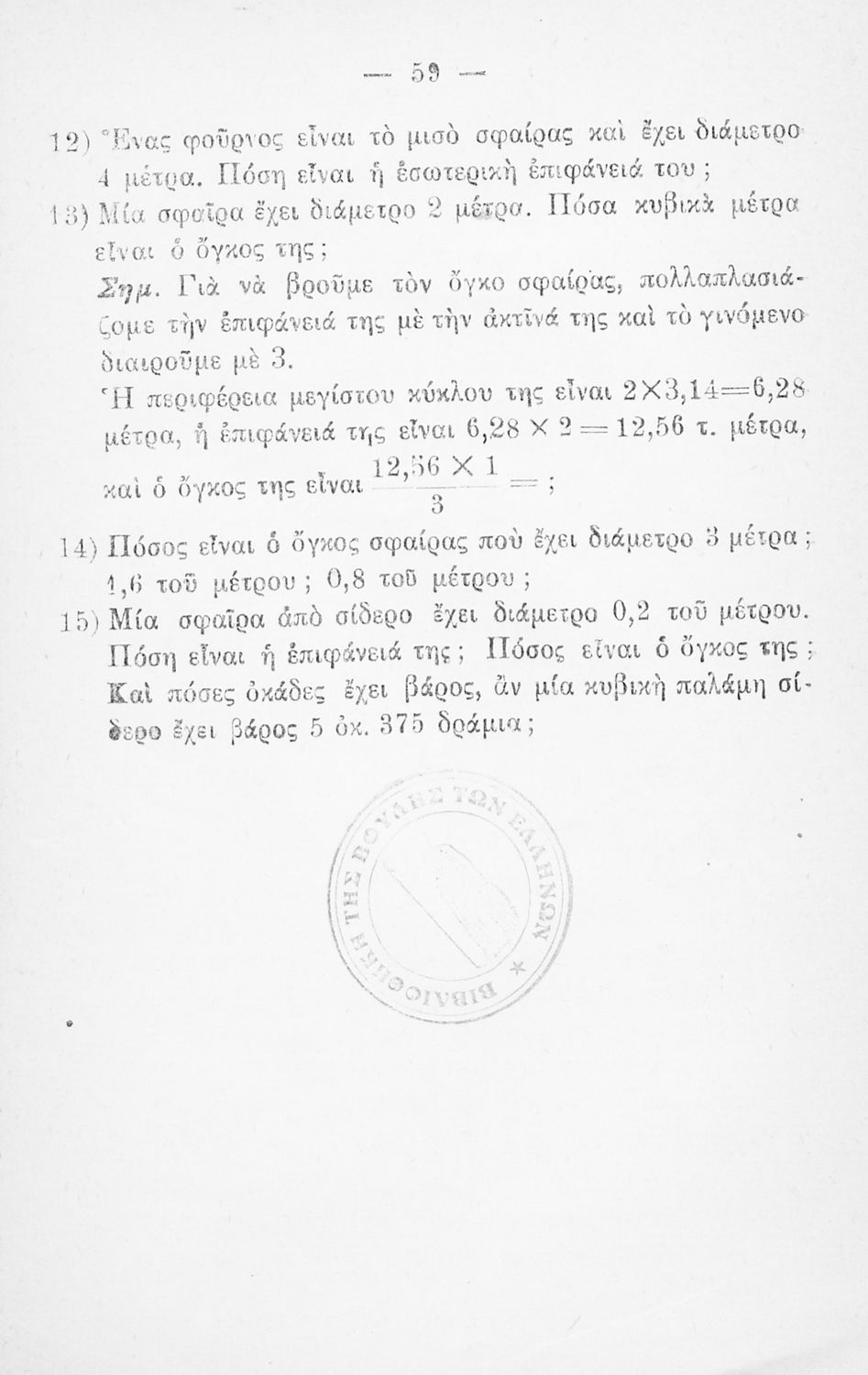 Βαθμίδα εκπαίδευσης: Πρωτοβάθμια Τάξη: ΣΤ' Δημοτικού Μάθημα: Μαθηματικά Γλώσσα: Καθαρεύουσα Παρουσίαση περιεχομένου: Σχολικό εγχειρίδιο Μαθηματικών ΣΤ΄ Δημοτικού που περιλαμβάνει ασκήσεις λογιστικού χαρακτήρα και ασκήσεις μέτρησης γεωμετρικών σχημάτων. |