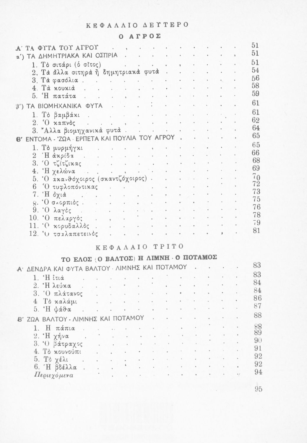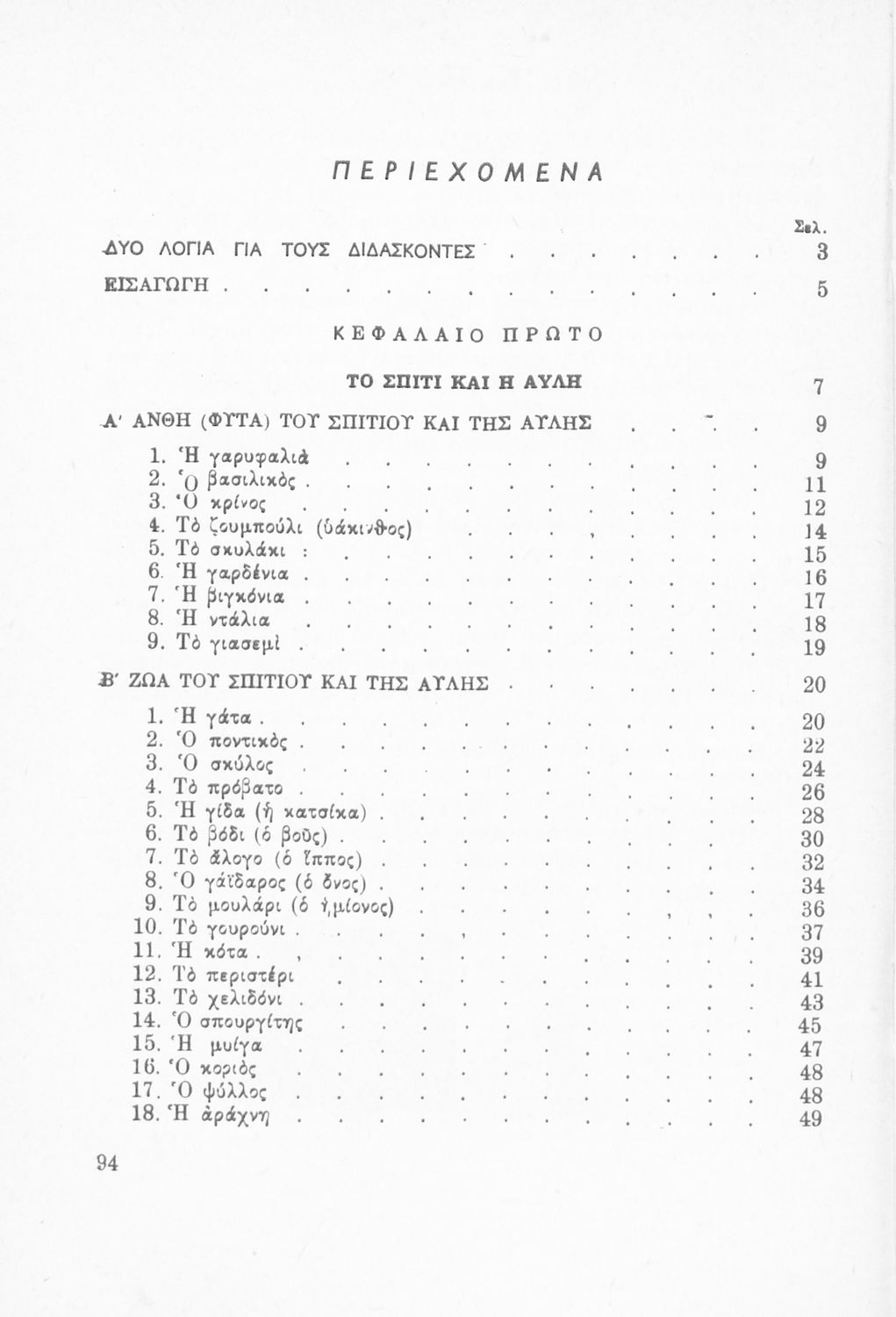 Μαθητικό βοήθημα Ζωολογίας-Φυτολογίας για τους μαθητές της Γ' Δημοτικού. Παρουσιάζει τα βασικά είδη φυτών και ζώων. Το βιβλίο είναι χωρισμένο σε τρία μέρη αρχίζοντας από τα ζώα του σπιτιού και της αυλής, συνεχίζει με ζώα του αγρού και ζώα των λιμνών και ποταμών.