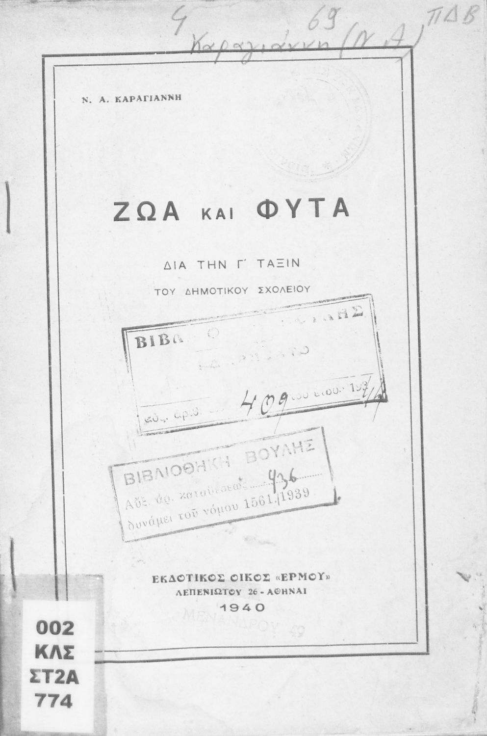Τίτλος: Ζώα και φυτά δια την Γ΄ τάξιν του Δημοτικού Σχολείου