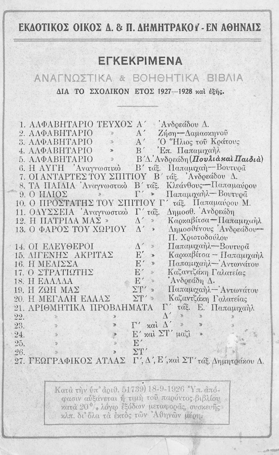 Αναγνωστικό του Δημοτικού. Περιέχει κείμενα της Γαλάτειας Καζαντζάκη. Στο τέλος του βιβλίου υπάρχουν καλλιγραφικά υποδείγματα από το Αναγνωσματάριο του Δημοσθένη Ανδρεάδη.