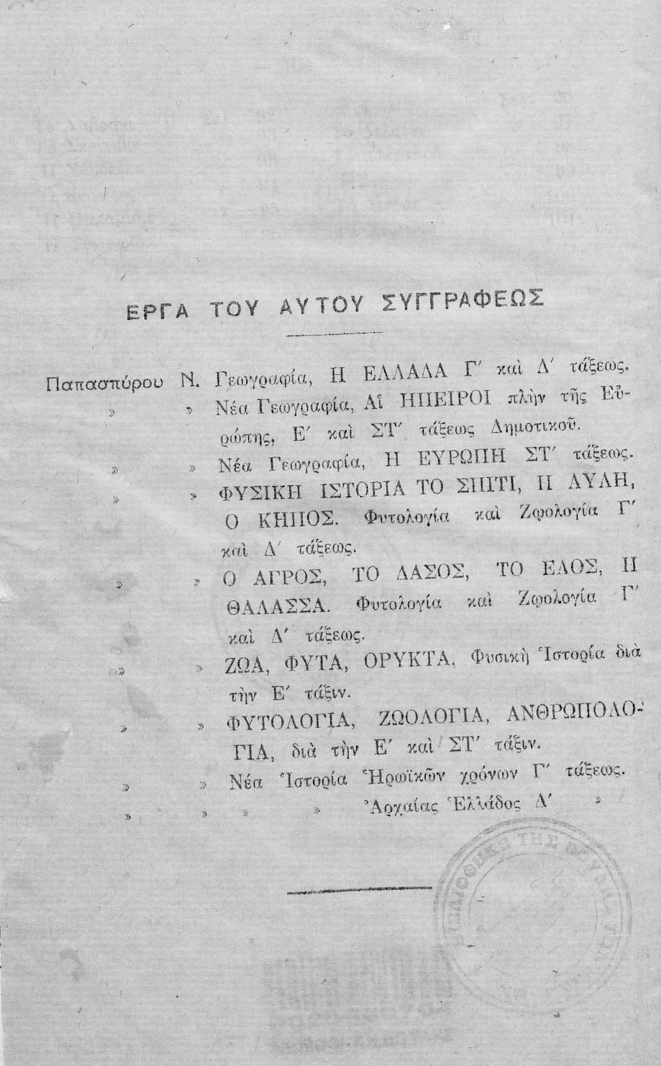 Τίτλος: Ο αγρός -το δάσος-το έλος-η θάλασσα. Φυτολογία και Ζωολογία. Δια την Τετάρτη Τάξιν του Δημοτικού και το Δεύτερον έτος συνδιδασκαλίας Γ' και Δ'