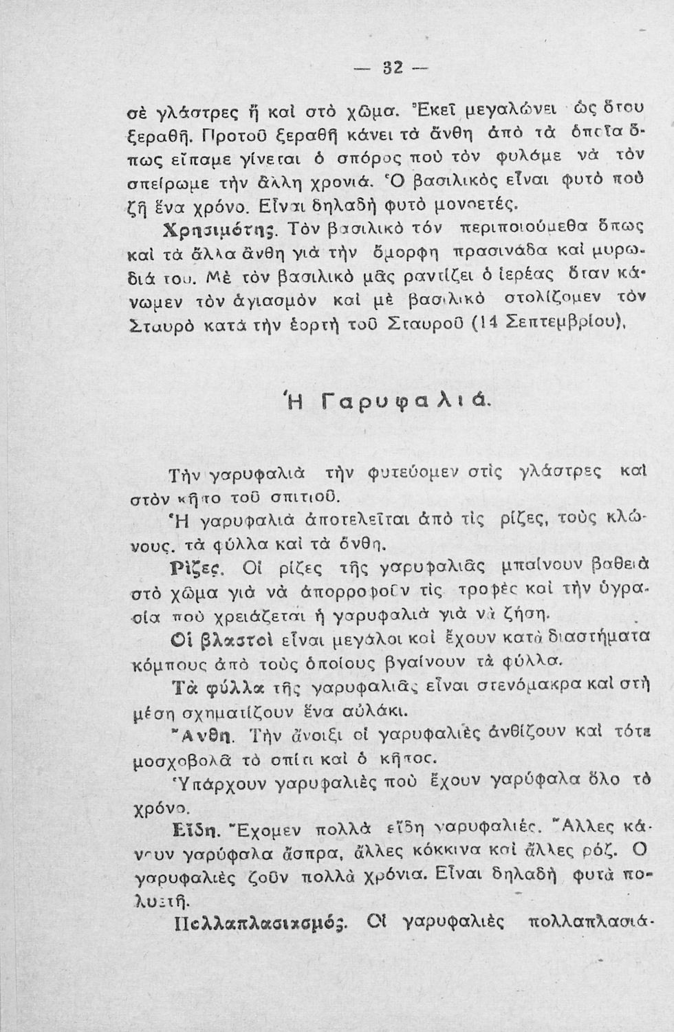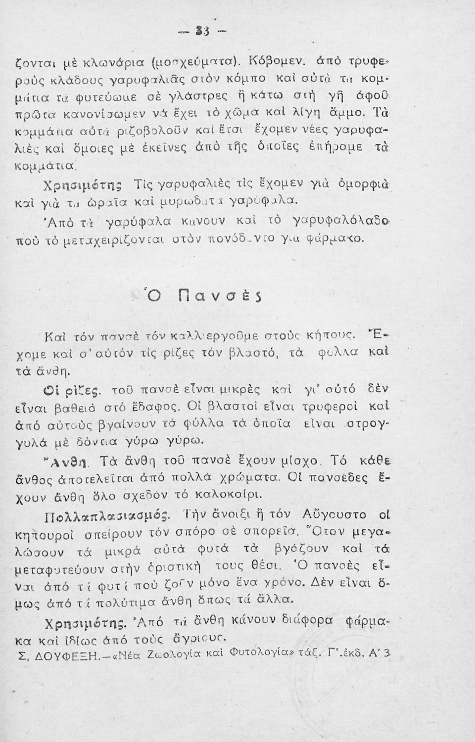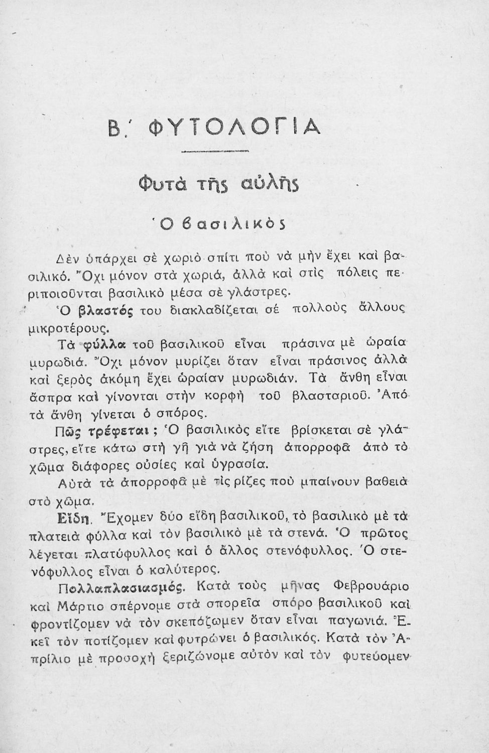 Το σύγγραμμα ήταν σχολικό εγχειρίδιο για το μάθημα της Φυσικής ιστορίας της Δ΄ Δημοτικού. Περιέχει βασικές γνώσεις φυτολογίας, ζωολογίας, βοτανικής. Οι πληροφορίες, οι οποίες δίνονται αφορούν την οικιακή ζωή.