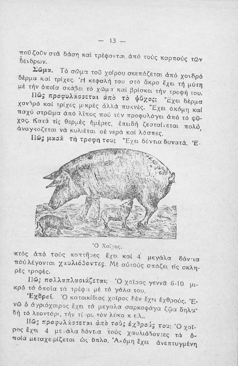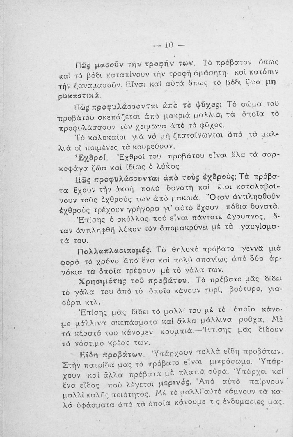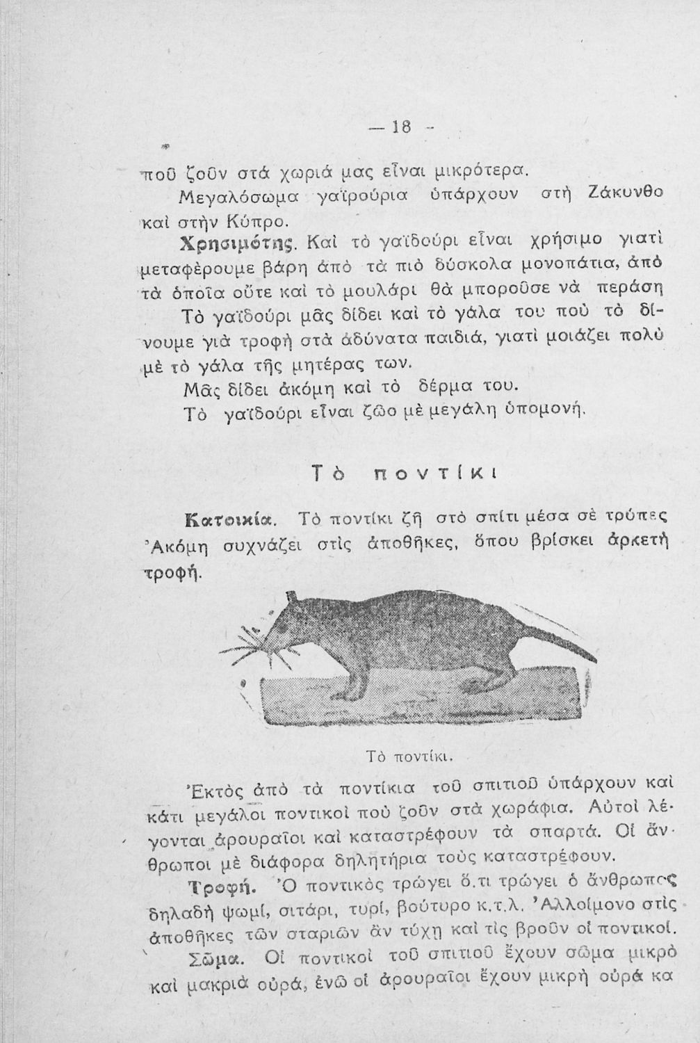 Το σύγγραμμα ήταν σχολικό εγχειρίδιο για το μάθημα της Φυσικής ιστορίας της Δ΄ Δημοτικού. Περιέχει βασικές γνώσεις φυτολογίας, ζωολογίας, βοτανικής. Οι πληροφορίες, οι οποίες δίνονται αφορούν την οικιακή ζωή.