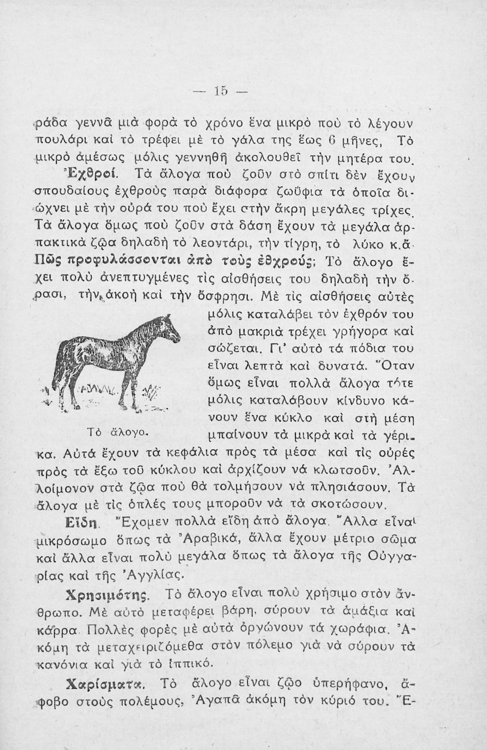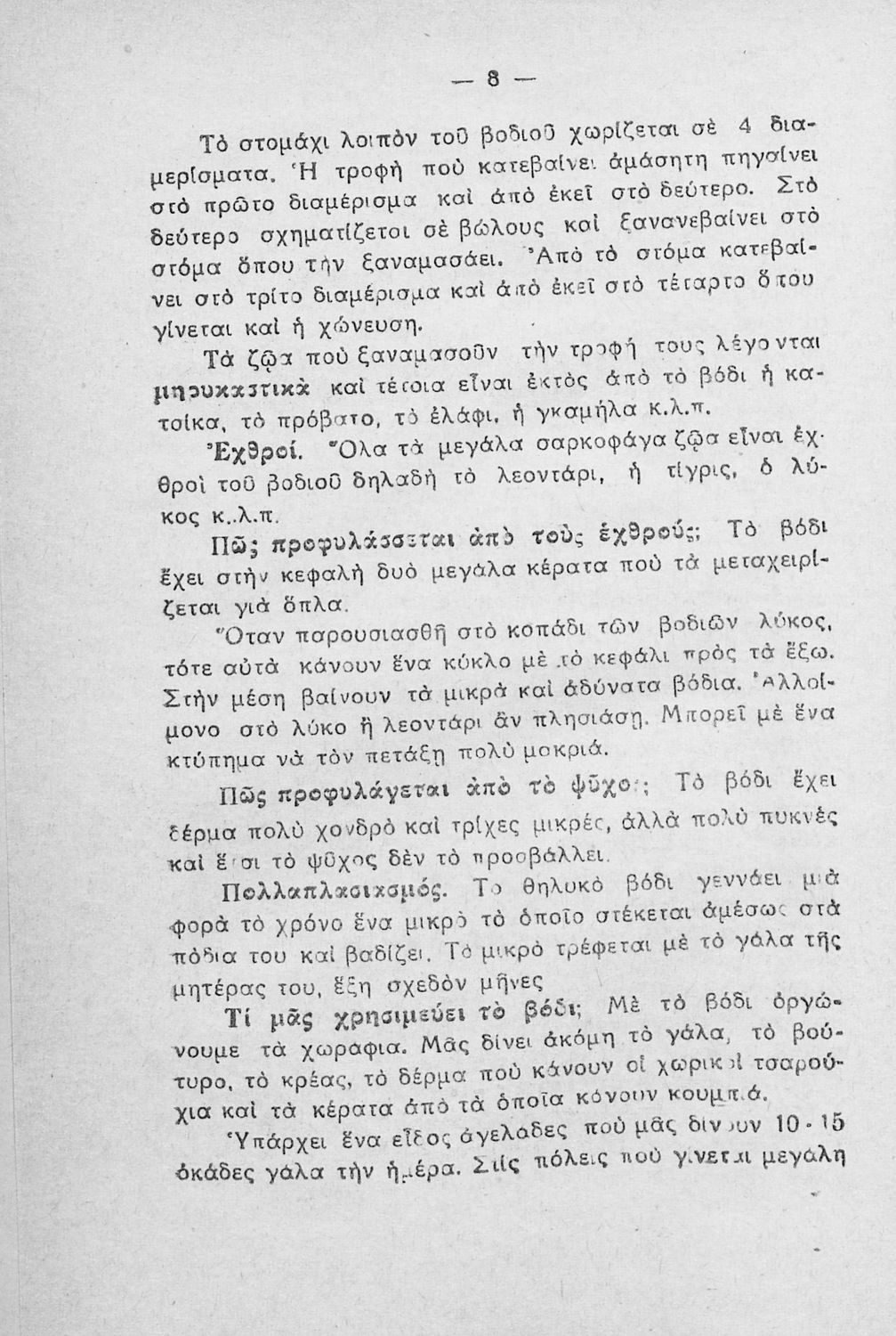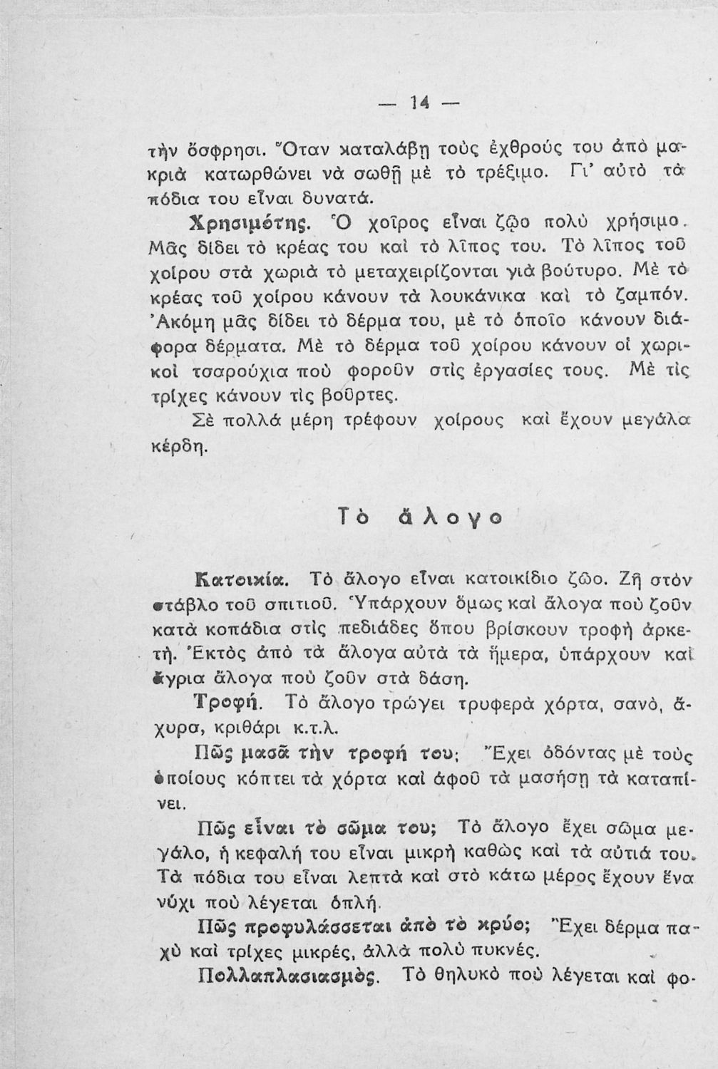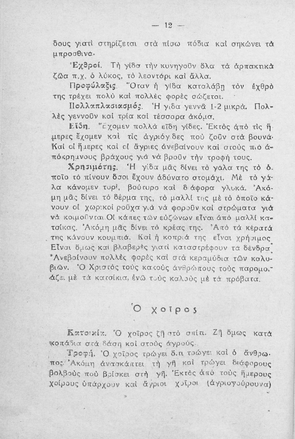 Το σύγγραμμα ήταν σχολικό εγχειρίδιο για το μάθημα της Φυσικής ιστορίας της Δ΄ Δημοτικού. Περιέχει βασικές γνώσεις φυτολογίας, ζωολογίας, βοτανικής. Οι πληροφορίες, οι οποίες δίνονται αφορούν την οικιακή ζωή.