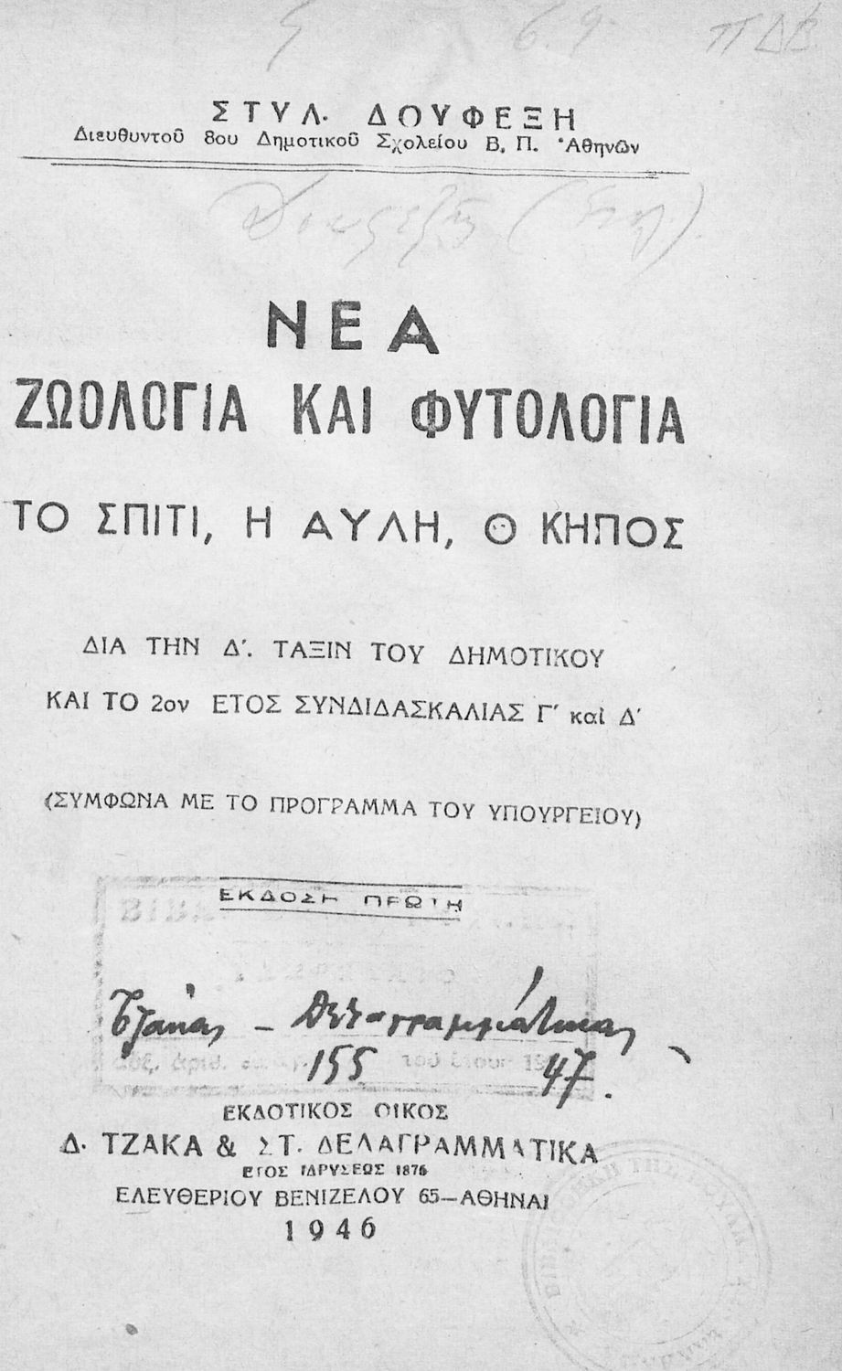 Τίτλος: Νέα Ζωολογία και Φυτολογία, το σπίτι, η αυλή, ο κήπος. Δια την Δ' τάξιν του Δημοτικού