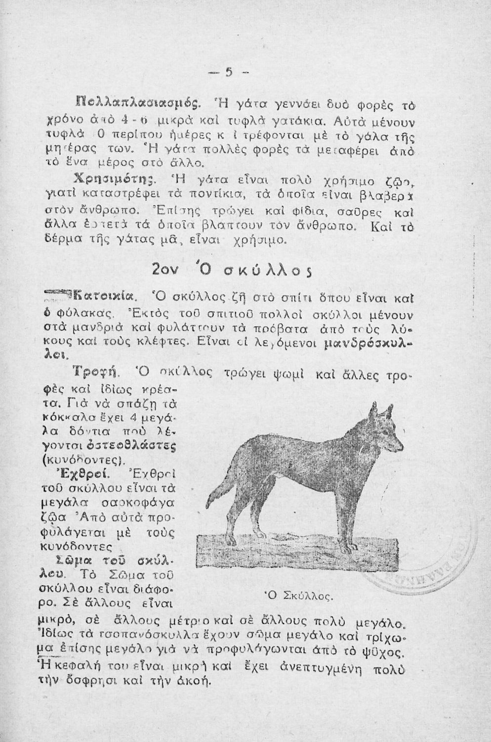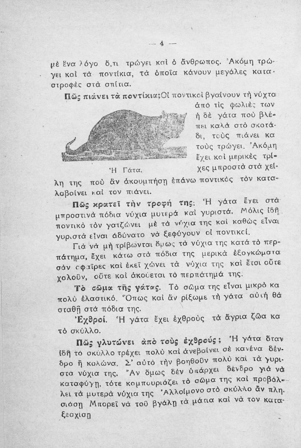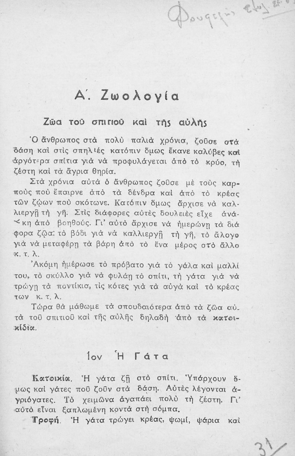 Παρουσίαση περιεχομένου: Το σύγγραμμα ήταν σχολικό εγχειρίδιο για το μάθημα της Φυσικής ιστορίας της Δ΄ Δημοτικού. Περιέχει βασικές γνώσεις φυτολογίας, ζωολογίας, βοτανικής. Οι πληροφορίες, οι οποίες δίνονται αφορούν την οικιακή ζωή.
