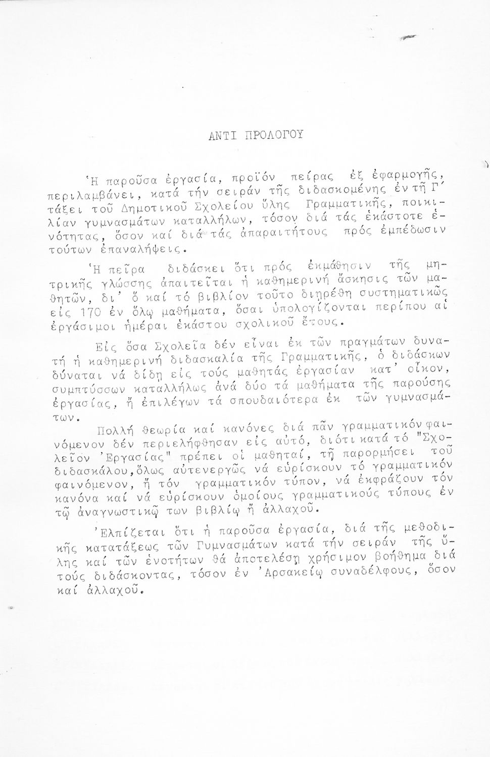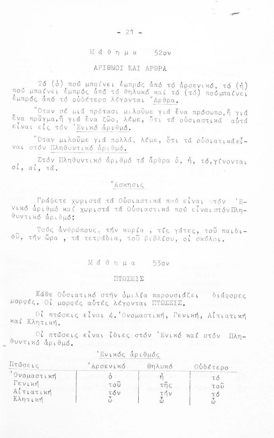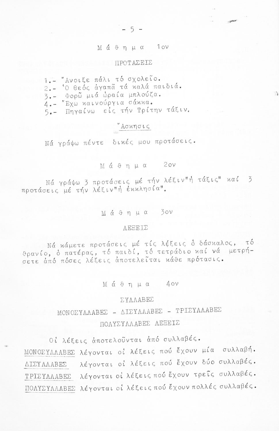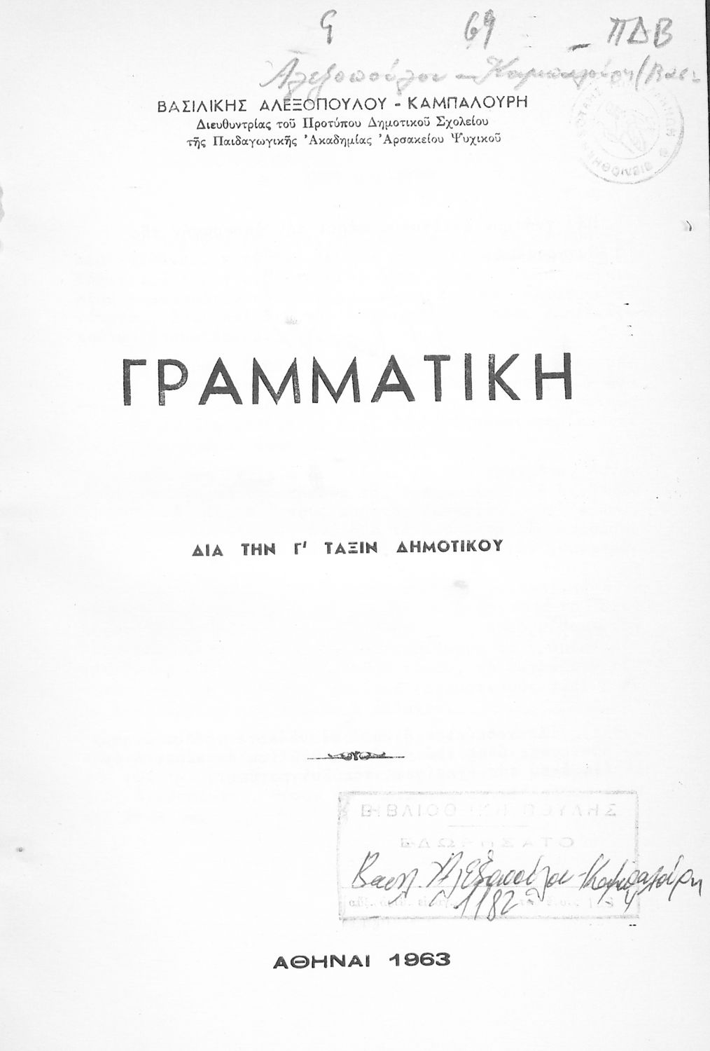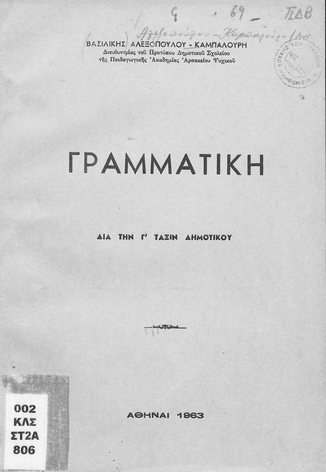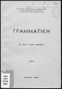 Βαθμίδα εκπαίδευσης: Πρωτοβάθμια Τάξη: Γ' Δημοτικού Μάθημα: Νέα Ελληνικά Γλώσσα: Καθαρεύουσα Παρουσίαση περιεχομένου: Σχολικό εγχειρίδιο Γλώσσας Γ΄ Δημοτικού που περιλαμβάνει το φωνητικό-φθογγολογικό, το τυπικό-τυπολογικό και το παραγωγικό μέρος της γραμματικής της δημοτικής. |